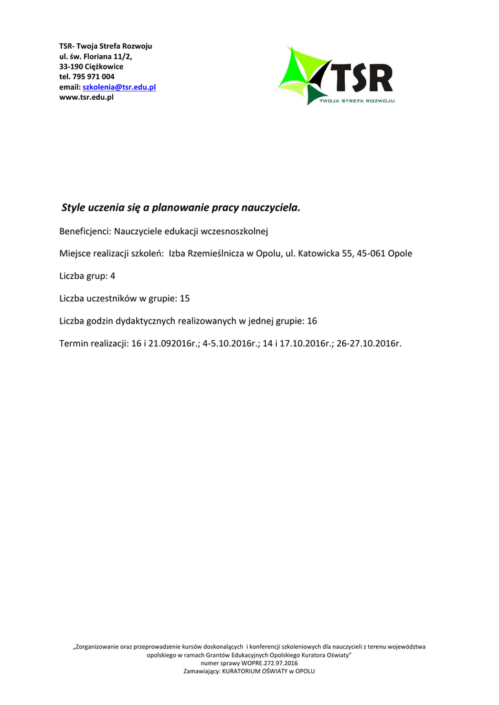 TSR- Twoja Strefa Rozwoju ul. św. Floriana 11/2, 33-190 Ciężkowice tel. 795 971 004 email: [email protected] www.tsr.edu.pl Style uczenia się a planowanie pracy nauczyciela. Beneficjenci: Nauczyciele edukacji wczesnoszkolnej Miejsce realizacji szkoleń: Izba Rzemieślnicza w Opolu, ul. Katowicka 55, 45-061 Opole Liczba grup: 4 Liczba uczestników w grupie: 15 Liczba godzin dydaktycznych realizowanych w jednej grupie: 16 Termin realizacji: 16 i 21.092016r.; 4-5.10.2016r.; 14 i 17.10.2016r.; 26-27.10.2016r. „Zorganizowanie oraz przeprowadzenie kursów doskonalących i konferencji szkoleniowych dla nauczycieli z terenu województwa opolskiego w ramach Grantów Edukacyjnych Opolskiego Kuratora Oświaty” numer sprawy WOPRE.272.97.2016 Zamawiający: KURATORIUM OŚWIATY w OPOLU