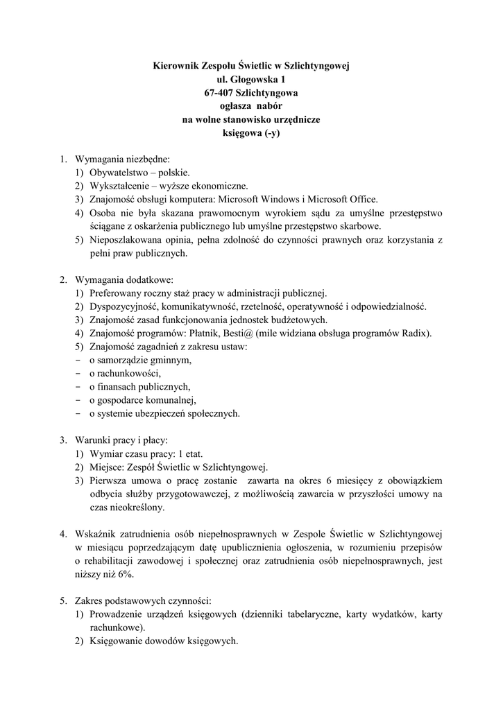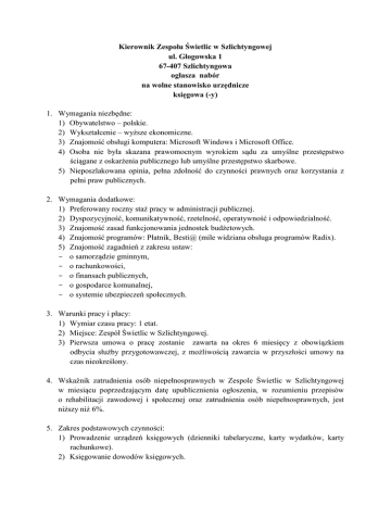 Kierownik Zespołu Świetlic w Szlichtyngowej ul. Głogowska 1 67-407 Szlichtyngowa ogłasza nabór na wolne stanowisko urzędnicze księgowa (-y) 1. Wymagania niezbędne: 1) Obywatelstwo – polskie. 2) Wykształcenie – wyższe ekonomiczne. 3) Znajomość obsługi komputera: Microsoft Windows i Microsoft Office. 4) Osoba nie była skazana prawomocnym wyrokiem sądu za umyślne przestępstwo ściągane z oskarżenia publicznego lub umyślne przestępstwo skarbowe. 5) Nieposzlakowana opinia, pełna zdolność do czynności prawnych oraz korzystania z pełni praw publicznych. 2. Wymagania dodatkowe: 1) Preferowany roczny staż pracy w administracji publicznej. 2) Dyspozycyjność, komunikatywność, rzetelność, operatywność i odpowiedzialność. 3) Znajomość zasad funkcjonowania jednostek budżetowych. 4) Znajomość programów: Płatnik, Besti@ (mile widziana obsługa programów Radix). 5) Znajomość zagadnień z zakresu ustaw: - o samorządzie gminnym, - o rachunkowości, - o finansach publicznych, - o gospodarce komunalnej, - o systemie ubezpieczeń społecznych. 3. Warunki pracy i płacy: 1) Wymiar czasu pracy: 1 etat. 2) Miejsce: Zespół Świetlic w Szlichtyngowej. 3) Pierwsza umowa o pracę zostanie zawarta na okres 6 miesięcy z obowiązkiem odbycia służby przygotowawczej, z możliwością zawarcia w przyszłości umowy na czas nieokreślony. 4. Wskaźnik zatrudnienia osób niepełnosprawnych w Zespole Świetlic w Szlichtyngowej w miesiącu poprzedzającym datę upublicznienia ogłoszenia, w rozumieniu przepisów o rehabilitacji zawodowej i społecznej oraz zatrudnienia osób niepełnosprawnych, jest niższy niż 6%. 5. Zakres podstawowych czynności: 1) Prowadzenie urządzeń księgowych (dzienniki tabelaryczne, karty wydatków, karty rachunkowe). 2) Księgowanie dowodów księgowych. 3) Dekretowanie dowodów księgowych. 4) Uzgadnianie sald urządzeń księgowych z wyciągami bankowymi. 5) Sporządzanie przelewów. 6) Sporządzanie sprawozdań. 7) Sporządzanie planów budżetu. 8) Obsługa programów płacowo-kadrowych. 9) Prowadzenie rozliczeń z ZUS i z Urzędem Skarbowym. 10) Naliczanie płac. 6. Wymagane dokumenty: 1) List motywacyjny. 2) życiorys (CV). 3) Kserokopie dokumentów potwierdzających posiadane wykształcenie. 4) Kserokopie dokumentów potwierdzających staż pracy. 5) Kserokopie dokumentów potwierdzających dodatkowe kwalifikacje (kursy, szkolenia, certyfikaty). 6) Kserokopia dowodu osobistego. 7) Oświadczenie kandydata o korzystaniu z pełni praw publicznych. 8) Oświadczenie kandydata o niekaralności za przestępstwa umyślne (w przypadku zatrudnienia wymagane będzie zaświadczenie z Krajowego Rejestru Skazanych). 9) Oświadczenie kandydata o stanie zdrowia pozwalającym na zatrudnienie na określonym stanowisku (w przypadku zatrudnienia, kandydat zostanie skierowany na badania lekarskie wstępne do wskazanego lekarza medycyny pracy). W przypadku zatrudnienia kandydat zobowiązany będzie do przedłożenia do wglądu pracodawcy oryginały dokumentów. 7. Termin, sposób i miejsce składania dokumentów aplikacyjnych: 1) Oferty prosimy składać w terminie do 29 maja 2012 r. 2) Oferty złożone po wskazanym terminie nie będą rozpatrywane. 3) Oferty prosimy składać osobiście w godzinach pracy Zespołu (od 7:30 do 15:30) w zamkniętych kopertach (z podanym adresem zwrotnym) z dopiskiem „Nabór na stanowisko księgowej (-ego) Zespołu Świetlic w Szlichtyngowej” lub listem poleconym. 4) Prosimy także o dopisanie klauzuli: „Wyrażam zgodę na przetwarzanie moich danych osobowych zawartych w ofercie pracy dla potrzeb niezbędnych do realizacji rekrutacji (zgodnie z ustawą z dnia 29 sierpnia 1997 r. o ochronie danych osobowych – Dz. U z 2002 r. Nr 101, poz.926 ze zmianami)”. 5) Miejsce składania dokumentów: Urząd Miasta i Gminy w Szlichtyngowej, 67-407 Szlichtyngowa, ul. Rynek 1, sekretariat - pokój Nr 7, I piętro. 8. Informacje dodatkowe: 1) Aplikacje, które wpłyną do Zespołu niekompletne lub nie spełnią wymogów formalnych nie będą rozpatrywane. 2) Lista kandydatów, którzy spełnili wymagania formalne i tym samym zakwalifikowali się do postępowania sprawdzającego zostanie ogłoszona w Biuletynie Informacji Publicznej Urzędu www.bip.szlichtyngowa.pl i na tablicy informacyjnej w Urzędzie Miasta i Gminy w Szlichtyngowej. 3) Kandydaci spełniający wymogi formalne zostaną poinformowani o terminie postępowania sprawdzającego. 4) Informacja o wyniku naboru będzie ogłoszona w Biuletynie Informacji Publicznej Urzędu www.bip.szlichtyngowa.pl oraz wywieszona na tablicy informacyjnej w Urzędzie. 5) Dokumenty aplikacyjne kandydatów, którzy się nie zakwalifikowali do postępowania sprawdzającego zostaną odesłane pocztą. Szlichtyngowa, dnia 18 maja 2012 r. p. o. Kierownika Zespołu Świetlic w Szlichtyngowej /-/ Jarosław Gnat