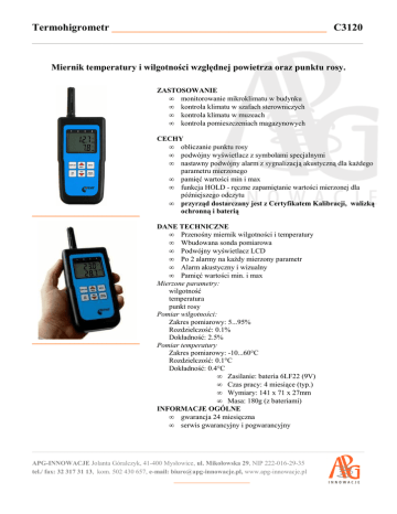 Termohigrometr ______________________________________________ C3120 ______________________________________________________________ Miernik temperatury i wilgotności względnej powietrza oraz punktu rosy. ZASTOSOWANIE • monitorowanie mikroklimatu w budynku • kontrola klimatu w szafach sterowniczych • kontrola klimatu w muzeach • kontrola pomieszczeniach magazynowych _______________________ _______________________ CECHY • obliczanie punktu rosy • podwójny wyświetlacz z symbolami specjalnymi • nastawny podwójny alarm z sygnalizacją akustyczną dla każdego parametru mierzonego • pamięć wartości min i max • funkcja HOLD - ręczne zapamiętanie wartości mierzonej dla późniejszego odczytu • przyrząd dostarczany jest z Certyfikatem Kalibracji, walizką ochronną i baterią DANE TECHNICZNE • Przenośny miernik wilgotności i temperatury • Wbudowana sonda pomiarowa • Podwójny wyświetlacz LCD • Po 2 alarmy na każdy mierzony parametr • Alarm akustyczny i wizualny • Pamięć wartości min. i max Mierzone parametry: wilgotność temperatura punkt rosy Pomiar wilgotności: Zakres pomiarowy: 5...95% Rozdzielczość: 0.1% Dokładność: 2.5% Pomiar temperatury Zakres pomiarowy: -10...60°C Rozdzielczość: 0.1°C Dokładność: 0.4°C • Zasilanie: bateria 6LF22 (9V) • Czas pracy: 4 miesiące (typ.) • Wymiary: 141 x 71 x 27mm • Masa: 180g (z bateriami) INFORMACJE OGÓLNE • gwarancja 24 miesięczna • serwis gwarancyjny i pogwarancyjny ___________________________________________________________________________________ APG-INNOWACJE Jolanta Góralczyk, 41-400 Mysłowice, ul. Mikołowska 29, NIP 222-016-29-35 tel./ fax: 32 317 31 13, kom. 502 430 657, e-mail: [email protected], www.apg-innowacje.pl ___________________
