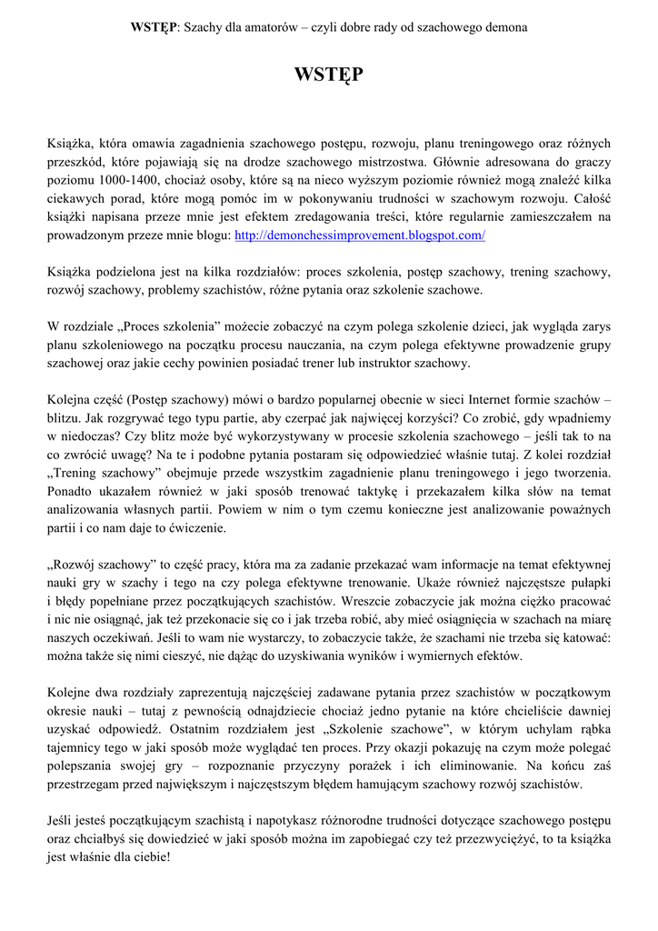 WSTĘP: Szachy dla amatorów – czyli dobre rady od szachowego demona WSTĘP Książka, która omawia zagadnienia szachowego postępu, rozwoju, planu treningowego oraz różnych przeszkód, które pojawiają się na drodze szachowego mistrzostwa. Głównie adresowana do graczy poziomu 1000-1400, chociaż osoby, które są na nieco wyższym poziomie również mogą znaleźć kilka ciekawych porad, które mogą pomóc im w pokonywaniu trudności w szachowym rozwoju. Całość książki napisana przeze mnie jest efektem zredagowania treści, które regularnie zamieszczałem na prowadzonym przeze mnie blogu: http://demonchessimprovement.blogspot.com/ Książka podzielona jest na kilka rozdziałów: proces szkolenia, postęp szachowy, trening szachowy, rozwój szachowy, problemy szachistów, różne pytania oraz szkolenie szachowe. W rozdziale „Proces szkolenia” możecie zobaczyć na czym polega szkolenie dzieci, jak wygląda zarys planu szkoleniowego na początku procesu nauczania, na czym polega efektywne prowadzenie grupy szachowej oraz jakie cechy powinien posiadać trener lub instruktor szachowy. Kolejna część (Postęp szachowy) mówi o bardzo popularnej obecnie w sieci Internet formie szachów – blitzu. Jak rozgrywać tego typu partie, aby czerpać jak najwięcej korzyści? Co zrobić, gdy wpadniemy w niedoczas? Czy blitz może być wykorzystywany w procesie szkolenia szachowego – jeśli tak to na co zwrócić uwagę? Na te i podobne pytania postaram się odpowiedzieć właśnie tutaj. Z kolei rozdział „Trening szachowy” obejmuje przede wszystkim zagadnienie planu treningowego i jego tworzenia. Ponadto ukazałem również w jaki sposób trenować taktykę i przekazałem kilka słów na temat analizowania własnych partii. Powiem w nim o tym czemu konieczne jest analizowanie poważnych partii i co nam daje to ćwiczenie. „Rozwój szachowy” to część pracy, która ma za zadanie przekazać wam informacje na temat efektywnej nauki gry w szachy i tego na czy polega efektywne trenowanie. Ukaże również najczęstsze pułapki i błędy popełniane przez początkujących szachistów. Wreszcie zobaczycie jak można ciężko pracować i nic nie osiągnąć, jak też przekonacie się co i jak trzeba robić, aby mieć osiągnięcia w szachach na miarę naszych oczekiwań. Jeśli to wam nie wystarczy, to zobaczycie także, że szachami nie trzeba się katować: można także się nimi cieszyć, nie dążąc do uzyskiwania wyników i wymiernych efektów. Kolejne dwa rozdziały zaprezentują najczęściej zadawane pytania przez szachistów w początkowym okresie nauki – tutaj z pewnością odnajdziecie chociaż jedno pytanie na które chcieliście dawniej uzyskać odpowiedź. Ostatnim rozdziałem jest „Szkolenie szachowe”, w którym uchylam rąbka tajemnicy tego w jaki sposób może wyglądać ten proces. Przy okazji pokazuję na czym może polegać polepszania swojej gry – rozpoznanie przyczyny porażek i ich eliminowanie. Na końcu zaś przestrzegam przed największym i najczęstszym błędem hamującym szachowy rozwój szachistów. Jeśli jesteś początkującym szachistą i napotykasz różnorodne trudności dotyczące szachowego postępu oraz chciałbyś się dowiedzieć w jaki sposób można im zapobiegać czy też przezwyciężyć, to ta książka jest właśnie dla ciebie!