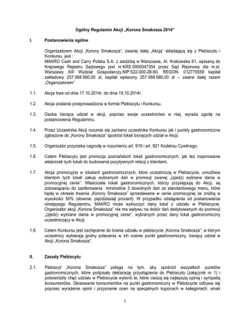 Ogólny Regulamin Akcji „Korona Smakosza 2014” I. Postanowienia ogólne Organizatorem Akcji „Korony Smakosza”, zwanej dalej „Akcją” składającą się z Plebiscytu i Konkursu, jest : MAKRO Cash and Carry Polska S.A. z siedzibą w Warszawie, Al. Krakowska 61, wpisaną do Krajowego Rejestru Sądowego pod nr KRS 0000047354 przez Sąd Rejonowy dla m.st. Warszawy XIII Wydział Gospodarczy,NIP:522-000-28-60, REGON: 012775559 kapitał zakładowy 257 068 680,00 zł, kapitał wpłacony 257 068 680,00 zł – zwane dalej razem „Organizatorem” 1.1. Akcja trwa od dnia 17.10.2014r. do dnia 19.10.2014r. 1.2. Akcja zostanie przeprowadzona w formie Plebiscytu i Konkursu. 1.3. Osoba biorąca udział w akcji, poprzez swoje uczestnictwo w niej, wyraża zgodę na postanowienia Regulaminu. 1.4. Przez Uczestnika Akcji rozumie się zarówno uczestnika Konkursu jak i punkty gastronomiczne zgłoszone do „Korony Smakosza” spośród lokali biorących udział w Akcji. 1.5. Organizator przyrzeka nagrodę w rozumieniu art. 919 i art. 921 Kodeksu Cywilnego. 1.6. Celem Plebiscytu jest promocja poznańskich lokali gastronomicznych, jak też inspirowanie właścicieli tych lokali do budowania pozytywnych relacji z klientami. 1.7. Akcja promocyjna w lokalach gastronomicznych, które uczestniczą w Plebiscycie, umożliwia klientom tych lokali zakup wybranych dań w promocji zwanej „(zjedz) wybrane dania w promocyjnej cenie”. Właściciele lokali gastronomicznych, którzy przystępują do Akcji, są zobowiązaniu do zaoferowania minimalnie 3 dowolnych dań ze standardowego menu, które będą w okresie trwania „Korony Smakosza” sprzedawane w cenie promocyjnej ze zniżką w wysokości 50% (słownie: pięćdziesiąt procent). W przypadku odstąpienia od postanowienia niniejszego Regulaminu, MAKRO może wykluczyć dany lokal z udziału w Plebiscycie. Organizator akcji „Korona Smakosza” nie ma wpływu na dobór dań dedykowanych do promocji „(zjedz) wybrane dania w promocyjnej cenie”, wybranych przez dany lokal gastronomiczny uczestniczący w Akcji. 1.8. Celem Konkursu jest zachęcenie do brania udziału w plebiscycie „Korona Smakosza”, w którym uczestnicy wybierają godny polecenia w ich ocenie punkt gastronomiczny, biorący udział w Akcji „Korona Smakosza”. II. Zasady Plebiscytu 2.1. Plebiscyt „Korona Smakosza” polega na tym, aby spośród wszystkich punktów gastronomicznych, które podpisały deklarację przystąpienia do Plebiscytu (załącznik nr 1) i potwierdziły chęć udziału w Plebiscycie wyłonić te, które cieszą się najlepszą opinią i sympatią konsumentów. Głosowanie konsumentów na punkt gastronomiczny w Plebiscycie odbywa się poprzez wyrażenie opinii i przyznanie ocen na specjalnych kuponach w kategoriach: smak 1 potraw, wystrój lokalu, jakość obsługi, atmosfera, lokal na spotkania z przyjaciółmi, lokal na rodzinny obiad, lokal na romantyczny wieczór, lokal na lunch, lokal z najlepszą relacją ceny do jakości, lokal z najlepszym daniem regionalnym. 2.2. Warunkiem przystąpienia do Plebiscytu jest wypełnienie i podpisanie deklaracji przystąpienia do Akcji (załącznik nr 1) oraz zaakceptowanie postanowień niniejszego Regulaminu Plebiscytu. W Plebiscycie mogą wziąć udział przedsiębiorcy prowadzący punkty gastronomiczne (restauracje, pizzerie, puby, bary, kawiarnie) na terenie aglomeracji poznańskiej. 2.3. Przez Uczestnika Plebiscytu „Korona Smakosza” rozumie się punkty gastronomiczne, które podpisały deklarację przystąpienia do Akcji (załącznik nr 1). 2.4. Punkty gastronomiczne mogą być zgłaszane do udziału w Plebiscycie od dnia 26.09.2014r. do dnia 08.10.2014r. przez wszystkie osoby spełniające warunki opisane w punkcie poprzedzającym i wyłącznie osoby zaproszone do udziału w Akcji przez Przedstawiciela Handlowego Hali MAKRO w Poznaniu. O terminie decyduje data przekazania wypełnionego kuponu do Organizatora Akcji. 2.5. Każdy lokal gastronomiczny, który przystąpi do Akcji, otrzyma od MAKRO zniżkę promocyjną na wybrane artykuły, obowiązującą tydzień (7 dni): od wtorku do poniedziałku, z założeniem, że wskazany okres obejmuje Akcję „Koronę Smakosza”. Oferta promocyjna zostanie przedstawiona Uczestnikom Plebiscytu za pośrednictwem Przedstawicieli Handlowych MAKRO. 2.6. Dla trzech lokali gastronomicznych, które osiągną największy przyrost obrotowy netto w MAKRO (minimalny wzrost uprawniający do udziału w konkursie jest 5,000tys. (słownie: pięć tysięcy netto- bez zakupów wyrobów tytoniowych)w miesiącu, w którym organizowana jest Akcja w stosunku do analogicznego miesiąca w 2013 r., otrzymają od MAKRO bon towarowy o wartości 500zł brutto (słownie: pięćset złotych) na zakupy produktów marki własnej w MAKRO. Wyłączeni z konkursu są nowi klienci nie posiadający historii sprzedaży w Makro z zeszłego roku. 2.7. Aby zagłosować na punkt gastronomiczny w Plebiscycie należy prawidłowo wypełnić kupon. Kupon będzie do odebrania w punkcie gastronomicznym biorącym udział w akcji „Korona Smakosza”, który jednocześnie zadeklarował chęć udziału w Plebiscycie „Korona Smakosza” codziennie w czasie trwania akcji. Wypełniony kupon należy wrzucić do pojemnika Organizatora znajdującego się w punkcie gastronomicznym biorącym udział w Akcji. 2.8. Organizator zastrzega sobie prawo wykluczenia z udziału w Plebiscycie tych zgłoszonych punktów gastronomicznych, które nie spełniają warunków niniejszego Regulaminu, jak również zastrzega sobie prawo nie uwzględniania w Plebiscycie takich zgłoszeń, które z uwagi na podanie niepełnych lub nieprawidłowych danych punktu gastronomicznego nie pozwalają na zidentyfikowanie konkretnego punktu gastronomicznego lub które zawierają zwroty lub określenia powszechnie uważane za wulgarne lub obraźliwe. 2.9. Głosowanie w Plebiscycie odbywa się na kuponach konkursowych, o których mowa w punkcie 2.7 niniejszego