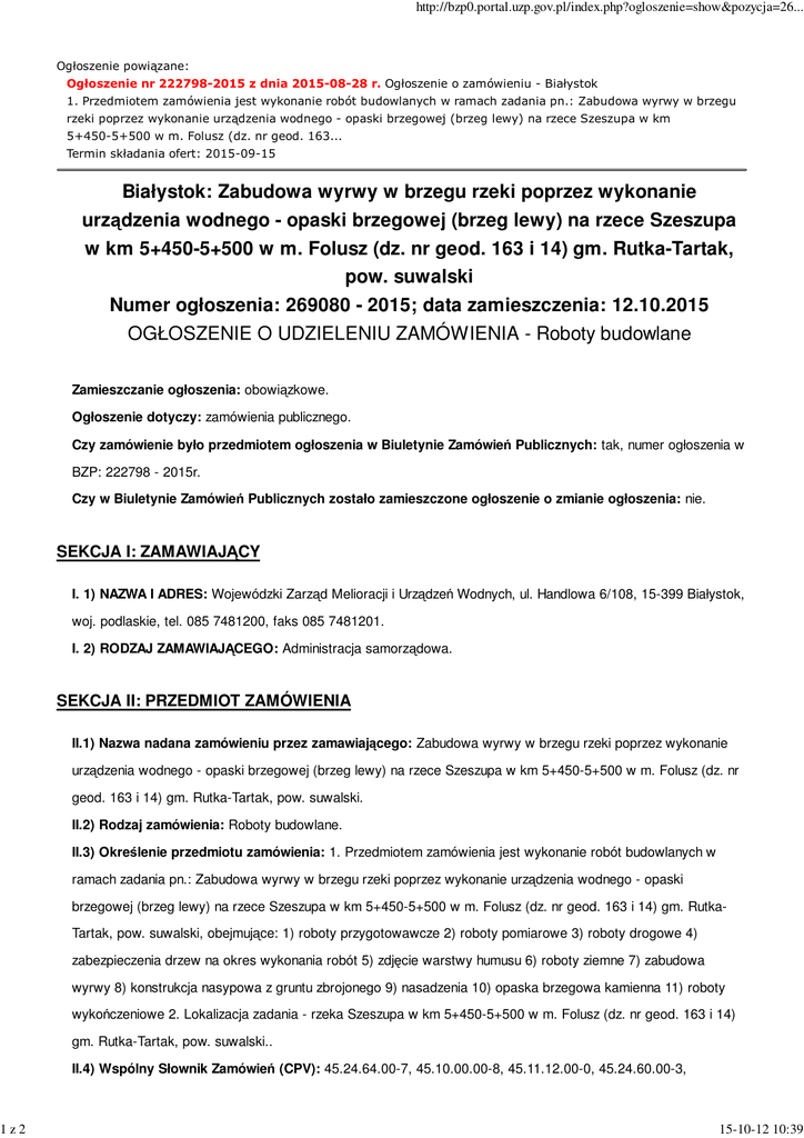 1z2 http://bzp0.portal.uzp.gov.pl/index.php?ogloszenie=show&pozycja=26... Ogłoszenie powiązane: Ogłoszenie nr 222798-2015 z dnia 2015-08-28 r. Ogłoszenie o zamówieniu - Białystok 1. Przedmiotem zamówienia jest wykonanie robót budowlanych w ramach zadania pn.: Zabudowa wyrwy w brzegu rzeki poprzez wykonanie urządzenia wodnego - opaski brzegowej (brzeg lewy) na rzece Szeszupa w km 5+450-5+500 w m. Folusz (dz. nr geod. 163... Termin składania ofert: 2015-09-15 Białystok: Zabudowa wyrwy w brzegu rzeki poprzez wykonanie urządzenia wodnego - opaski brzegowej (brzeg lewy) na rzece Szeszupa w km 5+450-5+500 w m. Folusz (dz. nr geod. 163 i 14) gm. Rutka-Tartak, pow. suwalski Numer ogłoszenia: 269080 - 2015; data zamieszczenia: 12.10.2015 OGŁOSZENIE O UDZIELENIU ZAMÓWIENIA - Roboty budowlane Zamieszczanie ogłoszenia: obowiązkowe. Ogłoszenie dotyczy: zamówienia publicznego. Czy zamówienie było przedmiotem ogłoszenia w Biuletynie Zamówień Publicznych: tak, numer ogłoszenia w BZP: 222798 - 2015r. Czy w Biuletynie Zamówień Publicznych zostało zamieszczone ogłoszenie o zmianie ogłoszenia: nie. SEKCJA I: ZAMAWIAJĄCY I. 1) NAZWA I ADRES: Wojewódzki Zarząd Melioracji i Urządzeń Wodnych, ul. Handlowa 6/108, 15-399 Białystok, woj. podlaskie, tel. 085 7481200, faks 085 7481201. I. 2) RODZAJ ZAMAWIAJĄCEGO: Administracja samorządowa. SEKCJA II: PRZEDMIOT ZAMÓWIENIA II.1) Nazwa nadana zamówieniu przez zamawiającego: Zabudowa wyrwy w brzegu rzeki poprzez wykonanie urządzenia wodnego - opaski brzegowej (brzeg lewy) na rzece Szeszupa w km 5+450-5+500 w m. Folusz (dz. nr geod. 163 i 14) gm. Rutka-Tartak, pow. suwalski. II.2) Rodzaj zamówienia: Roboty budowlane. II.3) Określenie przedmiotu zamówienia: 1. Przedmiotem zamówienia jest wykonanie robót budowlanych w ramach zadania pn.: Zabudowa wyrwy w brzegu rzeki poprzez wykonanie urządzenia wodnego - opaski brzegowej (brzeg lewy) na rzece Szeszupa w km 5+450-5+500 w m. Folusz (dz. nr geod. 163 i 14) gm. RutkaTartak, pow. suwalski, obejmujące: 1) roboty przygotowawcze 2) roboty pomiarowe 3) roboty drogowe 4) zabezpieczenia drzew na okres wykonania robót 5) zdjęcie warstwy humusu 6) roboty ziemne 7) zabudowa wyrwy 8) konstrukcja nasypowa z gruntu zbrojonego 9) nasadzenia 10) opaska brzegowa kamienna 11) roboty wykończeniowe 2. Lokalizacja zadania - rzeka Szeszupa w km 5+450-5+500 w m. Folusz (dz. nr geod. 163 i 14) gm. Rutka-Tartak, pow. suwalski.. II.4) Wspólny Słownik Zamówień (CPV): 45.24.64.00-7, 45.10.00.00-8, 45.11.12.00-0, 45.24.60.00-3, 15-10-12 10:39 2z2 http://bzp0.portal.uzp.gov.pl/index.php?ogloszenie=show&pozycja=26... 45.22.30.00-6, 45.45.00.00-6. SEKCJA III: PROCEDURA III.1) TRYB UDZIELENIA ZAMÓWIENIA: Przetarg nieograniczony III.2) INFORMACJE ADMINISTRACYJNE Zamówienie dotyczy projektu/programu finansowanego ze środków Unii Europejskiej: nie SEKCJA IV: UDZIELENIE ZAMÓWIENIA IV.1) DATA UDZIELENIA ZAMÓWIENIA: 05.10.2015. IV.2) LICZBA OTRZYMANYCH OFERT: 6. IV.3) LICZBA ODRZUCONYCH OFERT: 0. IV.4) NAZWA I ADRES WYKONAWCY, KTÓREMU UDZIELONO ZAMÓWIENIA: BUDIMAR Radosław Zięcina, Krasnoborki 37, 16-310 Sztabin, kraj/woj. podlaskie. IV.5) Szacunkowa wartość zamówienia (bez VAT): 153401,33 PLN. IV.6) INFORMACJA O CENIE WYBRANEJ OFERTY ORAZ O OFERTACH Z NAJNIśSZĄ I NAJWYśSZĄ CENĄ Cena wybranej oferty: 110059,17 Oferta z najniŜszą ceną: 110059,17 / Oferta z najwyŜszą ceną: 261456,60 Waluta: PLN . 15-10-12 10:39
