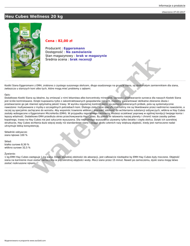 Informacje o produkcie Utworzono 07-03-2017 Heu Cubes Wellness 20 kg Cena : 82,00 zł er m ar k Producent : Eggersmann Dostępność : Na zamówienie Stan magazynowy : brak w magazynie Średnia ocena : brak recenzji Kostki Siana Eggersmann z EMH, zrobione z czystego suszonego słońcem, długo osadzonego na gruncie siana, są doskonałym zamiennikiem dla siana, zwłaszcza u starszych koni albo tych, które mogą mieć problemy z zębami. Opis: Dodatkowo Kostki Siana są idealne, by zmieszać z nimi lekarstwa albo koncentraty mineralne. Uprawa i przetwarzanie surowca dla naszych Kostek Siana jest ściśle kontrolowane. Dzięki kupowaniu tylko z zakontraktowanych gospodarstw rolnych, możemy gwarantować delikatne zbieranie zboża i przetwarzanie go jak również optymalną jakość trawy. W wyniku regularnej kontroli ziemi, za pomocą pobieranych próbek, pola są systematycznie nawożone i kultywowane z myślą o szczególnych potrzebach koni. Dlatego zioła i inne specyficzne rośliny nie są likwidowane przez nadmierne nawożenie, a raczej są specjalnie zachęcane do wzrostu. Aby wspomóc trawienie włókien i poprawić zdolność do wchłaniania substancji odżywczych, włókna w Hay Cubes zostały wzbogacone o Eggersmann MicroHerbs (EMH). W przypadku regularnego karmienia, możesz oczekiwać poprawę w ogólnej kondycji twojego konia i lepszą witalność. Dodatkowo EMH przedłuża okres przechowywania Hay Cubes. By pomóc w ratowaniu naszej planety i chronić nasze zasoby paliwa kopalnego, trawa na Hay Cubes nie jest sztucznie wysuszona. Dla neutralnego wysuszania używamy tylko światła i ciepła słońca. Dzięki ich szorstkiej strukturze, Hay Cubes wchłania dużo więcej wody niż standardowe siano i osiąga około czterech razy większą objętość, kiedy jest namoczone nadal utrzymuje lekką konsystencję. Skład: białko surowe 8,30 % włókno surowe 32,5 % at Składniki odżywcze: siano łąkowe 100 % w Żywienie: 1 kg EMH Hay Cubes zastępuje 1 kg siana. Dzięki wysokiej zdolności do absorpcji, jest całkowicie niezbędne by EMH Hay Cubes były moczone. Objętość siana na karmienie musi zostać zamoczona w pięciokrotnej objętości wody. Mocz siano przez 15 minut. Nawet po zamoczeniu, dyski siana mogą łatwo zostać rozkruszone rękami. Wygenerowano w programie www.oscGold.com