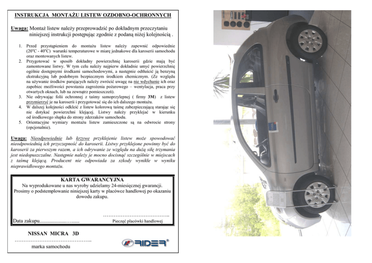 INSTRUKCJA MONTAŻU LISTEW OZDOBNO-OCHRONNYCH Uwaga: Montaż listew należy przeprowadzić po dokładnym przeczytaniu niniejszej instrukcji postępując zgodnie z podaną niżej kolejnością . 1. Przed przystąpieniem do montażu listew należy zapewnić odpowiednie (20oC - 40oC) warunki temperaturowe w miarę jednakowe dla karoserii samochodu oraz montowanych listew. 2. Przygotować w sposób dokładny powierzchnię karoserii gdzie mają być zamontowane listwy. W tym celu należy najpierw dokładnie umyć powierzchnię ogólnie dostępnymi środkami samochodowymi, a następnie odtłuścić ją benzyną ekstrakcyjną lub podobnym bezpiecznym środkiem chemicznym. (Ze względu na używanie środków parujących należy zwrócić uwagę na nie wdychanie ich oraz zapobiec możliwości powstania zagrożenia pożarowego – wentylacja, praca przy otwartych oknach, lub na zewnątrz pomieszczeń). 3. Nie odrywając folii ochronnej z taśmy samoprzylepnej ( firmy 3M) z listew przymierzyć je na karoserii i przygotować się do ich dalszego montażu. 4. W dalszej kolejności odkleić z listew kolorową taśmę zabezpieczającą starając się nie dotykać powierzchni klejącej. Listwy należy przyklejać w kierunku od środkowego słupka do strony zderzaków samochodu. 5. Orientacyjne wymiary montażu listew zamieszczone są na odwrocie strony (opcjonalnie). Uwaga: Nieodpowiednie lub krzywe przyklejenie listew może spowodować nieodpowiednią ich przyczepność do karoserii. Listwy przyklejone powinny być do karoserii za pierwszym razem, a ich odrywanie ze względu na dużą siłę trzymania jest niedopuszczalne. Następnie należy je mocno docisnąć szczególnie w miejscach z taśmą klejącą. Producent nie odpowiada za szkody wynikłe w wyniku nieprawidłowego montażu. KARTA GWARANCYJNA Na wyprodukowane u nas wyroby udzielamy 24-miesięcznej gwarancji. Prosimy o podstemplowanie niniejszej karty w placówce handlowej po okazaniu dowodu zakupu. ……………………………….. Data zakupu....................…...... NISSAN MICRA 3D …………………………………….. . marka samochodu Pieczęć placówki handlowej