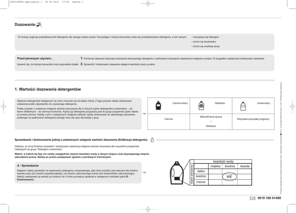 10601498PL.qxp:Layout 1 20-05-2011 17:32 Pagina 1 Dozowanie Ta funkcja sugeruje prawidłową ilość detergentu dla danego wsadu prania. Korzystając z funkcji dozownika unika się przedawkowania detergentu, a tym samym: • oszczędza się detergent • chroni się środowisko • chroni się wrażliwą skórę 2. Sprawdzić i dostosować ustawienie wstępne twardości wody w pralce. 1. Wartości dozowania detergentów Stężenia detergentów dostępnych na rynku znacznie się od siebie różnią. Z tego powodu należy dostosować ustawienia pralki odpowiednio do używanego detergentu. Pralka posiada 3 ustawione wstępnie wartości dozowania dla 3 różnych typów detergentów (uniwersalny – do tkanin delikatnych – do ciemnych kolorów). Każdy typ detergentu przypisany jest do grupy programów (patrz tabela po prawej stronie). Każdą z tych 3 ustawionych wstępnie wartości należy dostosować do zalecanego dozowania podanego na opakowaniu detergentu,którego chce się użyć dla każdej z grup. Ciemne kolory Delikatne Wełna/Pranie ręczne Ciemne i Uniwersalny Wszystkie pozostałe programy Delikatne Sprawdzanie i dostosowanie jednej z ustawionych wstępnie wartości dozowania (Kalibracja detergentu). Załóżmy, że chcą Państwo sprawdzić i dostosować ustawioną wstępnie wartość dozowania dla wszystkich programów należących do grupy “Detergent uniwersalny”. A - Sprawdzanie Najpierw należy sprawdzić na opakowaniu detergentu uniwersalnego, jaka ilość produktu jest zalecana dla średnio twardej wody (lub średnio twardej/miękkiej) i do średnio zabrudzonego brania (lub średnio/lekko zabrudzonego). Należy zastosować tę wartość po dotarciu do 3 kroku procedury opisanej w następnym rozdziale (patrz B Dostosowanie). stopień zabrudzenia Ważne: w trakcie tej fazy nie należy uwzględniać stopnia twardości wody w danym miejscu oraz zwyczajowego stopnia zabrudzenia prania. Należy po prostu postępować zgodnie z poniższymi instrukcjami. lekko twardość wody miękka średnia twarda średnio mocno PL 03/11 - © Copyright Whirlpool Europe s.r.l. 2011. Wszelkie prawa zastrzeżone Upewnić się, że funkcja dozownika może optymalnie działać. 1. Porównać zalecenia dotyczące dozowania stosowanego detergentu z wartościami dozowania ustawionymi wstępnie w pralce. W przypadku rozbieżności dostosować ustawienia. Producent zastrzega sobie możliwość wprowadzenia zmian - Wydrukowano we Włoszech Przed pierwszym użyciem... 5019 106 01498 10601498PL.qxp:Layout 1 20-05-2011 17:32 Pagina 2 B - Dostosowanie (Kalibracja detergentu) Wybrać program należący do grupy programów, dla których chce się sprawdzić i ewentualnie dostosować ustawioną wstępnie wartość dozowania (na przykład program “Bawełniane” dla grupy “Uniwersalny”). Porównać wartość wstępną pokazaną na wyświetlaczu z poprzednio znalezioną zalecaną ilością detergentu (tj. zalecaną na opakowaniu detergentu w przypadku średnio twardej wody i średnio zabrudzonego prania). Jeżeli wartości te różnią się od siebie, dostosować wyświetloną wartość poprzez naciśnięcie przycisku “+” lub “-”. Nacisnąć przycisk “OK”, aby potwierdzić i zapisać nową wartość dozowania detergentu dla tej grupy. Wartość zniknie z wyświetlacza i powróci on do stanu początkowego. Należy wykonać tę samą procedurę dla wszystkich 3 grup programów. Wystarczy zapisać wartość dozowania dla JEDNEGO programu z każdej grupy - zostanie ona automatycznie zapisana dla pozostałych programów należących do tej grupy. Na przykład jeżeli zapisze się wartość dozowania dla programu “Bawełniane”, zostanie ona automatycznie zapisana dla wszystkich programów należących do grupy “Uniwersalny”. Jeżeli chce się zmienić zapisane wartości dozowania (na przykład z powodu zmiany rodzaju stosowanego detergentu), należy postępować w opisany powyżej sposób; poprzednio zapisana wartość dozowania zostanie zastąpiona nową dla wybranej grupy programów. Kasowanie zapisanych wartości dozowania i powrót do wstępnie ustawionych wartości Dla określonej grupy programów: Wybrać dowolny program z grupy, dla której ustawiona dawka ma być skasowana. Nacisnąć przycisk “Dozowanie” i przytrzymać go przez kilka sekund - na wyświetlaczu pojawi się symbol butelki i aktualnie zapisana wartość dozowania. Nacisnąć krótko przycisk “Reset/Odpompowanie” - na wyświetlaczu pojawi się na krótko napis “rES”. Na wyświetlaczu pojawi się ustawiona wstępnie wartość dozowania. Nacisnąć przycisk “OK”, aby potwierdzić. Dla wszystkich programów: Wybrać program “Płukanie i wirowanie”. Nacisnąć przycisk “Dozowanie” i przytrzymać go przez kilka sekund - na wyświetlaczu pojawi się symbol butelki i trzy poziome paski. Nacisnąć krótko przycisk “Reset/Odpompowanie” - na wyświetlaczu pojawi się napis “rES”. Nacisnąć przycisk “OK”, aby potwierdzić i skasować wszystkie zapisane wartości. PL 03/11 - © Copyright Whirlpool Europe s.r.l. 2011. Wszelkie prawa zastrzeżone Na wyświetlaczu zaświeci się symbol butelki i pojawi się ustawiona wstępnie wartość dozowania detergentu. Producent zastrzega sobie możliwość wprowadzenia zmian - Wydrukowano we Włoszech Nacisnąć przycisk “Dozowanie” i przytrzymać go przez kilka sekund. 5019 106 01498 10601498PL.qxp:Layout 1 20-05-2011 17:32 Pagina 3 2. Twardość wody A - Sprawdzanie stopnia twardości lokalnej wody Pranie w “twardej wodzie” wymaga stosowania większej ilości detergentu w porównaniu do “miękkiej” wody, dlatego należy sprawdzić, czy ustawiony wstępnie stopień twardości wody odpowiada twardości wody w Państwa miejscu zamieszkania. W celu sprawdzenia stopnia twardości wody w miejscu zamieszkania należy się skontaktować z miejscowymi wodociągami lub użyć paska testowego dołączonego do ulotki środka Calgon dostarczonego wraz z pra