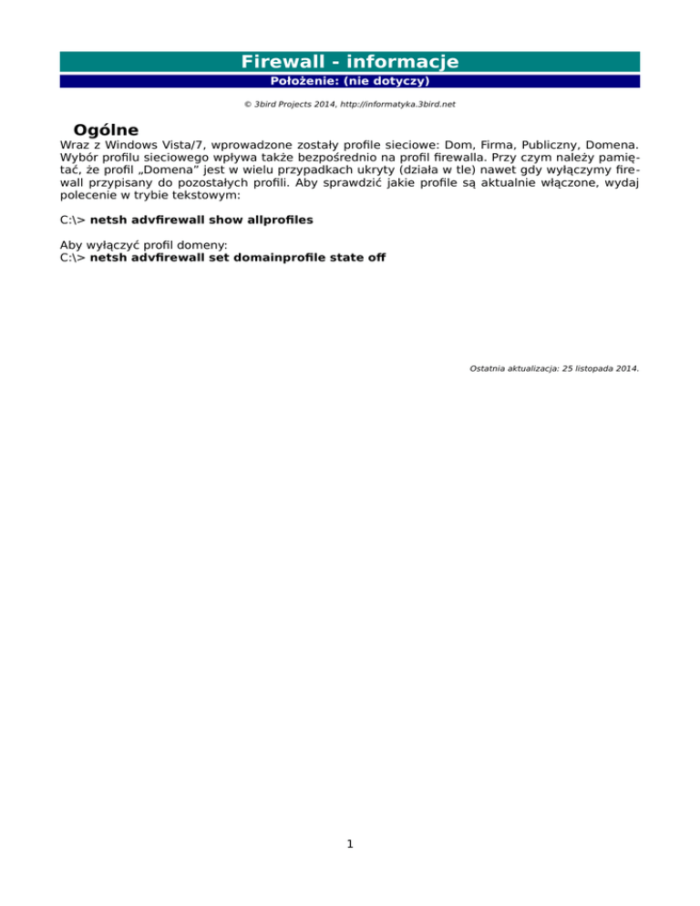 Firewall - informacje Położenie: (nie dotyczy) © 3bird Projects 2014, http://informatyka.3bird.net Ogólne Wraz z Windows Vista/7, wprowadzone zostały profile sieciowe: Dom, Firma, Publiczny, Domena. Wybór profilu sieciowego wpływa także bezpośrednio na profil firewalla. Przy czym należy pamiętać, że profil „Domena” jest w wielu przypadkach ukryty (działa w tle) nawet gdy wyłączymy firewall przypisany do pozostałych profili. Aby sprawdzić jakie profile są aktualnie włączone, wydaj polecenie w trybie tekstowym: C:\> netsh advfirewall show allprofiles Aby wyłączyć profil domeny: C:\> netsh advfirewall set domainprofile state of Ostatnia aktualizacja: 25 listopada 2014. 1