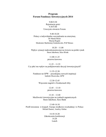 Program Forum Funduszy Inwestycyjnych 2014 9.00-9.30 Rejestracja gości 9.30-9.40 Uroczyste otwarcie Forum 9.40-10.20 Polacy a indywidualne oszczędzania na emeryturę Dr Marek Benio Maciej Rogala Moderator Bartłomiej Godusławski, PAP Biznes 10.20 – 11.00 Wpływ sytuacji makroekonomicznej na świecie na polski rynek Steen Jakobsen, Saxo BAnk 11.00-11.25 przerwa kawowa 11.25 – 11.55 Czy płeć ma wpływ na podejmowanie decyzji inwestycyjnych? 11.55-12.30 Fundusze na GPW – poszukajmy nowych inspiracji Izabela Olszewska, GPW 12.30-12.45 Wręczenie nagród w Konkursach Izby 12.45 – 13.10 przerwa kawowa 13.10 – 13.40 Możliwości inwestycyjne na rynkach zagranicznych Steen Jakobsen, Saxo Bank 13.40-14.10 Profil inwestora w krajach Europy środkowo-wschodniej i w Polsce Michał Duniec, Analizy Online 14.10-14.20 Zakończenie konferencji 14.20 Lunch