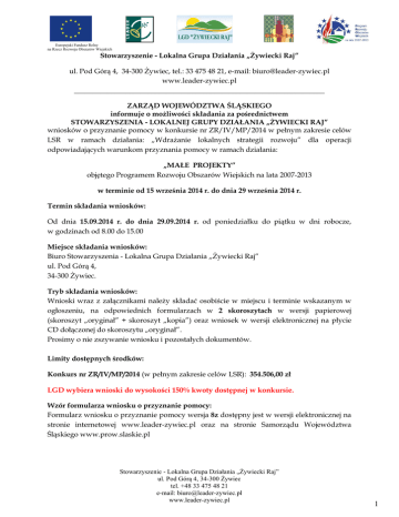 Europejski Fundusz Rolny na Rzecz Rozwoju Obszarów Wiejskich Stowarzyszenie - Lokalna Grupa Działania „Żywiecki Raj” ul. Pod Górą 4, 34-300 Żywiec, tel.: 33 475 48 21, e-mail: [email protected] www.leader-zywiec.pl ____________________________________________________________________ ZARZĄD WOJEWÓDZTWA ŚLĄSKIEGO informuje o możliwości składania za pośrednictwem STOWARZYSZENIA - LOKALNEJ GRUPY DZIAŁANIA „ŻYWIECKI RAJ” wniosków o przyznanie pomocy w konkursie nr ZR/IV/MP/2014 w pełnym zakresie celów LSR w ramach działania: „Wdrażanie lokalnych strategii rozwoju” dla operacji odpowiadających warunkom przyznania pomocy w ramach działania: „MAŁE PROJEKTY” objętego Programem Rozwoju Obszarów Wiejskich na lata 2007-2013 w terminie od 15 września 2014 r. do dnia 29 września 2014 r. Termin składania wniosków: Od dnia 15.09.2014 r. do dnia 29.09.2014 r. od poniedziałku do piątku w dni robocze, w godzinach od 8.00 do 15.00 Miejsce składania wniosków: Biuro Stowarzyszenia - Lokalna Grupa Działania „Żywiecki Raj” ul. Pod Górą 4, 34-300 Żywiec. Tryb składania wniosków: Wnioski wraz z załącznikami należy składać osobiście w miejscu i terminie wskazanym w ogłoszeniu, na odpowiednich formularzach w 2 skoroszytach w wersji papierowej (skoroszyt „oryginał” + skoroszyt „kopia”) oraz wniosek w wersji elektronicznej na płycie CD dołączonej do skoroszytu „oryginał”. Prosimy o nie zszywanie wniosku i pozostałych dokumentów. Limity dostępnych środków: Konkurs nr ZR/IV/MP/2014 (w pełnym zakresie celów LSR): 354.506,00 zł LGD wybiera wnioski do wysokości 150% kwoty dostępnej w konkursie. Wzór formularza wniosku o przyznanie pomocy: Formularz wniosku o przyznanie pomocy wersja 8z dostępny jest w wersji elektronicznej na stronie internetowej www.leader-zywiec.pl oraz na stronie Samorządu Województwa Śląskiego www.prow.slaskie.pl Stowarzyszenie - Lokalna Grupa Działania „Żywiecki Raj” ul. Pod Górą 4, 34-300 Żywiec tel. +48 33 475 48 21 e-mail: [email protected] www.leader-zywiec.pl 1 Europejski Fundusz Rolny na Rzecz Rozwoju Obszarów Wiejskich Konkurs nr ZR/IV/MP/2014 „Małe Projekty” (w pełnym zakresie celów LSR): Kryteria wyboru operacji w ramach działania: „Małe Projekty” przez Stowarzyszenie Lokalną Grupę Działania „Żywiecki Raj”: Lokalne kryteria wyboru operacji dla działania „Małe Projekty” znajdują się na stronach internetowych: www.leader-zywiec.pl, na stronie Samorządu Województwa Śląskiego www.prow.slaskie.pl oraz w Lokalnej Strategii Rozwoju LGD” Żywiecki Raj”. Wykaz dokumentów niezbędnych do wyboru operacji przez LGD „Żywiecki Raj” w ramach działania „Małe Projekty”: 1. Wypełniony wniosek o przyznanie pomocy wraz z załącznikami, zgodnie z następującymi wytycznymi: a. dwa egzemplarze wniosku wraz z załącznikami w wersji papierowej, każdy w oddzielnym skoroszycie (skoroszyt „oryginał” i skoroszyt „kopia”), b. „wniosek o przyznanie pomocy” w wersji elektronicznej na płycie CD opisanej: imię i nazwisko/ nazwa instytucji, tytuł projektu, działanie. c. płytę CD należy dołączyć do skoroszytu „oryginału”. Prosimy o nie zszywanie wniosku i pozostałych dokumentów. 2. Oświadczenie Wnioskodawcy o zgodności wniosku złożonego w wersji papierowej z wersją elektroniczną zamieszczoną na płycie CD. 3. Umowa partnerstwa lub wypełniony list intencyjny (jeśli Beneficjent będzie realizował projekt z innym podmiotem/podmiotami), załączone do wniosków w wersji papierowej. 4. Oświadczenie Wnioskodawcy o wyrażeniu zgody na udostępnianie wniosku Radzie Stowarzyszenia, wyrażeniu zgody na przetwarzanie danych osobowych oraz miejscu zamieszkania/prowadzenia działalności, załączone do wniosków w wersji papierowej. 5. Oświadczenie o stopniu wykorzystania zasobów i walorów lokalnych załączone do wniosków w wersji papierowej. 6. Wniosek o wyprzedzające finansowanie w przypadku gdy Wnioskodawca będzie ubiegał się o wyprzedzające finansowanie. 7. Formularz informacji przedstawianych przy ubieganiu się o pomoc de minimis. 8. Oświadczenie Wnioskodawcy o przedsiębiorstwach powiązanych oraz uzyskanych przez nie kwotach pomocy de minimis. 9. Oświadczenie Wnioskodawcy o wyrażeniu zgody na przetwarzanie danych osobowych (formularz o symbolu W-1_413_MP). Wszelkie informacje na temat konkursu udzielane są w Biurze Stowarzyszenia - Lokalna Grupa Działania „Żywiecki Raj” z siedzibą 34-300 Żywiec, ul. Pod Górą 4 oraz pod numerem telefonu 33 475 48 21. Pytania można kierować również drogą mailową na adres [email protected]. Stowarzyszenie - Lokalna Grupa Działania „Żywiecki Raj” ul. Pod Górą 4, 34-300 Żywiec tel. +48 33 475 48 21 e-mail: [email protected] www.leader-zywiec.pl 2