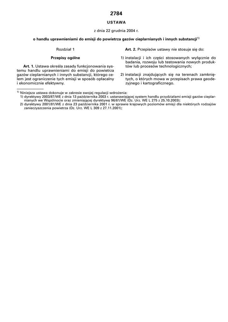2784 USTAWA z dnia 22 grudnia 2004 r. o handlu uprawnieniami do emisji do powietrza gazów cieplarnianych i innych substancji1) Rozdzia∏ 1 Przepisy ogólne Art. 1. Ustawa okreÊla zasady funkcjonowania systemu handlu uprawnieniami do emisji do powietrza gazów cieplarnianych i innych substancji, którego celem jest ograniczenie tych emisji w sposób op∏acalny i ekonomicznie efektywny. ——————— 1) Art. 2. Przepisów ustawy nie stosuje si´ do: 1) instalacji i ich cz´Êci stosowanych wy∏àcznie do badania, rozwoju lub testowania nowych produktów lub procesów technologicznych; 2) instalacji znajdujàcych si´ na terenach zamkni´tych, o których mowa w przepisach prawa geodezyjnego i kartograficznego. Niniejsza ustawa dokonuje w zakresie swojej regulacji wdro˝enia: 1) dyrektywy 2003/87/WE z dnia 13 paêdziernika 2003 r. ustanawiajàcej system handlu przydzia∏ami emisji gazów cieplarnianych we Wspólnocie oraz zmieniajàcej dyrektyw´ 96/61/WE (Dz. Urz. WE L 275 z 25.10.2003); 2) dyrektywy 2001/81/WE z dnia 23 paêdziernika 2001 r. w sprawie krajowych poziomów emisji dla niektórych rodzajów zanieczyszczenia powietrza (Dz. Urz. WE L 309 z 27.11.2001); Dziennik Ustaw Nr 281 — 20175 — Art. 3. Ilekroç w ustawie jest mowa o: 1) ekwiwalencie — rozumie si´ przez to jeden megagram (1 Mg) dwutlenku w´gla (CO2) lub iloÊç innego gazu cieplarnianego stanowiàcà odpowiednik 1 Mg dwutlenku w´gla, obliczonà z wykorzystaniem wspó∏czynników ocieplenia; Poz. 2784 6) instalacji — rozumie si´ przez to instalacj´ w rozumieniu ustawy z dnia 27 kwietnia 2001 r. — Prawo ochrony Êrodowiska; 7) instalacji istniejàcej — rozumie si´ przez to u˝ytkowanà instalacj´, uj´tà w krajowym planie rozdzia∏u uprawnieƒ do emisji; 2) emisji — rozumie si´ przez to emisj´ w rozumieniu ustawy z dnia 27 kwietnia 2001 r. — Prawo ochrony Êrodowiska (Dz. U. Nr 62, poz. 627, z póên. zm.2)); 8) instalacji nowej — rozumie si´ przez to instalacj´, która powinna byç obj´ta systemem handlu uprawnieniami do emisji, a nie zosta∏a uj´ta w krajowym planie rozdzia∏u uprawnieƒ do emisji; 3) emisji unikni´tej — rozumie si´ przez to iloÊç substancji, jaka by∏aby wprowadzona do powietrza w danym roku z instalacji stosowanych powszechnie do wytwarzania okreÊlonego produktu na terytorium Rzeczypospolitej Polskiej, a przez zastosowanie nowej instalacji, innego rozwiàzania technicznego lub technologicznego lub innych surowców lub paliw nie zosta∏a wprowadzona do powietrza; 9) jednostce poÊwiadczonej redukcji emisji — rozumie si´ przez to jednostk´ emisji zredukowanej lub emisji unikni´tej gazów cieplarnianych otrzymanà w wyniku realizacji projektu mechanizmu czystego rozwoju, wyra˝onà jako ekwiwalent; 4) emisji zredukowanej — rozumie si´ przez to iloÊç substancji, jaka nie zosta∏a wprowadzona do powietrza w danym roku z instalacji istniejàcej wskutek podj´tych dzia∏aƒ modernizacyjnych lub restrukturyzacyjnych majàcych na celu: a) obni˝enie wielkoÊci emisji przypadajàcej na jednostk´ powstajàcego produktu lub jednostk´ wykorzystywanego surowca, materia∏u lub paliwa w zak∏adzie, na którego terenie jest po∏o˝ona instalacja obj´ta systemem handlu uprawnieniami do emisji, lub b) obni˝enie wielkoÊci emisji w odniesieniu do Êredniej emisji z poprzedniego okresu, lub c) obni˝enie wielkoÊci emisji wskutek przej´cia przez innà instalacj´ produkcji z instalacji zlikwidowanej; 5) gazach cieplarnianych — rozumie si´ przez to: a) dwutlenek w´gla (CO2), b) metan (CH4), c) podtlenek azotu (N2O), d) fluoropochodne w´glowodorów (HFCs), 10) jednostce redukcji emisji — rozumie si´ przez to jednostk´ emisji zredukowanej lub emisji unikni´tej gazów cieplarnianych otrzymanà w wyniku realizacji projektu wspólnych wdro˝eƒ, wyra˝onà jako ekwiwalent; 11) paƒstwach uprawnionych — rozumie si´ przez to Federacj´ Rosyjskà, Irlandi´, Japoni´, Kanad´, Konfederacj´ Szwajcarskà, Królestwo Belgii, Królestwo Danii, Królestwo Hiszpanii, Królestwo Niderlandów, Królestwo Norwegii, Królestwo Szwecji, Ksi´stwo Liechtensteinu, Ksi´stwo Monako, Nowà Zelandi´, Republik´ Austrii, Republik´ Bu∏garii, Republik´ Chorwacji, Republik´ Czeskà, Republik´ Estoƒskà, Republik´ Federalnà Niemiec, Republik´ Finlandii, Republik´ Francuskà, Republik´ Greckà, Republik´ Islandii, Republik´ Litewskà, Republik´ ¸otewskà, Republik´ Portugalskà, Republik´ S∏owacji, Republik´ S∏owenii, Republik´ W´gierskà, Republik´ W∏oskà, Rumuni´, Rzeczpospolità Polskà, Stany Zjednoczone Ameryki, Ukrain´, Wielkie Ksi´stwo Luksemburga, Zjednoczone Królestwo Wielkiej Brytanii i Irlandii Pó∏nocnej, Zwiàzek Australijski, Republik´ Cypryjskà i Republik´ Malty; 12) projekcie wspólnych wdro˝eƒ — rozumie si´ przez to dzia∏anie inwestycyjne realizowane przez paƒstwo uprawnione na terytorium innego paƒstwa uprawnionego, które ma na celu redukcj´ lub unikni´cie emisji gazów cieplarnianych; e) perfluoropochodne zwiàzki w´gla (PFCs), f) szeÊciofluorek siarki (SF6); 13) projekcie mechanizmu czystego rozwoju — rozumie si´ przez to dzia∏anie inwestycyjne realizowa- ——————— 3) dyrektywy 2001/80/WE z dnia 23 paêdziernika 2001 r. w sprawie ograniczenia emisji niektórych zanieczyszczeƒ do powietrza z du˝ych obiektów energetycznego spalania (Dz. Urz. WE L 309 z 27.11.2001); 4) decyzji nr 280/2004/WE Parlamentu Europejskiego i Rady z dnia 11 lutego 2004 r. dotyczàcej mechanizmu monitorowania emisji gazów cieplarnianych Wspólnoty i wykonania Protoko∏u z Kioto (Dz. Urz. WE L 49 z 19.02.2004); 5) decyzji Komisji z dnia 29 stycznia 2004 r. okreÊlajàcej wytyczne dotyczàce monitorowania i sprawozdawczoÊci w zakresie emisji gazu cieplarnianego w myÊl dyrektywy 2003/87/WE Parlamentu Europejskiego i Rady (Dz. Urz. WE L 59 z 26.02.2004). Dane dotyczàce aktów prawa Unii Europejskiej o
