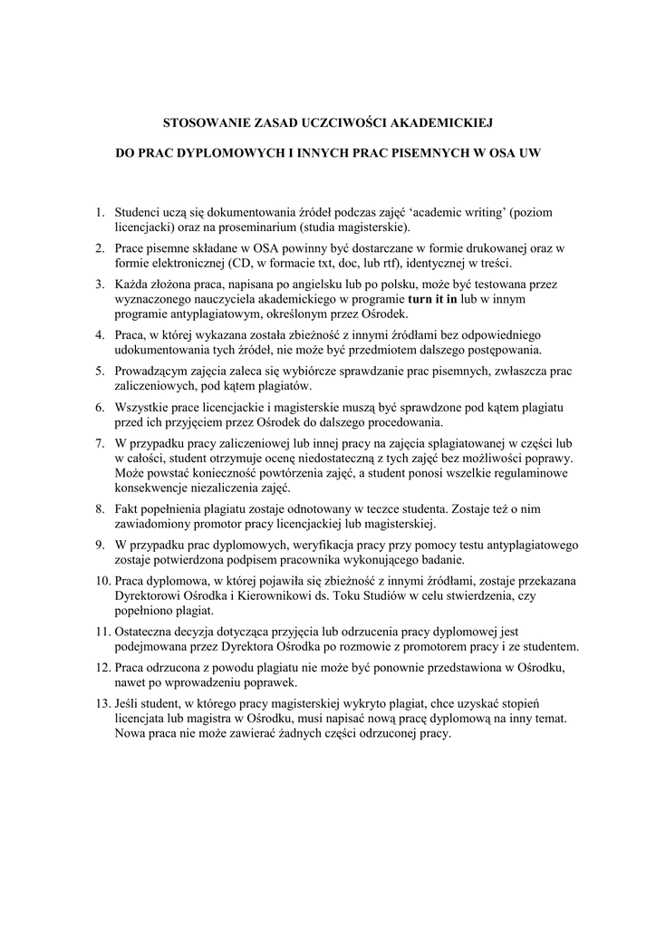 STOSOWANIE ZASAD UCZCIWOŚCI AKADEMICKIEJ DO PRAC DYPLOMOWYCH I INNYCH PRAC PISEMNYCH W OSA UW 1. Studenci uczą się dokumentowania źródeł podczas zajęć ‘academic writing’ (poziom licencjacki) oraz na proseminarium (studia magisterskie). 2. Prace pisemne składane w OSA powinny być dostarczane w formie drukowanej oraz w formie elektronicznej (CD, w formacie txt, doc, lub rtf), identycznej w treści. 3. Każda złożona praca, napisana po angielsku lub po polsku, może być testowana przez wyznaczonego nauczyciela akademickiego w programie turn it in lub w innym programie antyplagiatowym, określonym przez Ośrodek. 4. Praca, w której wykazana została zbieżność z innymi źródłami bez odpowiedniego udokumentowania tych źródeł, nie może być przedmiotem dalszego postępowania. 5. Prowadzącym zajęcia zaleca się wybiórcze sprawdzanie prac pisemnych, zwłaszcza prac zaliczeniowych, pod kątem plagiatów. 6. Wszystkie prace licencjackie i magisterskie muszą być sprawdzone pod kątem plagiatu przed ich przyjęciem przez Ośrodek do dalszego procedowania. 7. W przypadku pracy zaliczeniowej lub innej pracy na zajęcia splagiatowanej w części lub w całości, student otrzymuje ocenę niedostateczną z tych zajęć bez możliwości poprawy. Może powstać konieczność powtórzenia zajęć, a student ponosi wszelkie regulaminowe konsekwencje niezaliczenia zajęć. 8. Fakt popełnienia plagiatu zostaje odnotowany w teczce studenta. Zostaje też o nim zawiadomiony promotor pracy licencjackiej lub magisterskiej. 9. W przypadku prac dyplomowych, weryfikacja pracy przy pomocy testu antyplagiatowego zostaje potwierdzona podpisem pracownika wykonującego badanie. 10. Praca dyplomowa, w której pojawiła się zbieżność z innymi źródłami, zostaje przekazana Dyrektorowi Ośrodka i Kierownikowi ds. Toku Studiów w celu stwierdzenia, czy popełniono plagiat. 11. Ostateczna decyzja dotycząca przyjęcia lub odrzucenia pracy dyplomowej jest podejmowana przez Dyrektora Ośrodka po rozmowie z promotorem pracy i ze studentem. 12. Praca odrzucona z powodu plagiatu nie może być ponownie przedstawiona w Ośrodku, nawet po wprowadzeniu poprawek. 13. Jeśli student, w którego pracy magisterskiej wykryto plagiat, chce uzyskać stopień licencjata lub magistra w Ośrodku, musi napisać nową pracę dyplomową na inny temat. Nowa praca nie może zawierać żadnych części odrzuconej pracy.