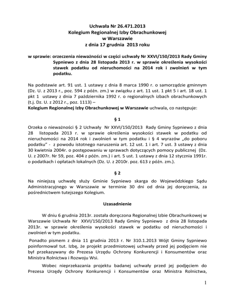 Uchwała Nr 26.471.2013 Kolegium Regionalnej Izby Obrachunkowej w Warszawie z dnia 17 grudnia 2013 roku w sprawie: orzeczenia nieważności w części uchwały Nr XXVI/150/2013 Rady Gminy Sypniewo z dnia 28 listopada 2013 r. w sprawie określenia wysokości stawek podatku od nieruchomości na 2014 rok i zwolnień w tym podatku. Na podstawie art. 91 ust. 1 ustawy z dnia 8 marca 1990 r. o samorządzie gminnym (Dz. U. z 2013 r., poz. 594 z późn. zm.) w związku z art. 11 ust. 1 pkt 5 i art. 18 ust. 1 pkt 1 ustawy z dnia 7 października 1992 r. o regionalnych izbach obrachunkowych (t.j. Dz. U. z 2012 r., poz. 1113) – Kolegium Regionalnej Izby Obrachunkowej w Warszawie uchwala, co następuje: §1 Orzeka o nieważności § 2 Uchwały Nr XXVI/150/2013 Rady Gminy Sypniewo z dnia 28 listopada 2013 r. w sprawie określenia wysokości stawek w podatku od nieruchomości na 2014 rok i zwolnień w tym podatku i § 4 wyrazów „do poboru podatku” - z powodu istotnego naruszenia art. 12 ust. 1 i art. 7 ust. 3 ustawy z dnia 30 kwietnia 2004r. o postępowaniu w sprawach dotyczących pomocy publicznej (Dz. U. z 2007r. Nr 59, poz. 404 z późn. zm.) i art. 5 ust. 1 ustawy z dnia 12 stycznia 1991r. o podatkach i opłatach lokalnych (Dz. U. z 2010r. poz. 613 z późn. zm.). §2 Na niniejszą uchwałę służy Gminie Sypniewo skarga do Wojewódzkiego Sądu Administracyjnego w Warszawie w terminie 30 dni od dnia jej doręczenia, za pośrednictwem tutejszego Kolegium. Uzasadnienie W dniu 6 grudnia 2013r. została doręczona Regionalnej Izbie Obrachunkowej w Warszawie Uchwała Nr XXVI/150/2013 Rady Gminy Sypniewo z dnia 28 listopada 2013r. w sprawie określenia wysokości stawek w podatku od nieruchomości i zwolnień w tym podatku. Ponadto pismem z dnia 11 grudnia 2013 r. Nr 310.1.2013 Wójt Gminy Sypniewo poinformował tut. Izbę, że projekt przedmiotowej uchwały przed jej podjęciem nie był przekazywany do Prezesa Urzędu Ochrony Konkurencji i Konsumentów oraz Ministra Rolnictwa i Rozwoju Wsi. Wobec nieprzekazania projektu badanej uchwały przed jej podjęciem do Prezesa Urzędy Ochrony Konkurencji i Konsumentów oraz Ministra Rolnictwa, 1 badając tę uchwałę Kolegium doszło do przekonania, że w zakresie zwolnienia od podatku od nieruchomości budynków mieszkalnych przeznaczonych na potrzeby gospodarstw rolnych oraz budynków i budowli ochrony przeciwpożarowej i działalności kulturalnej, została ona podjęta z istotnym naruszeniem art. 12 ust. 1 i art. 7 ust. 3 ww. ustawy o postępowaniu w sprawach dotyczących pomocy publicznej. Badana uchwała dotyczy bowiem także przedsiębiorców i w ich przypadku zwolnienie od podatku stanowi program pomocowy w rozumieniu art. 2 pkt 7 ww. ustawy o postępowaniu w sprawach dotyczących pomocy publicznej. Każdy projekt programu pomocowego, w tym przewidujący udzielenie pomocy w ramach wyłączeń grupowych, oraz pomocy indywidualnej, w tym pomocy indywidualnej na restrukturyzację, wymaga uzyskania opinii Prezesa Urzędu Ochrony Konkurencji i Konsumentów (art. 12 ust. 1 ustawy o postępowaniu w sprawach dotyczących pomocy publicznej). Nieprzedstawienia przez jednostkę samorządu terytorialnego uchwały do zaopiniowania Prezesowi Urzędu Ochrony Konkurencji i Konsumentów oraz Ministrowi Rolnictwa stanowi istotne naruszenie art. 12 ust. 1 ustawy o postępowaniu w sprawach dotyczących pomocy publicznej. Wskazania także wymaga, iż co do zasady zwolnienia od podatku od nieruchomości w przypadku przedsiębiorców stosowane są w ramach pomocy de minimis. Brak jest jednakże w treści uchwały odesłania do rozporządzenia Komisji (WE) Nr 1998/2006 z dnia 15 grudnia 2006 r. w sprawie stosowania art. 87 i 88 Traktatu do pomocy de minimis , Dz.U.UE.L.2006.379.5. Jeżeli jednak, mimo braku wskazanego odesłania, zamiarem Rady Gminy Sypniewo było stosowanie zwolnienia dla przedsiębiorców w ramach pomocy de minimis, to zgodnie z powołanym art. 7 ust. 3 ustawy o postępowaniu w sprawach dotyczących pomocy publicznej, projekt uchwały przewidującej udzielenie takiego zwolnienia powinien być zgłoszony do Prezesa Urzędu Ochrony Konkurencji i Konsumentów i Ministra Rolnictwa, którzy w terminie 14 dni mogę przedstawić zastrzeżenia dotyczące przejrzystości zasad udzielania pomocy. W ocenie Kolegium, skoro projekt badanej uchwały nie został przekazany do Prezesa Urzędu Ochrony Konkurencji i Konsumentów i Ministra Rolnictwa, w celu uzyskania opinii, o której mowa w art. 12 ust. 1 ustawy o postępowaniu w sprawach dotyczących pomocy publicznej, ani w trybie art. 7 ust. 3 ww. ustawy, to badana uchwała została podjęta z istotnym naruszeniem powyższych przepisów prawa. Ponadto w § 4 Rada Gminy Sypniewo postanowiła, że uchwała wchodzi w życie po upływie 14 dni od dnia ogłoszenia w Dzienniku Urzędowym Województwa Mazowieckiego i ma zastosowanie do poboru podatku na 2014 r. Ustawa w art. 5 ust. 1 ustawy z dnia 12 stycznia 1997r. o podatkach i opłatach lokalnych daje kompetencje Radzie Gminy do podjęcia uchwały w sprawie wysokości stawek podatku, a nie do poboru tego podatku. Organem właściwym w sprawie poboru podatków jest Wójt, Burmistrz, Prezydent miasta. Zatem Rada Gminy Sypniewo uchwalając zapis, iż ten akt prawny ma zastosowanie do poboru podatku, przekroczyła zakres upoważnienia, wynikający z cyt. wyżej art. 5 ust. 1 ustawy o 2 podatkach i opłatach lokalnych. Z tego względu należało wyrazy „do poboru podatku” wyeliminować z obrotu prawnego. Mając powyższe na uwadze, Kolegium Regionalnej Izby Obrachunkowej w Warszawie orzekło jak w sentencji. Przewodniczący Kolegium Wojciech Tarnowski 3