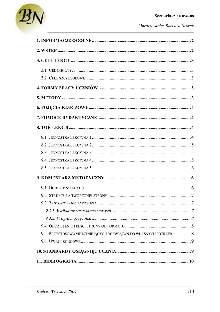 Scenariusz na awans Opracowanie: Barbara Nowak 1. INFORMACJE OGÓLNE......................................................................................... 2 2. WSTĘP ........................................................................................................................ 2 3. CELE LEKCJI............................................................................................................ 3 3.1. CEL OGÓLNY ........................................................................................................... 3 3.2. CELE SZCZEGÓŁOWE ............................................................................................... 3 4. FORMY PRACY UCZNIÓW ................................................................................... 3 5. METODY .................................................................................................................... 3 6. POJĘCIA KLUCZOWE............................................................................................ 4 7. POMOCE DYDAKTYCZNE .................................................................................... 4 8. TOK LEKCJI.............................................................................................................. 4 8.1. JEDNOSTKA LEKCYJNA 1......................................................................................... 4 8.2. JEDNOSTKA LEKCYJNA 2......................................................................................... 5 8.3. JEDNOSTKA LEKCYJNA 3......................................................................................... 5 8.4. JEDNOSTKA LEKCYJNA 4......................................................................................... 5 8.5. JEDNOSTKA LEKCYJNA 5......................................................................................... 6 9. KOMENTARZ METODYCZNY ............................................................................. 6 9.1. DOBÓR PRZYKŁADU ................................................................................................ 6 9.2. STRUKTURA TWORZONEJ STRONY ........................................................................... 7 9.3. ZASTOSOWANE NARZĘDZIA .................................................................................... 7 9.3.1. Walidator stron internetowych ....................................................................... 7 9.3.2. Program gżegżółka ......................................................................................... 8 9.4. ODDZIELENIE TREŚCI STRONY OD FORMATU ........................................................... 8 9.5. PRZYSTOSOWANIE ISTNIEJĄCYCH ROZWIĄZAŃ DO WŁASNYCH POTRZEB ................ 8 9.6. UWAGI KOŃCOWE ................................................................................................... 9 10. STANDARDY OSIĄGNIĘĆ UCZNIA................................................................... 9 11. BIBLIOGRAFIA .................................................................................................... 10 Kielce, Wrzesień 2004 1/10 Scenariusz na awans Opracowanie: Barbara Nowak 1. Informacje ogólne Tytuł cyklu: Technologia Informacyjna Etap edukacyjny: szkoły ponadgimnazjalne Temat: Tworzenie stron www – elementy stylu Czas trwania: 5 jednostek lekcyjnych 2. Wstęp Zagadnienie tworzenia stron www realizowane jest z uczniami już w gimnazjum i kontynuowane w szkole ponadgimnazjalnej, zarówno w zakresie podstawowym (Technologia Informacyjna) jak i rozszerzonym (Informatyka). Narzędzia informatyczne rozwijają się nieustannie, dlatego też od nauczyciela oczekuje się dynamicznego podejścia do realizacji przedmiotu. Aktualizacja propozycji zawartych w obowiązujących podręcznikach, poprzez dostępną literaturę i oprogramowanie, pozwala uczniom dostrzec w sposób naturalny i praktyczne tendencje w rozwoju narzędzi TI. Ukazanie się na rynku pozycji [1] zwraca uwagę na nowe standardy dla tworzenia stron internetowych. Niniejszy scenariusz prezentuje koncepcję zajęć nt. tworzenia stron www z uwzględnieniem następujących elementów: • tworzenie kodu w języku XHTML, • oddzielenie treści od formatowania poprzez definicję stylów, • kontrola formalna kodu (walidacja). Nowością tego podejścia w stosunku do oferty książkowej jest wprowadzenie języka XHTML zamiast HTML, stosowanie walidacji kodu źródłowego, zwrócenie uwagi na problemy związane z kodowaniem polskich znaków i przedstawienie sposobu ich rozwiązania. Kielce, Wrzesień 2004 2/10 Scenariusz na awans Opracowanie: Barbara Nowak 3. Cele lekcji 3.1. Cel ogólny Rozwijanie umiejętności tworzenia stron www z uwzględnieniem nowych standardów. 3.2. Cele szczegółowe W wyniku realizacji jednostek lekcyjnych, uczeń potrafi: - Opanować podstawowe pojęcia języka XHTML (element, znacznik otwierający, znacznik zamykający, element pusty, element niepusty), - Utworzyć podstawową strukturę dokumentu XHTML, - Przystosować gotowy szablon dla własnej strony: zlikwidować zbędne fragmenty, wpisać swoje treści we właściwe miejsce, zmodyfikować strukturę, - Zaprojektować właściwą nawigację między stronami witryny www, - Zdefiniować własne style, - Zaadaptować gotowe style, - Zastosować style do sformatowania treści, - Skorzystać z programu walidacyjnego do uzyskania kodu poprawnego od strony formalnej, - Dokonać odpowiedniej konwersji kodu, aby uzyskać w przeglądarkach poprawny wygląd polskich znaków, - Przesłać własną stronę na serwer www. 4. Formy pracy uczniów - Jednostkowa (każdy uczeń wykonuje samodzielnie tę samą czynność), - Zespołowa (2 osoby). 5. Metody - Pogadanka (wstępna, utrwalająca), - Wykład (krótki), - Kierowanie korzystaniem z materiałów źródłowych (wyszukiwanie informacji, programów, itp.) - Kierowanie nabywaniem umiejętności praktycznych. Kielce, Wrzesień 2004 3/10 Scenariusz na awans Opracowanie: Barbara Nowak 6. Pojęcia kluczowe - K