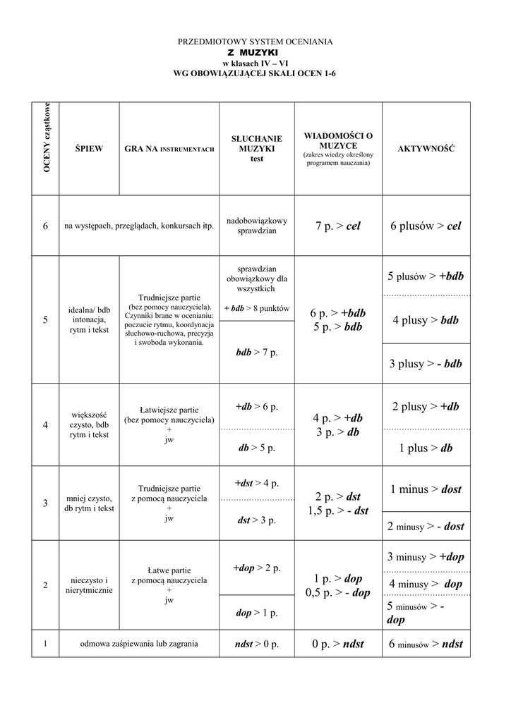 OCENY cząstkowe PRZEDMIOTOWY SYSTEM OCENIANIA Z MUZYKI w klasach IV – VI WG OBOWIĄZUJĄCEJ SKALI OCEN 1-6 6 ŚPIEW GRA NA INSTRUMENTACH na występach, przeglądach, konkursach itp. Trudniejsze partie 5 4 3 2 idealna/ bdb intonacja, rytm i tekst większość czysto, bdb rytm i tekst mniej czysto, db rytm i tekst nieczysto i nierytmicznie (bez pomocy nauczyciela). Czynniki brane w ocenianiu: poczucie rytmu, koordynacja słuchowo-ruchowa, precyzja i swoboda wykonania. Łatwiejsze partie (bez pomocy nauczyciela) + jw Trudniejsze partie z pomocą nauczyciela + jw Łatwe partie z pomocą nauczyciela + jw WIADOMOŚCI O MUZYCE SŁUCHANIE MUZYKI test (zakres wiedzy określony programem nauczania) nadobowiązkowy sprawdzian 7 p. > cel sprawdzian obowiązkowy dla wszystkich + bdb > 8 punktów 6 p. > +bdb 5 p. > bdb 4 p. > +db 3 p. > db 2 p. > dst 1,5 p. > - dst odmowa zaśpiewania lub zagrania ndst > 0 p. 1 minus > dost 2 minusy > - dost 3 minusy > +dop 1 p. > dop 0,5 p. > - dop 4 minusy > dop 5 minusów > dop dop > 1 p. 1 2 plusy > +db 1 plus > db +dst > 4 p. +dop > 2 p. 4 plusy > bdb 3 plusy > - bdb db > 5 p. dst > 3 p. 6 plusów > cel 5 plusów > +bdb bdb > 7 p. +db > 6 p. AKTYWNOŚĆ 0 p. > ndst 6 minusów > ndst OCENĘ CELUJĄCĄ na końcu półrocza OTRZYMUJE UCZEŃ, KTÓRY: spełnia wymagania dotyczące uzyskania oceny bardzo dobrej spełnia jeden z dwóch niżej podanych nadobowiązkowych warunków: wytrwale i systematycznie uczestniczy w zajęciach chóru szkolnego oraz bierze udział w występach tegoż zespołu w co najmniej 50% zalicza sprawdzian półroczny lub końcoworoczny OCENĘ BARDZO DOBRĄ na końcu półrocza OTRZYMUJE UCZEŃ, KTÓRY: • sprawnie posługuje się zdobytymi wiadomościami • samodzielnie potrafi zaśpiewać z pamięci i bardzo dobrą intonacją wybraną piosenkę, zagrać wybrany utwór, chętnie muzykuje w zespole i wykazuje się inwencją twórczą • bardzo dobrze i chętnie wywiązuje się z powierzonych zadań - wyróżnia się aktywnością i inicjatywą • umiejętnie korzysta z podręcznika i ew. innych pomocy naukowych oraz prowadzi zeszyt lub spełnia jeden z dwóch podanych nadobowiązkowych warunków podanych przy ocenie celującej: spełnia wymagania dotyczące oceny dobrej OCENĘ DOBRĄ na końcu półrocza OTRZYMUJE UCZEŃ, KTÓRY: • opanował wiedzę i umiejętności pozwalające wykonanie zadań • dobrze wykonuje polecenia i zadania • jest aktywny • sprawnie posługuje się informacjami zawartymi w podręczniku i prowadzi zeszyt lub spełnia jeden z dwóch podanych nadobowiązkowych warunków podanych przy ocenie celującej: spełnia wymagania dotyczące oceny dostatecznej OCENĘ DOSTATECZNĄ na końcu półrocza OTRZYMUJE UCZEŃ, KTÓRY: • opanował podstawowe treści nauczania i mało aktywnie udziela się w pracach zespołowych • korzysta z podręcznika i prowadzi zeszyt OCENĘ DOPUSZCZAJĄCĄ na końcu półrocza OTRZYMUJE UCZEŃ, KTÓRY: • nie opanował wiedzy w stopniu dostatecznym, • nie wykazuje aktywności w pracach zespołowych, • korzysta z podręcznika i prowadzi zeszyt OCENĘ NIEDOSTATECZNĄ na końcu półrocza OTRZYMUJE UCZEŃ, KTÓRY: • nie opanował wiedzy i umiejętności zawartych w programie nauczania adekwatnych do poziomu danej klasy - jego wiedza jest nikła • pozostałym uczniom utrudnia wypowiedź muzyczną, stwarza atmosferę niekorzystną dla prezentacji i osiągnięć muzycznych innych uczniów oraz nie bierze udziału w pracach zespołowych, • nie potrafi (lub nie chce) rozwiązać zadań (lub wykonać poleceń) o elementarnym stopniu trudności, nie wykazuje chęci śpiewania, grania, improwizowania, omawiania słuchanych utworów oraz nie korzysta z podręcznika i zeszytu WYMAGANIA EDUKACYJNE NIEZBĘDNE DO UZYSKANIA POSZCZEGÓLNYCH, ŚRÓDROCZNYCH I ROCZNYCH OCEN Z MUZYKI Każdy uczeń uzyskuje w ciągu jednego półrocza co najmniej jedną ocenę z następujących „działów”: ŚPIEW: o Opanowanie obowiązkowego repertuaru do wykonania: Hymn Państwowy i szkolny, wybrane pieśni patriotyczne, losowo wybrana kolęda spośród najbardziej popularnych i druga uczona na zajęciach, piosenki ludowe i popularne. o Wykonanie w parach na tle śpiewającej klasy. o Dodatkowy repertuar: piosenki związane z uroczystościami szkolnymi (najczęściej dopasowane do kalendarium) oraz wybrane z podręcznika do muzyki. GRA NA INSTRUMENTACH: o Opanowanie i wykonanie w grupie instrumentacji lub akompaniamentu wybranej piosenki lub utworu muzycznego, realizowanych na instrumentach perkusyjnych niemelodycznych. SŁUCHANIE MUZYKI: o Rozpoznanie i rozróżnianie, na postawie ponownego słuchania i czytania opisów w zeszycie oraz nabytej wiedzy, 8 utworów spośród wszystkich kompozycji muzycznych wysłuchanych w czasie zajęć jednego półrocza. o Kartkówka (raz na jedno półrocze) ze słuchania muzyki polega na wpisaniu określonej cyfry w pustą rubrykę przy tytule rozpoznanego utworu i nazwisku kompozytora zamieszczonych w opisach. o Można przygotować się w domu, słuchając utworów skopiowanych z komputera szkolnego w bibliotece lub odnaleźć je w Internecie. o Sprawdzian nadobowiązkowy, obejmujący także rozpoznanie i rozróżnianie tych samych utworów, polega na napisaniu tytułu, kompozytora i charakterystycznych cech danego utworu bez korzystania z opisów. (Konieczność słuchania skopiowanych nagrań w domu). WIADOMOŚCI O MUZYCE Uczeń w czasie zajęć odpowiada na minimum jedno pytanie dotyczące wiadomości z poprzednich lekcji (materiał do opanowania znajduje się w podręczniku i zeszycie). Za prawidłową odpowiedź uzyskuje 1 plus (wiadomości określone jako podstawowe) lub 2 plusy (wiadomości ponadpodstawowe). Po 5 „przepytanych” zajęciach uczeń uzyskuje ocenę (patrz tabelka) AKTYWNOŚĆ ucznia na zajęciach: + słucha i czyta ze zrozumieniem, wyciąga wnioski, śledzi tok lekcji, + jest twórczy, proponując ciekawe pomysły i rozwiązywania oraz potrafi je 