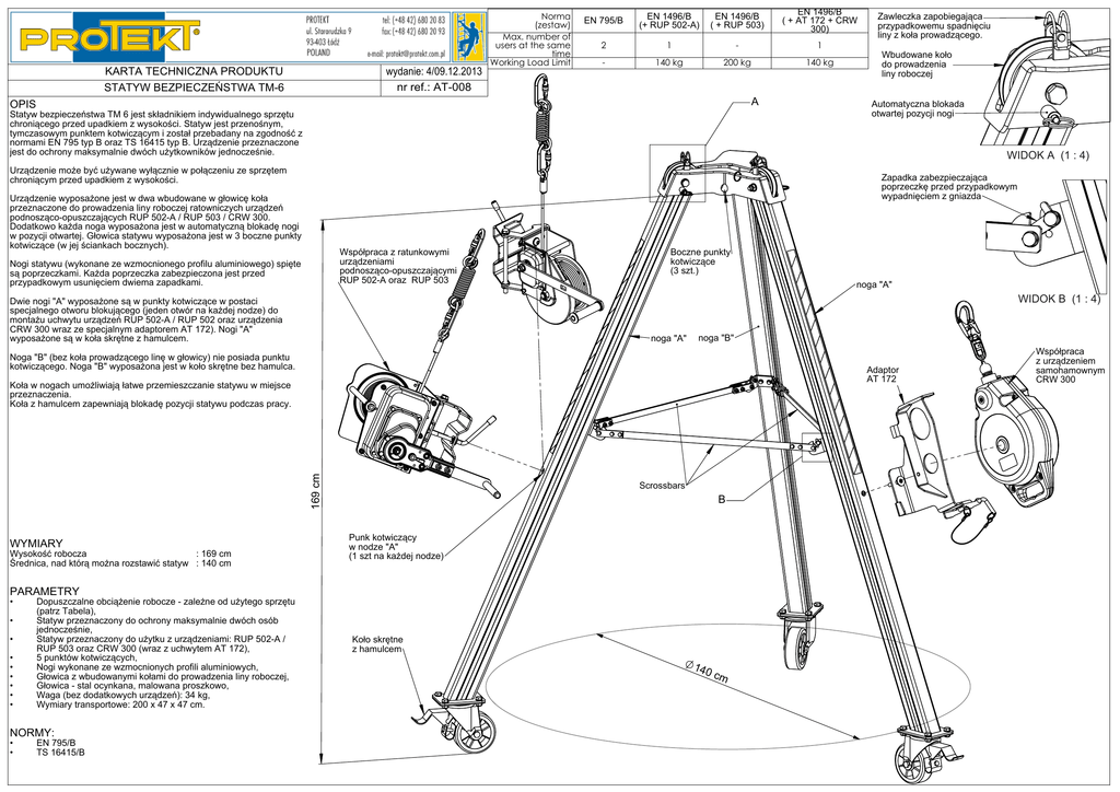 KARTA TECHNICZNA PRODUKTU STATYW BEZPIECZEŃSTWA TM-6 wydanie: 4/09.12.2013 nr ref.: AT-008 Norma (zestaw) Max. number of users at the same time Working Load Limit EN 795/B EN 1496/B (+ RUP 502-A) EN 1496/B ( + RUP 503) EN 1496/B ( + AT 172 + CRW 300) 2 1 - 1 - 140 kg 200 kg 140 kg A OPIS Statyw bezpieczeństwa TM 6 jest składnikiem indywidualnego sprzętu chroniącego przed upadkiem z wysokości. Statyw jest przenośnym, tymczasowym punktem kotwiczącym i został przebadany na zgodność z normami EN 795 typ B oraz TS 16415 typ B. Urządzenie przeznaczone jest do ochrony maksymalnie dwóch użytkowników jednocześnie. ` Urządzenie wyposażone jest w dwa wbudowane w głowicę koła przeznaczone do prowadzenia liny roboczej ratowniczych urządzeń podnosząco-opuszczających RUP 502-A / RUP 503 / CRW 300. Dodatkowo każda noga wyposażona jest w automatyczną blokadę nogi w pozycji otwartej. Głowica statywu wyposażona jest w 3 boczne punkty kotwiczące (w jej ściankach bocznych). Współpraca z ratunkowymi urządzeniami podnosząco-opuszczającymi RUP 502-A oraz RUP 503 Nogi statywu (wykonane ze wzmocnionego profilu aluminiowego) spięte są poprzeczkami. Każda poprzeczka zabezpieczona jest przed przypadkowym usunięciem dwiema zapadkami. noga "A" noga "A" noga "B" Adaptor AT 172 169 cm Koła w nogach umożliwiają łatwe przemieszczanie statywu w miejsce przeznaczenia. Koła z hamulcem zapewniają blokadę pozycji statywu podczas pracy. Scrossbars B Punk kotwiczący w nodze "A" (1 szt na każdej nodze) PARAMETRY • • • • • • • • Dopuszczalne obciążenie robocze - zależne od użytego sprzętu (patrz Tabela), Statyw przeznaczony do ochrony maksymalnie dwóch osób jednocześnie, Statyw przeznaczony do użytku z urządzeniami: RUP 502-A / RUP 503 oraz CRW 300 (wraz z uchwytem AT 172), 5 punktów kotwiczących, Nogi wykonane ze wzmocnionych profili aluminiowych, Głowica z wbudowanymi kołami do prowadzenia liny roboczej, Głowica - stal ocynkana, malowana proszkowo, Waga (bez dodatkowych urządzeń): 34 kg, Wymiary transportowe: 200 x 47 x 47 cm. NORMY: • • EN 795/B TS 16415/B Zapadka zabezpieczająca poprzeczkę przed przypadkowym wypadnięciem z gniazda Boczne punkty kotwiczące (3 szt.) Noga "B" (bez koła prowadzącego linę w głowicy) nie posiada punktu kotwiczącego. Noga "B" wyposażona jest w koło skrętne bez hamulca. • Automatyczna blokada otwartej pozycji nogi WIDOK B (1 : 4) Dwie nogi "A" wyposażone są w punkty kotwiczące w postaci specjalnego otworu blokującego (jeden otwór na każdej nodze) do montażu uchwytu urządzeń RUP 502-A / RUP 502 oraz urządzenia CRW 300 wraz ze specjalnym adaptorem AT 172). Nogi "A" wyposażone są w koła skrętne z hamulcem. Wysokość robocza : 169 cm Średnica, nad którą można rozstawić statyw : 140 cm Wbudowane koło do prowadzenia liny roboczej WIDOK A (1 : 4) Urządzenie może być używane wyłącznie w połączeniu ze sprzętem chroniącym przed upadkiem z wysokości. WYMIARY Zawleczka zapobiegająca przypadkowemu spadnięciu liny z koła prowadzącego. Koło skrętne z hamulcem 140 cm Współpraca z urządzeniem samohamownym CRW 300