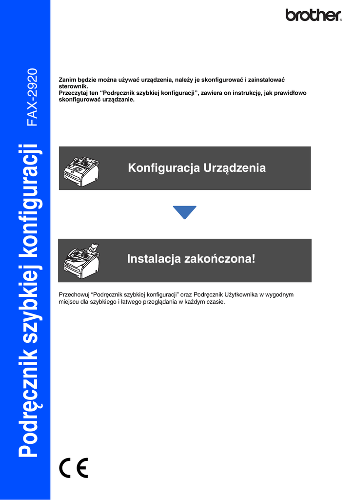 FAX-2920 Podręcznik szybkiej konfiguracji Zanim będzie można używać urządzenia, należy je skonfigurować i zainstalować sterownik. Przeczytaj ten “Podręcznik szybkiej konfiguracji”, zawiera on instrukcję, jak prawidłowo skonfigurować urządzanie. Konfiguracja Urządzenia Instalacja zakończona! Przechowuj “Podręcznik szybkiej konfiguracji” oraz Podręcznik Użytkownika w wygodnym miejscu dla szybkiego i łatwego przeglądania w każdym czasie. ■ Startujemy Zawartość kartonu 1 11 10 2 9 3 Podręcznik szybkiej konfiguracji 8 4 7 6 5 1. Pokrywa panelu sterowania 2. Słuchawka telefonu 3. Podpórka wyjścia dokumentu ADF 4. Szczelina podawania ręcznego 5. Taca papieru 6. Wyłącznik zasilania 7. Pokrywa przednia 8. Odwróć tacę wyjściową do góry dnem Klapka podpierająca z przedłużeniem 9. Panel sterowania 10. Automatyczny Podajnik Dokumentów (ADF) 11. ADF Podpórka dokumentu Podpórka wyjścia dokumentu ADF Montaż zespołu bębna Podręcznik użytkownika Słuachwak telefonu Spiralny przewód słuchawki (wraz z wkładem tonera) Przewód linii telefonicznej Przewód zasilania AC Zawartość kartonu może się różnić w zależności od kraju. Zachowaj wszystkie materiały opakowaniowe i karton. 2 Ostrzeżenie Nieprawidłowa konfiguracja Uwaga Podręcznik użytkownika Podaje ostrzeżenia, które muszą być przestrzegane w celu uniknięcia możliwych obrażeń osób. Ostrzega, że urządzenia i Podaje uwagi i przydatne Wskazuje odwołania do działania nie są zgodne z wskazówki, o których Podręcznika tym urządzeniem. należy pamiętać podczas użytkownika. użytkowania urządzenia. Panel sterowania FAX-2920 11 10 9 01/03 15:25 1 2 8 7 6 FAX 3 4 5 1. Klawisze wybierania jednoprzyciskowego 2. Klawisze faksu i telefonu: 3. Klawisze nawigacji 4. Klawisze wybierania 5. Start key 6. Klawisze Stop/Exit (Stop/Zakończ) 7. Klawisze raportów (Raporty) 8. Klawisze trybu: 9. Wyświetlacz ciekłokrystaliczny (LCD) 10. Klawisz opcji kopiowania 11. Klawisz przesunięcia Szczegóły panelu sterowania - patrz "Przegląd panelu sterowania" w Rozdziale 1 Instrukcji użytkownika. 3 Konfiguracja Urządzenia Zamocuj podpórkę 1 wyjściową dokumentu ADF 1 Wyciągnij podpórkę dokumentu ADF. 2 Otwórz pokrywę panelu sterowania, unosząc ją do tyłu. Pokrywa panelu sterowania 3 Zamocuj podpórkę wyjścia dokumentu ADF. Podpórka wyjścia dokumentu ADF 4 4 Zamknij pokrywę panelu sterowania. 2 1 Zainstaluj słuchawkę telefonu Podłącz spiralny przewód słuchawki do urządzenia, a drugi koniec do słuchawki. 3 Zainstaluj zespół bębna 1 4 Wstaw zespół bębna do urządzenia. 5 Zamknij pokrywę przednią urządzenia. Otwórz pokrywę przednią urządzenia. Pokrywa przednia 2 Rozpakuj zespół bębna. 3 Delikatnie przechyl go z boku na bok kilkakrotnie w celu równomiernego rozprowadzenia tonera wewnątrz zespołu. 5 Konfiguracja urządzenia Umieść papier na tacy 4 papieru 1 4 Umieść papier na tacy papieru. Sprawdź, czy papier leży płasko na tacy i czy znajduje się poniżej znaku maksimum papieru. Wyciągnij całkowicie tacę papieru z urządzenia. Znak maksimum papieru 2 3 Naciskając dźwignię zwalniania prowadnicy papieru, przesuwaj regulatory dopasowując je do rozmiaru papieru. Sprawdź, czy prowadnice są mocno osadzone w szczelinach. Przekartkuj dobrze ryzę papieru w celu uniknięcia zacięć papieru i złego podawania. 5 Wsuń mocno tacę papieru do tyłu urządzenia i zanim przystąpisz do użytkowania urządzenia odegnij klapkę podpierania tacy wyjściowej. Odegnij klapkę podpierania tacy wyjściowej W celu uzyskania dalszych szczegółów, patrz “O papierze” w Rozdziale 1 „Podręcznik użytkownika”. 6 Instalowanie przewodu 5 zasilania i przewodu linii telefonicznej 1 Upewnij się, że wyłącznik zasilania jest wyłączony. Podłącz do urządzenia kabel zasilania sieciowego. Ostrzeżenie ■ Urządzenie musi być wyposażone we wtyczkę z uziemieniem. ■ Ponieważ urządzenie jest uziemiane przez wyjście zasilania, możesz zabezpieczyć się przed potencjalnie groźnymi stanami elektrycznymi w sieci telefonicznej podłączając przewód linii telefonicznej do urządzenia, gdy kabel zasilania jest podłączony do urządzenia. Podobnie, możesz się zabezpieczyć, gdy chcesz przenieść urządzenie, poprzez odłączenie najpierw przewodu linii telefonicznej, a następnie przewodu zasilającego. Jeżeli współużytkujesz jedną linie telefoniczną z telefonem zewnętrznym, podłącz ją tak, jak pokazano poniżej. 2 Podłącz kabel zasilania sieciowego do gniazdka sieci prądu zmiennego. Włącz wyłącznik zasilania. 3 Podłącz jeden koniec przewodu linii telefonicznej do gniazda na urządzeniu oznaczonego LINIA, a drugi koniec do gniazdka ściennego. Jeżeli współużytkujesz jedną linię telefoniczną z zewnętrzną automatyczną sekretarką, podłącz ją tak, jak pokazano poniżej. TAD TAD 7 Konfiguracja urządzenia 6 Ustawianie daty i czasu Urządzenie wyświetla datę i czas oraz drukuje je na każdym wysyłanym faksie. 1 2 3 4 Naciśnij Menu/Set (Menu/Ustaw). Naciśnij 0. Naciśnij 2. Wprowadź ostatnie dwie cyfry roku, a następnie naciśnij Menu/Set (Menu/Ustaw). 7 ID stacji Należy wpisać nazwisko i numer faksu, aby były one drukowane na wszystkich stronach wysyłanego faksu. 1 2 3 4 ROK:2005 Wprowadź dwie cyfry miesiąca, a następnie naciśnij Menu/Set (Menu/Ustaw). 5 MIESIĄC:03 (np. wprowadź 0 3 dla marca) 6 Wprowadź dwie cyfry dnia, a następnie naciśnij Menu/Set (Menu/Ustaw). DZIEŃ:01 Na panelu przyciskowym wprowadź czas w formacie 24-godzinnym, a następnie naciśnij Menu/Set (Menu/Ustaw). GODZ:15:25 (np. wprowadź 1, 5, 2, 5 dla 3:25 po południu) 8 Naciśnij Stop/Exit (Stop/Zakończ). Jeżeli pomyliłeś się, naciśnij Stop/Exit (Stop/Zakończ) by rozpocząć od Kroku 1. Naciśnij 3. Na panelu przycisków wprowadź numer swojego faksu (do 20 cyfr), a następnie naciśnij Menu/Set (Menu/Ustaw). Wpisz numer