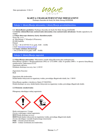 Data sporządzenia: 15.06.15 KARTA CHARAKTERYSTYKI MIESZANINY Pachnąca Saszetka do Szafy De Mole Strong GOŹDZIK Sekcja 1: Identyfikacja mieszaniny i identyfikacja przedsiębiorstwa. 1.1 Identyfikator produktu: Pachnąca Saszetka do Szafy De Mole Strong GOŹDZIK 1.2 Istotne zidentyfikowane zastosowania mieszaniny oraz zastosowania odradzane: Środek zapachowy do wnętrz. 1.3 Dane dotyczące dostawcy karty charakterystyki: Nowe Sp. z o.o. ul. Sikorskiego 17 Klaudyn k/Warszawy 05-080 Izabelin Poland tel./fax + 48 22 839 88 55 (w godz. 8:00 – 16:00) e-mail: [email protected] 1.4 Numer telefonu alarmowego + 48 22 839 88 55 (w godz. 8:00 – 16:00) Sekcja 2: Identyfikacja zagrożeń 2.1 Klasyfikacja mieszaniny: Mieszanina została sklasyfikowana jako niebezpieczna. Klasyfikacja zgodnie z Rozporządzeniem (WE) nr 1272/2008 z dnia 16 grudnia 2008 r. w sprawie klasyfikacji, oznakowania i pakowania (CLP) Zagrożenia zdrowia: Działanie drażniące na oczy, kat. 2, H319 Zagrożenia fizyczne: Brak Zagrożenie dla środowiska: Działa bardzo toksycznie na organizmy wodne, powodując długotrwałe skutki, kat. 1 H410 Klasyfikacja zgodnie z dyrektywy Rady 67/548/EWG: Działa drażniąco na oczy, działa bardzo toksycznie na organizmy wodne, powodując długotrwałe skutki. 2.2 Elementy oznakowania: Piktogramy określające rodzaj zagrożenia: Hasło ostrzegawcze: Uwaga Zwroty wskazujące rodzaj zagrożenia: H319 Działa drażniąco na oczy H410 Działa bardzo toksycznie na organizmy wodne, powodując długotrwałe skutki Zwroty określające warunki bezpiecznego stosowania: P102 – Chronić przed dziećmi. P273 – Unikać uwolnienia do środowiska. Strona 1 z 7 Data sporządzenia: 15.06.15 KARTA CHARAKTERYSTYKI MIESZANINY Pachnąca Saszetka do Szafy De Mole Strong GOŹDZIK P305 + P351 + P338 – w przypadku dostania się do oczu: Ostrożnie płukać wodą przez kilka minut. Wyjąć soczewki kontaktowe, jeżeli są i można je łatwo usunąć. Nadal płukać. P501 – Zawartość/pojemnik usuwać do kontenerów przeznaczonych do selektywnej zbiórki odpadów. Zawiera: salicylan benzylu, eugenol, aldehyd α-heksylocynamylowy, cytronellol, geraniol, lyral, alkohol cynamonowy, olejek goździkowy, izoeugenol, słodki olejek pomarańczowy, aldehyd cyklamenowy. Może powodować wystąpienie reakcji alergicznej. 2.3 Inne zagrożenia: Brak. Mieszanina nie spełnia kryteriów PBT i vPvB zgodnie z załącznikiem XIII do rozporządzenia (WE) nr 1907/2006. Sekcja 3: Skład i informacja o składnikach 3.2 Mieszanina Opis mieszaniny: wióry olchowe nasączone roztworem związków organicznych Składniki niebezpieczne: Nazwa Empenthrin MMB (3-metoksy-3-metylobutan-1-ol) 2-fenyloetanol Salicylan benzylu BENZYL SALICYLATE Eugenol EUGENOL 2-benzylidenooktanal HEXYL CINNAMAL Linalol LINALOOL Numery CAS: 54406-48-3 WE: 259-154-4 CAS: 56539-66-3 WC: 260-252-4 CAS: 60-12-8 WE: 200-456-2 CAS: 118-58-1 WE: 204-262-9 CAS: 97-53-0 WE: 202-589-1 CAS: 101-86-0 WE: 202-983-3 CAS: 78-70-6 WE: 201-134-4 Cytrolellol CITRONELLOL CAS: 106-22-9 WE: 203-375-0 GERANIOL CAS: 106-24-1 WE: 203-377-1 Numery rejestr. REACH: Klasyfikacja 1272/2008 nie posiada w chwili obecnej Aquatic Acute 1: H400, numeru rejestracyjnego Aquatic Chronic 1: H410 % wag 01-2119976333-33-xxxx Eye Irrit. 2: H319 5 – 10 01-2119963921-31-xxxx Eye Irrit. 2; H319 1–2 Skin Sens. 1, H317 Eye Irrit. 2: H319 Aquatic Chronic 2; H411 Eye Irrit. 2; H319 01-2119971802-33-xxxx Skin Sens. 1, H317 nie posiada w chwili obecnej Skin Sens. 1, H317, numeru rejestracyjnego Aquatic Chronic 2; H411 Eye Irrit. 2; H319 01-2119474016-42 -xxxx Skin Irrit. 2, H315 Eye Irrit. 2; H319 01-2119453995-23-xxxx Skin Irrit. 2, H315 Skin Sens. 1, H317 Eye Irrit. 2; H319 nie posiada w chwili obecnej Skin Irrit. 2, H315 numeru rejestracyjnego Skin Sens. 1, H317 01-2119969442-31-xxxx 2–5 0,5 – 0,1 0,5 – 1,0 0,2 – 0,5 0,2 – 0,5 0,2 – 0,5 0,2 – 0,5 Pełna treść przytoczonych zwrotów wskazujących rodzaj zagrożenia znajduje się w rozdziale 16. Sekcja 4: Środki pierwszej pomocy 4.1 Opis środków pierwszej pomocy Drogi narażenia: przez drogi oddechowe, przez kontakt ze skórą, z oczami oraz przez przewód pokarmowy. W przypadku wdychania: W razie zawrotów głowy lub nudności wyprowadzić poszkodowanego na świeże powietrze, w razie braku szybkiej poprawy zasięgnąć porady lekarza. W przypadku kontaktu ze skórą: Zdjąć zanieczyszczoną odzież. Umyć skórę wodą z mydłem. W przypadku poparzenia nałożyć jałowy opatrunek. W przypadku trwałego podrażnienia skóry zwrócić się do lekarza. W przypadku kontaktu z oczami: Usunąć szkła kontaktowe. Płukać oczy z otwartą powieką przez kilka minut dużą ilością wody. Niezwłocznie zasięgnąć porady lekarza. W przypadku połknięcia: Nie powodować wymiotów. Przepłukać jamę ustną i wypić dużą ilość wody. W przypadku utrzymującej się dolegliwości zasięgnąć porady lekarza. 4.2 Najważniejsze ostre i opóźnione objawy oraz skutki narażenia Brak. Strona 2 z 7 Data sporządzenia: 15.06.15 KARTA CHARAKTERYSTYKI MIESZANINY Pachnąca Saszetka do Szafy De Mole Strong GOŹDZIK 4.3. Wskazania dotyczące wszelkiej natychmiastowej pomocy lekarskiej i szczególnego postępowania z poszkodowanym O sposobie postępowania decyduje lekarz po ocenie stanu poszkodowanego. Sekcja 5: Postępowanie w przypadku pożaru 5.1. Środki gaśnicze Właściwe środki gaśnicze: Dwutlenek węgla, piana, proszek lub strumień wody. Środki gaśnicze, których nie wolno używać: Strumień wody pod wysokim ciśnieniem. 5.2. Szczególne zagrożenia związane z mieszaniną Mieszanina nie jest palna. W wyniku działania podwyższonej temperatury mogą wydzielać się szkodliwe gazy. 5.3. Informacje dla straży pożarnej Podczas gaszenia pożaru stosować urządzenia oddechowe z własnym obiegiem powietrza i odzież ochronną na całą sylwetkę. Sekcja 6: Postępowanie w przypadku niezamierzonego uwolnienia do środowiska 6.1 In