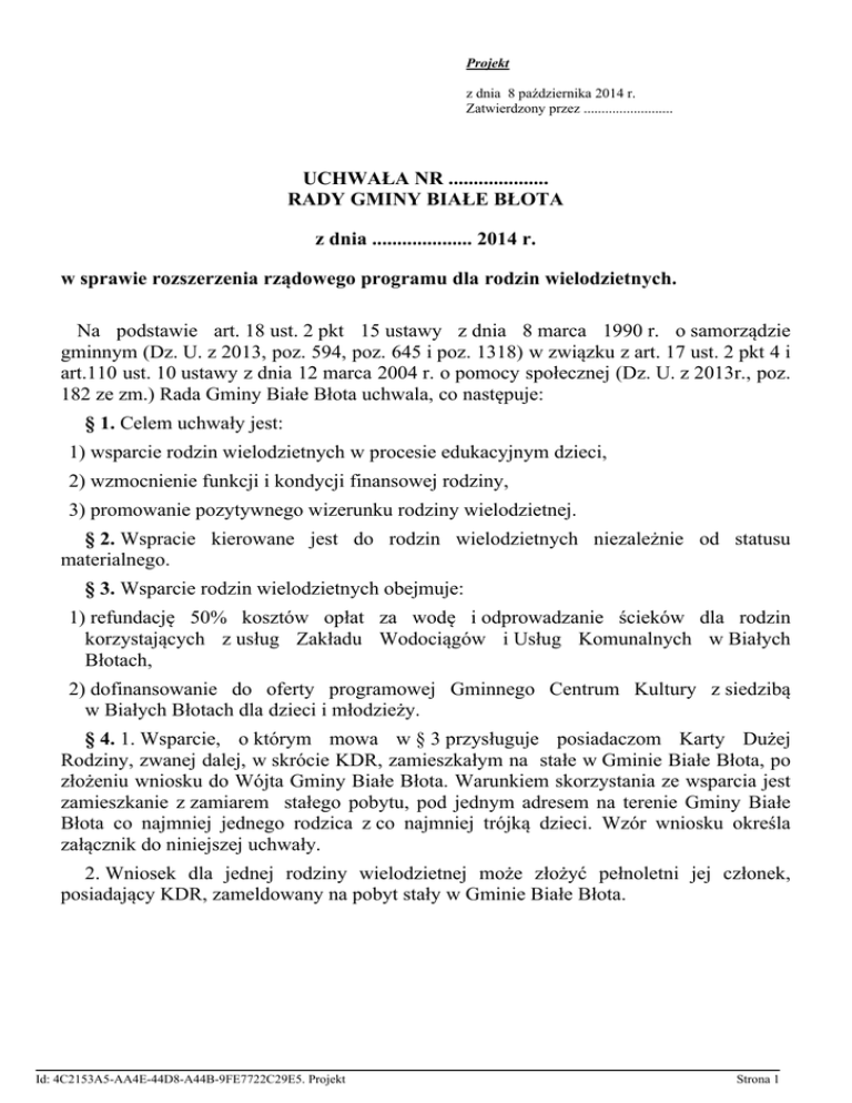 Projekt z dnia 8 października 2014 r. Zatwierdzony przez ......................... UCHWAŁA NR .................... RADY GMINY BIAŁE BŁOTA z dnia .................... 2014 r. w sprawie rozszerzenia rządowego programu dla rodzin wielodzietnych. Na podstawie art. 18 ust. 2 pkt 15 ustawy z dnia 8 marca 1990 r. o samorządzie gminnym (Dz. U. z 2013, poz. 594, poz. 645 i poz. 1318) w związku z art. 17 ust. 2 pkt 4 i art.110 ust. 10 ustawy z dnia 12 marca 2004 r. o pomocy społecznej (Dz. U. z 2013r., poz. 182 ze zm.) Rada Gminy Białe Błota uchwala, co następuje: § 1. Celem uchwały jest: 1) wsparcie rodzin wielodzietnych w procesie edukacyjnym dzieci, 2) wzmocnienie funkcji i kondycji finansowej rodziny, 3) promowanie pozytywnego wizerunku rodziny wielodzietnej. § 2. Wspracie kierowane jest do rodzin wielodzietnych niezależnie od statusu materialnego. § 3. Wsparcie rodzin wielodzietnych obejmuje: 1) refundację 50% kosztów opłat za wodę i odprowadzanie ścieków dla rodzin korzystających z usług Zakładu Wodociągów i Usług Komunalnych w Białych Błotach, 2) dofinansowanie do oferty programowej Gminnego Centrum Kultury z siedzibą w Białych Błotach dla dzieci i młodzieży. § 4. 1. Wsparcie, o którym mowa w § 3 przysługuje posiadaczom Karty Dużej Rodziny, zwanej dalej, w skrócie KDR, zamieszkałym na stałe w Gminie Białe Błota, po złożeniu wniosku do Wójta Gminy Białe Błota. Warunkiem skorzystania ze wsparcia jest zamieszkanie z zamiarem stałego pobytu, pod jednym adresem na terenie Gminy Białe Błota co najmniej jednego rodzica z co najmniej trójką dzieci. Wzór wniosku określa załącznik do niniejszej uchwały. 2. Wniosek dla jednej rodziny wielodzietnej może złożyć pełnoletni jej członek, posiadający KDR, zameldowany na pobyt stały w Gminie Białe Błota. Id: 4C2153A5-AA4E-44D8-A44B-9FE7722C29E5. Projekt Strona 1 § 5. Do identyfikacji uprawnień na terenie Gminy Białe Błota, wykorzystywana jest Karta Dużej Rodziny wydana na podstawie uchwały Rady Ministrów z dnia 27 maja 2014 r. w sprawie szczegółowych warunków realizacji rządowego programu dla rodzin wielodzietnych oraz Rozporządzenia Rady Ministrów z dnia 27.05.2014 (Dz. U. 755 z późn. zm.). § 6. Środki niezbędne na realizację wsparcia, o których mowa w § 3 pochodzić będą z budżetu Gminy Białe Błota. § 7. 1. Realizatorem wsparcia jest Gminny Ośrodek Pomocy Społecznej Gminy Białe Błota. 2. Realizator wsparcia przedstawia Radzie Gminy informację z realizacji wsparcia za poprzedni rok, zamieszczoną w sprawozdaniu rocznym z działalności ośrodka. § 8. Promocja działań obejmować będzie ogłoszenia w Biuletynie Informacyjnym Gminy Białe Błota oraz na stronie internetowej Urzędu Gminy Białe Błota. § 9. Uchwała podlega publikacji w Dzienniku Urzędowym Województwa KujawskoPomorskiego i wchodzi w życie z dniem 1 stycznia 2015 roku Id: 4C2153A5-AA4E-44D8-A44B-9FE7722C29E5. Projekt Strona 2 Załącznik do Uchwały Nr .................... Rady Gminy Białe Błota z dnia .................... 2014r. WNIOSEK O PRZYZNANIE WSPARCIA DLA RODZIN WIELODZIETNYCH W GMINIE BIAŁE BŁOTA W RAMACH KARTY DUŻEJ RODZINY ……………………………. ………………………………….. (Miejscowość) (Data: dd/mm/rrrr) Dane wnioskodawcy Imię (imiona): Nazwisko: Data urodzenia: dd/mm/rrrr PESEL: 2) Adres zamieszkania Ulica: Numer domu: Numer lokalu: Gmina/Dzielnica: Kod pocztowy: Miejscowość/Poczta: Ulica: Numer domu: Numer lokalu: Gmina: Kod pocztowy: Miejscowość/Poczta: Adres do korespondencji3) Wnoszę o przyznanie wsparcia od Gminy Białe Błota w ramach Karty Dużej Rodziny w formie refundacji 50% kosztów opłat za wodę i odprowadzanie ścieków oraz dofinansowanie do oferty programowej Gminnego Centrum Kultury z siedzibą w Białych Błotach dla dzieci i młodzieży; dla następujących członków rodziny wielodzietnej: 1. Dane członka rodziny wielodzietnej Imię (imiona): Nazwisko: Data urodzenia: dd/mm/rrrr PESEL: 2) Zaznaczyć właściwy kwadrat: Planowany termin ukończenia nauki w danej szkole lub szkole wyższej: dd/mm/rrrr 4) □ rodzic; □ dziecko Id: 4C2153A5-AA4E-44D8-A44B-9FE7722C29E5. Projekt Strona 3 □ dziecko legitymujące się orzeczeniem o umiarkowanym albo znacznym stopniu niepełnosprawności. 2. Dane członka rodziny wielodzietnej Imię (imiona): Nazwisko: Data urodzenia: dd/mm/rrrr PESEL: 2) Zaznaczyć właściwy kwadrat: Planowany termin ukończenia nauki w danej szkole lub szkole wyższej: dd/mm/rrrr 4) □ rodzic; □ dziecko □ dziecko legitymujące się orzeczeniem o umiarkowanym albo znacznym stopniu niepełnosprawności. 3. Dane członka rodziny wielodzietnej Imię (imiona): Nazwisko: Data urodzenia: dd/mm/rrrr PESEL: 2) Zaznaczyć właściwy kwadrat: Planowany termin ukończenia nauki w danej szkole lub szkole wyższej: dd/mm/rrrr 4) □ rodzic; □ dziecko □ dziecko legitymujące się orzeczeniem o umiarkowanym albo znacznym stopniu niepełnosprawności. 4. Dane członka rodziny wielodzietnej Imię (imiona): Nazwisko: Data urodzenia: dd/mm/rrrr PESEL: 2) Zaznaczyć właściwy kwadrat: Planowany termin ukończenia nauki w danej szkole lub szkole wyższej: dd/mm/rrrr 4) □ rodzic; □ dziecko □ dziecko legitymujące się orzeczeniem o umiarkowanym albo znacznym stopniu niepełnosprawności. 5. Dane członka rodziny wielodzietnej Imię (imiona): Nazwisko: Data urodzenia: dd/mm/rrrr PESEL: 2) Zaznaczyć właściwy kwadrat: Planowany termin ukończenia nauki w danej szkole lub szkole wyższej: dd/mm/rrrr 4) □ rodzic; □ dziecko □ dziecko legitymujące się orzeczeniem o umiarkowanym albo znacznym stopniu niepełnosprawności. Id: 4C2153A5-AA4E-44D8-A44B-9FE7722C29E5. Projekt Strona 4 6. Dane członka rodziny wielodzietnej Imię (imiona): Nazwisko: Data urodzenia: dd/mm/rrrr PESEL: 2) Zaznaczyć właściwy kwadrat: Planowany termin ukończenia nauki w danej szkole lub szkole wyższej: dd/mm/rrrr 4) □ rodzi