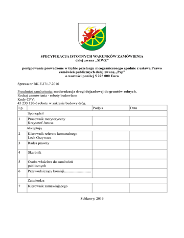 SPECYFIKACJA ISTOTNYCH WARUNKÓW ZAMÓWIENIA dalej zwana „SIWZ” postępowanie prowadzone w trybie przetargu nieograniczonego zgodnie z ustawą Prawo zamówień publicznych dalej zwaną „Pzp” o wartości poniżej 5 225 000 Euro Sprawa nr RK.F.271.7.2016 Przedmiot zamówienia: modernizacja drogi dojazdowej do gruntów rolnych. Rodzaj zamówienia - roboty budowlane Kody CPV: 45 233 120-6 roboty w zakresie budowy dróg. Lp. Podpis Data Sporządził 1 Pracownik merytoryczny Krzysztof Janusz Akceptują 2 Kierownik referatu komunalnego Lech Grzywacz 3 Radca prawny 4 Skarbnik 5 Osoba właściwa do zamówień publicznych 6 Przewodniczący komisji............................. Zatwierdza 7 Kierownik zamawiającego Subkowy, 2016 Spis treści Rozdział Nazwa I Nazwa oraz adres zamawiającego II Tryb udzielania zamówienia III Opis przedmiotu zamówienia IV Termin realizacji zamówienia V Warunki udziału w postępowaniu oraz opis sposobu dokonywania oceny spełniania tych warunków VI Wykaz oświadczeń i dokumentów, jakie mają dostarczyć wykonawcy, w celu potwierdzenia spełnienia warunków udziału w postępowaniu i braku podstaw do wykluczenia z postępowania VII Informacje o sposobie porozumiewania się zamawiającego z wykonawcami oraz przekazywania oświadczeń lub dokumentów, wskazanie osób uprawnionych do porozumiewania się z wykonawcami VIII Wadium IX Termin związania ofertą X Opis sposobu przygotowywania ofert XI Miejsce oraz termin składania i otwarcia ofert XII Opis sposobu obliczenia ceny XIII Opis kryteriów, którymi zamawiający będzie się kierował przy wyborze oferty wraz z podaniem znaczenia tych kryteriów i sposobu oceny ofert. XIV Informacje o formalnościach, jakie powinny zostać dopełnione po wyborze oferty w celu zawarcia umowy w sprawie zamówienia publicznego XV Wymagania dotyczące zabezpieczenia należytego wykonania umowy XVI Istotne dla stron postanowienia, które zostaną wprowadzone do treści zawieranej umowy w sprawie zamówienia publicznego, ogólne warunki umowy albo wzór umowy, jeżeli zamawiający wymaga od wykonawcy, aby zawarł z nim umowę w sprawie zamówienia publicznego na takich warunkach XVII Pouczenie o środkach ochrony prawnej przysługujących wykonawcy w toku postępowania o udziale zamówienia XVIII Składanie ofert częściowych XIX Zamówienia uzupełniające XX Podwykonawcy XXI Postanowienia końcowe Załączniki do SIWZ: Nr 1 - Formularz oferty. Nr 2 - Oświadczenie Wykonawcy o spełnianiu warunków udziału w postępowaniu. Nr 3a i 3b - Oświadczenie Wykonawcy o nie podleganiu wykluczeniu z postępowania. Nr 4 - Wzór umowy w sprawie zamówienia publicznego. Nr 5 - Wykaz narzędzi - sprzętu. Nr 6 - Lista podmiotów należących do tej samej grupy kapitałowej lub informacja o tym, że wykonawca nie należy do grupy kapitałowej. Nr 7 – Przedmiary robót Rozdział I Nazwa i adres zamawiającego Zamawiający - GMINA SUBKOWY ul. Wybickiego19a 83-120 Subkowy NIP: 593-10-04-391 REGON 195675356 Prowadzący - Urząd Gminy Subkowy, postępowanie ul. Wybickiego 19a, 83-120 Subkowy Tel.: 58 5368 529 Fax: 58 5368 530 e-mail: [email protected] strona internetowa: www.bip.subkowy.pl Rozdział II Tryb udzielenia zamówienia Postępowanie prowadzone jest w trybie przetargu nieograniczonego. Rozdział III Opis przedmiotu zamówienia Przedmiotem zamówienia są roboty budowlane związane modernizacją drogi dojazdowej do gruntów rolnych, dz. nr 602 w m. Subkowy. Zamawiający wymaga wykonania prac zgodnie z załączonym przedmiarem robót. Rozdział IV Termin realizacji zamówienia I. Termin realizacji zamówienia: od dnia podpisania umowy do 30 października 2016 r. Rozdział V Warunki udziału w postępowaniu oraz opis sposobu dokonywania oceny spełniania tych warunków (art. 22 ustawy Pzp) I. O udzielenie zamówienia mogą ubiegać się wykonawcy, którzy spełniają warunki dotyczące: 1) posiadania uprawnień do wykonywania określonej działalności lub czynności jeżeli przepisy prawa nakładają obowiązek ich posiadania, 2) posiadania wiedzy i doświadczenia, 3) dysponowania odpowiednim potencjałem technicznym oraz osobami zdolnymi do wykonywania zamówienia, 4) sytuacji ekonomicznej i finansowej. II. Opis sposobu dokonywania oceny spełnienia warunków: 1. Spełnienie warunku dotyczącego posiadania uprawnień do wykonywania określonej działalności lub czynności - Zamawiający nie wymaga posiadania uprawnień nałożonych przez przepisy prawa (koncesja, licencja itp.), w związku z powyższym nie precyzuje się żadnych wymagań, których spełnienie zobowiązany jest wykazać Wykonawca. 2. W celu wykazania spełnienia warunku dotyczącego posiadania wiedzy i doświadczenia, Zamawiający nie precyzuje żadnych wymagań, których spełnienie zobowiązany jest wykazać Wykonawca. 3. W celu wykazania spełnienia warunku dotyczącego dysponowania odpowiednim potencjałem technicznym oraz osobami zdolnymi do wykonywania zamówienia – zamawiający wymaga: 1) potencjał techniczny - posiadanie: a) koparko-ładowarka, b) ciągnika z przyczepą lub samochodu samowyładowczego o ładowności min. 5t, c) walec wibracyjny samojezdny min. 7,5 t. d) rozściełacz do asfaltu – 4.0 m szer. Wykonawca może polegać na potencjale technicznym innych podmiotów, niezależnie od charakteru prawnego łączących go z nimi stosunków. Wykonawca w takiej sytuacji zobowiązany jest udowodnić zamawiającemu, iż będzie dysponował zasobami niezbędnymi do realizacji zamówienia, w szczególności przedstawiając w tym celu pisemne zobowiązanie tych podmiotów do oddania mu do dyspozycji niezbędnych zasobów na okres korzystania z nich przy wykonaniu zamówienia. 2) osoby zdolne do wykonywania zamówienia: - Zamawiający nie precyzuje się żadnych wymagań, których spełnienie zobowiązany jest wykazać Wykonawca. 4. W celu wykazania spełnienia warunku dotyczącego sytuacji ekonomicznej i finansowej Zamawiający nie precyzuje żadnych