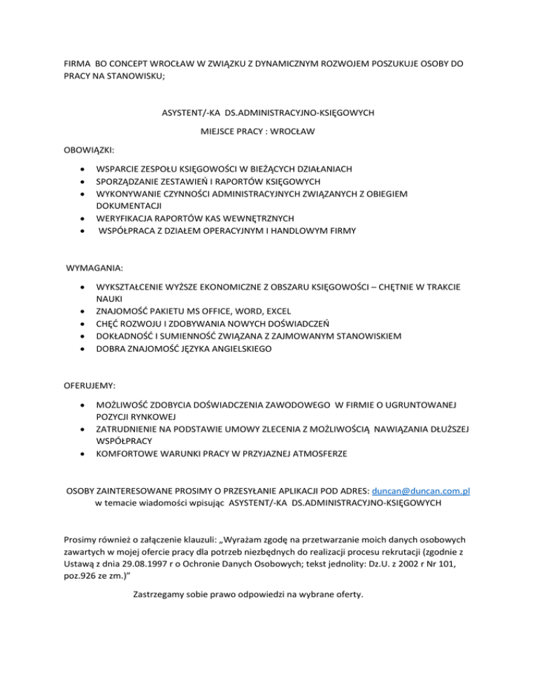 FIRMA BO CONCEPT WROCŁAW W ZWIĄZKU Z DYNAMICZNYM ROZWOJEM POSZUKUJE OSOBY DO PRACY NA STANOWISKU; ASYSTENT/-KA DS.ADMINISTRACYJNO-KSIĘGOWYCH MIEJSCE PRACY : WROCŁAW OBOWIĄZKI: WSPARCIE ZESPOŁU KSIĘGOWOŚCI W BIEŻĄCYCH DZIAŁANIACH SPORZĄDZANIE ZESTAWIEŃ I RAPORTÓW KSIĘGOWYCH WYKONYWANIE CZYNNOŚCI ADMINISTRACYJNYCH ZWIĄZANYCH Z OBIEGIEM DOKUMENTACJI WERYFIKACJA RAPORTÓW KAS WEWNĘTRZNYCH WSPÓŁPRACA Z DZIAŁEM OPERACYJNYM I HANDLOWYM FIRMY WYMAGANIA: WYKSZTAŁCENIE WYŻSZE EKONOMICZNE Z OBSZARU KSIĘGOWOŚCI – CHĘTNIE W TRAKCIE NAUKI ZNAJOMOŚĆ PAKIETU MS OFFICE, WORD, EXCEL CHĘĆ ROZWOJU I ZDOBYWANIA NOWYCH DOŚWIADCZEŃ DOKŁADNOŚĆ I SUMIENNOŚĆ ZWIĄZANA Z ZAJMOWANYM STANOWISKIEM DOBRA ZNAJOMOŚĆ JĘZYKA ANGIELSKIEGO OFERUJEMY: MOŻLIWOŚĆ ZDOBYCIA DOŚWIADCZENIA ZAWODOWEGO W FIRMIE O UGRUNTOWANEJ POZYCJI RYNKOWEJ ZATRUDNIENIE NA PODSTAWIE UMOWY ZLECENIA Z MOŻLIWOŚCIĄ NAWIĄZANIA DŁUŻSZEJ WSPÓŁPRACY KOMFORTOWE WARUNKI PRACY W PRZYJAZNEJ ATMOSFERZE OSOBY ZAINTERESOWANE PROSIMY O PRZESYŁANIE APLIKACJI POD ADRES: [email protected] w temacie wiadomości wpisując ASYSTENT/-KA DS.ADMINISTRACYJNO-KSIĘGOWYCH Prosimy również o załączenie klauzuli: „Wyrażam zgodę na przetwarzanie moich danych osobowych zawartych w mojej ofercie pracy dla potrzeb niezbędnych do realizacji procesu rekrutacji (zgodnie z Ustawą z dnia 29.08.1997 r o Ochronie Danych Osobowych; tekst jednolity: Dz.U. z 2002 r Nr 101, poz.926 ze zm.)” Zastrzegamy sobie prawo odpowiedzi na wybrane oferty.