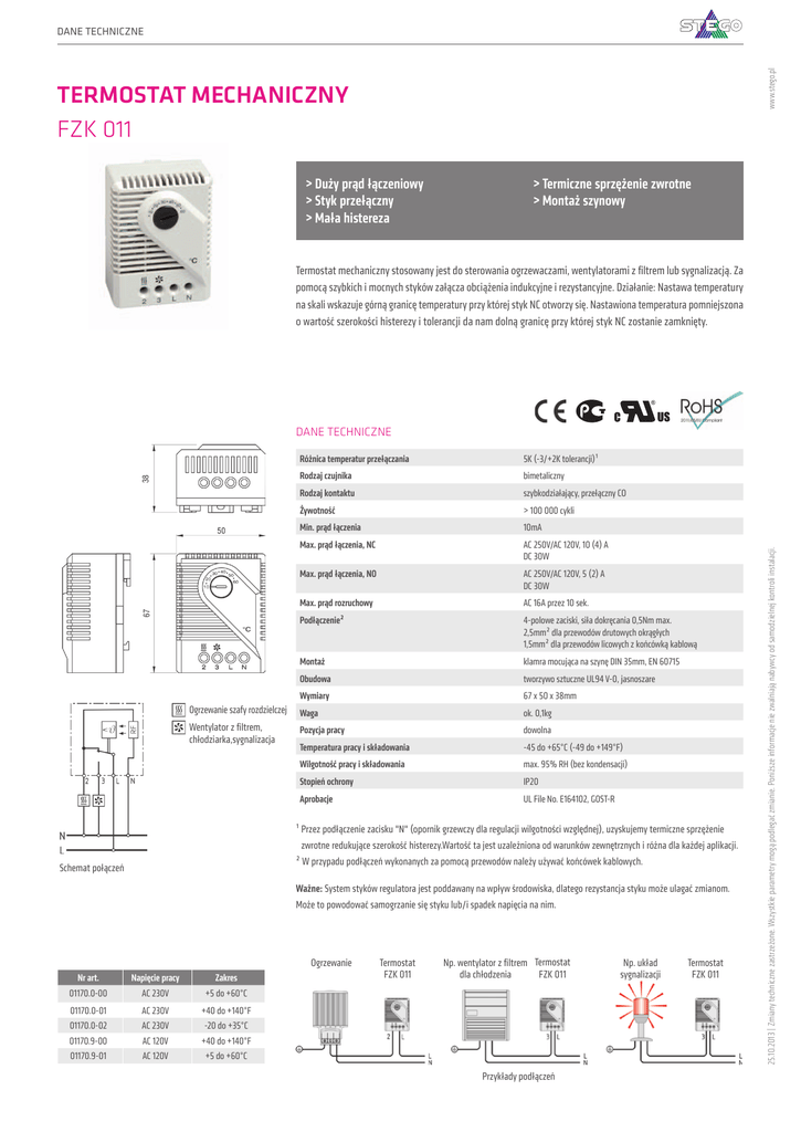 51 REGULACJA www.stego.pl KATALOG PRODUKTÓW STEGO DANE TECHNICZNE TERMOSTAT MECHANICZNY FZK 011 > Duży prąd łączeniowy > Styk przełączny > Mała histereza > Termiczne sprzężenie zwrotne > Montaż szynowy Termostat mechaniczny stosowany jest do sterowania ogrzewaczami, wentylatorami z filtrem lub sygnalizacją. Za pomocą szybkich i mocnych styków załącza obciążenia indukcyjne i rezystancyjne. Działanie: Nastawa temperatury na skali wskazuje górną granicę temperatury przy której styk NC otworzy się. Nastawiona temperatura pomniejszona o wartość szerokości histerezy i tolerancji da nam dolną granicę przy której styk NC zostanie zamknięty. Różnica temperatur przełączania 5K (-3/+2K tolerancji)¹ Rodzaj czujnika bimetaliczny Rodzaj kontaktu szybkodziałający, przełączny CO Żywotność > 100 000 cykli Min. prąd łączenia 10mA Max. prąd łączenia, NC AC 250V/AC 120V, 10 (4) A DC 30W Max. prąd łączenia, NO AC 250V/AC 120V, 5 (2) A DC 30W Max. prąd rozruchowy AC 16A przez 10 sek. Podłączenie² 4-polowe zaciski, siła dokręcania 0,5Nm max. 2,5mm² dla przewodów drutowych okrągłych 1,5mm² dla przewodów licowych z końcówką kablową Montaż klamra mocująca na szynę DIN 35mm, EN 60715 Obudowa tworzywo sztuczne UL94 V-0, jasnoszare Wymiary 67 x 50 x 38mm Ogrzewanie szafy rozdzielczej Waga ok. 0,1kg Wentylator z filtrem, chłodziarka,sygnalizacja Pozycja pracy dowolna Temperatura pracy i składowania -45 do +65°C (-49 do +149°F) Wilgotność pracy i składowania max. 95% RH (bez kondensacji) Stopień ochrony IP20 Aprobacje UL File No. E164102, GOST-R ¹ Przez podłączenie zacisku "N" (opornik grzewczy dla regulacji wilgotności względnej), uzyskujemy termiczne sprzężenie zwrotne redukujące szerokość histerezy.Wartość ta jest uzależniona od warunków zewnętrznych i różna dla każdej aplikacji. ² W przypadu podłączeń wykonanych za pomocą przewodów należy używać końcówek kablowych. Schemat połączeń Ważne: System styków regulatora jest poddawany na wpływ środowiska, dlatego rezystancja styku może ulagać zmianom. Może to powodować samogrzanie się styku lub/i spadek napięcia na nim. Ogrzewanie Nr art. Napięcie pracy Zakres 01170.0-00 AC 230V +5 do +60°C 01170.0-01 AC 230V +40 do +140°F 01170.0-02 AC 230V -20 do +35°C 01170.9-00 AC 120V +40 do +140°F 01170.9-01 AC 120V +5 do +60°C Termostat FZK 011 Np. wentylator z filtrem Termostat FZK 011 dla chłodzenia Przykłady podłączeń Np. układ sygnalizacji Termostat FZK 011 25.10.2013 | Zmiany techniczne zastrzeżone. Wszystkie parametry mogą podlegać zmianie. Poniższe informacje nie zwalniają nabywcy od samodzielnej kontroli instalacji. DANE TECHNICZNE