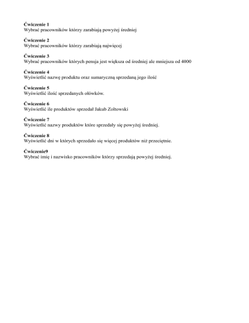 Ćwiczenie 1 Wybrać pracowników którzy zarabiają powyżej średniej Ćwiczenie 2 Wybrać pracowników którzy zarabiają najwięcej Ćwiczenie 3 Wybrać pracowników których pensja jest większa od średniej ale mniejsza od 4000 Ćwiczenie 4 Wyświetlić nazwę produktu oraz sumaryczną sprzedaną jego ilość Ćwiczenie 5 Wyświetlić ilość sprzedanych ołówków. Ćwiczenie 6 Wyświetlić ile produktów sprzedał Jakub Zoltowski Ćwiczenie 7 Wyświetlić nazwy produktów które sprzedały się powyżej średniej. Ćwiczenie 8 Wyświetlić dni w których sprzedało się więcej produktów niż przeciętnie. Ćwiczenie9 Wybrać imię i nazwisko pracowników którzy sprzedają powyżej średniej.