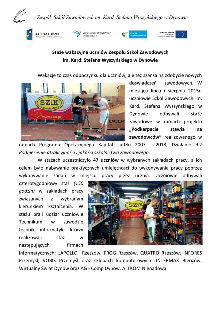 Zespół Szkół Zawodowych im .Kard. Stefana Wyszyńskiego w Dynowie Staże wakacyjne uczniów Zespołu Szkół Zawodowych im. Kard. Stefana Wyszyoskiego w Dynowie Wakacje to czas odpoczynku dla uczniów, ale też szansa na zdobycie nowych doświadczeo zawodowych. W miesiącu lipcu i sierpniu 2015r. uczniowie Szkół Zawodowych im. Kard. Stefana Wyszyoskiego w Dynowie odbywali staże zawodowe w ramach projektu „Podkarpacie stawia na zawodowców” realizowanego w ramach Programu Operacyjnego Kapitał Ludzki 2007 - 2013, Działanie 9.2 Podniesienie atrakcyjności i jakości szkolnictwa zawodowego. W stażach uczestniczyło 47 uczniów w wybranych zakładach pracy, a ich celem było nabywanie praktycznych umiejętności do wykonywania pracy poprzez wykonywanie zadao w miejscu pracy przez ucznia. Uczniowie odbywali czterotygodniowy staż (150 godzin) w zakładach pracy związanych z wybranym kierunkiem kształcenia. W stażu brali udział uczniowie Technikum w zawodzie technik informatyk, którzy realizowali staż w następujących firmach informatycznych: „APOLLO” Rzeszów, FROG Rzeszów, QUATRO Rzeszów, INFORES Przemyśl, VOBIS Przemyśl oraz sklepach komputerowych: INTERMAX Brzozów, Wirtualny Świat Dynów oraz AG - Comp Dynów, ALTKOM Nienadowa. Zespół Szkół Zawodowych im .Kard. Stefana Wyszyńskiego w Dynowie Kolejną grupą byli uczniowie Technikum kształcących się w zawodzie technik logistyk i technik handlowiec którzy realizowali staż w firmach prowadzących działalnośd logistyczno - handlową: SZiK Tyczyn, TIFO Dynów, GS „Samopomoc Chłopska” Dynów, "Agmar" Sklep Wielobranżowy w Dubiecku. Następna grupa to uczniowie Technikum kształcących się w zawodzie technik pojazdów samochodowych oraz Zasadniczej Szkoły Zawodowej w zawodzie mechanik pojazdów samochodowych. Odbywali oni staż w firmach obsługowo - naprawczych pojazdów samochodowych: Morfeusz Dynów, „Piotrex” Motoryzacja Serwis Transport Sklep, Serwis Mechatroniki i Elektroniki Pojazdowej, Zakład Handlowo Usługowy w Dubiecku, CAR - MAX Dynów. Po zakooczeniu stażu każdy uczeo otrzyma stypendium stażowe, zwrot kosztów dojazdu do miejsca stażu, oraz zaświadczenie o ukooczeniu stażu. Opiekunowie stażystów w zakładach pracy także otrzymają dodatkowe wynagrodzenie za opiekę i dokształcanie uczniów. Koszty projektu są współfinansowane ze środków Unii Europejskiej w ramach Europejskiego Funduszu Społecznego. Staż oraz praktyka zawodowa stwarzają dodatkowe szanse dla uczniów na podniesienie poziomu wiedzy i umiejętności praktycznych, poznanie zasad funkcjonowania zakładów pracy, zdobycie doświadczenia zawodowego, a po ukooczeniu szkoły łatwiejsze znalezienie pracy w wyuczonym zawodzie. Zespół Szkół Zawodowych im. Kard. Stefana Wyszyoskiego w Dynowie stawia na zawodowców!!!!