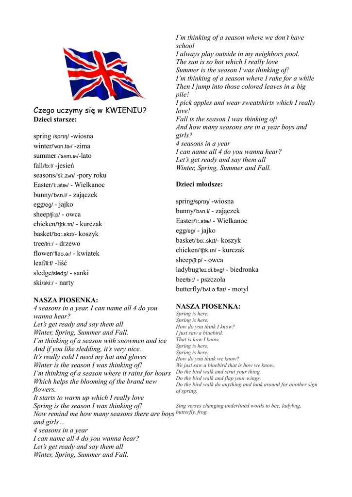 Czego uczymy się w KWIENIU? Dzieci starsze: spring /sprɪŋ/ -wiosna winter/ˈwɪn.tər/ -zima summer /ˈsʌm.ər/-lato fall/fɔːl/ -jesień seasons/ˈsiː.zən/ -pory roku Easter/ˈiː.stər/ - Wielkanoc bunny/ˈbʌn.i/ - zajączek egg/eɡ/ - jajko sheep/ʃiːp/ - owca chicken/ˈtʃɪk.ɪn/ - kurczak basket/ˈbɑː.skɪt/- koszyk tree/triː/ - drzewo flower/ˈflaʊ.ər/ - kwiatek leaf/liːf/ -liść sledge/sledʒ/ - sanki ski/skiː/ - narty I’m thinking of a season where we don’t have school I always play outside in my neighbors pool. The sun is so hot which I really love Summer is the season I was thinking of! I’m thinking of a season where I rake for a while Then I jump into those colored leaves in a big pile! I pick apples and wear sweatshirts which I really love! Fall is the season I was thinking of! And how many seasons are in a year boys and girls? 4 seasons in a year I can name all 4 do you wanna hear? Let’s get ready and say them all Winter, Spring, Summer and Fall. Dzieci młodsze: spring/sprɪŋ/ -wiosna bunny/ˈbʌn.i/ - zajączek Easter/ˈiː.stər/ - Wielkanoc egg/eɡ/ - jajko basket/ˈbɑː.skɪt/- koszyk chicken/ˈtʃɪk.ɪn/ - kurczak sheep/ʃiːp/ - owca ladybugˈleɪ.di.bʌɡ/ - biedronka bee/biː/ - pszczoła butterfly/ˈbʌt.ə.flaɪ/ - motyl NASZA PIOSENKA: NASZA PIOSENKA: 4 seasons in a year. I can name all 4 do you Spring is here. wanna hear? Spring is here. Let’s get ready and say them all How do you think I know? Winter, Spring, Summer and Fall. I just saw a bluebird. I’m thinking of a season with snowmen and ice That is how I know. Spring is here. And if you like sledding, it’s very nice. Spring is here. It’s really cold I need my hat and gloves How do you think we know? We just saw a bluebird that is how we know. Winter is the season I was thinking of! I’m thinking of a season where it rains for hours Do the bird walk and strut your thing. Do the bird walk and flap your wings. Which helps the blooming of the brand new Do the bird walk do anything and look around for another sign flowers. of spring. It starts to warm up which I really love Sing verses changing underlined words to bee, ladybug, Spring is the season I was thinking of! Now remind me how many seasons there are boys butterfly, frog. and girls… 4 seasons in a year I can name all 4 do you wanna hear? Let’s get ready and say them all Winter, Spring, Summer and Fall.