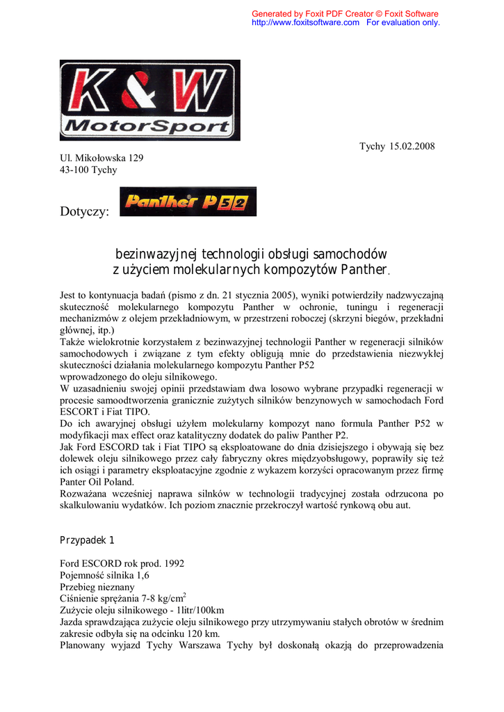 Generated by Foxit PDF Creator © Foxit Software http://www.foxitsoftware.com For evaluation only. Tychy 15.02.2008 Ul. Mikołowska 129 43-100 Tychy Dotyczy: bezinwazyjnej technologii obsługi samochodów z użyciem molekularnych kompozytów Panther. Jest to kontynuacja badań (pismo z dn. 21 stycznia 2005), wyniki potwierdziły nadzwyczajną skuteczność molekularnego kompozytu Panther w ochronie, tuningu i regeneracji mechanizmów z olejem przekładniowym, w przestrzeni roboczej (skrzyni biegów, przekładni głównej, itp.) Także wielokrotnie korzystałem z bezinwazyjnej technologii Panther w regeneracji silników samochodowych i związane z tym efekty obligują mnie do przedstawienia niezwykłej skuteczności działania molekularnego kompozytu Panther P52 wprowadzonego do oleju silnikowego. W uzasadnieniu swojej opinii przedstawiam dwa losowo wybrane przypadki regeneracji w procesie samoodtworzenia granicznie zużytych silników benzynowych w samochodach Ford ESCORT i Fiat TIPO. Do ich awaryjnej obsługi użyłem molekularny kompozyt nano formula Panther P52 w modyfikacji max effect oraz katalityczny dodatek do paliw Panther P2. Jak Ford ESCORD tak i Fiat TIPO są eksploatowane do dnia dzisiejszego i obywają się bez dolewek oleju silnikowego przez cały fabryczny okres międzyobsługowy, poprawiły się też ich osiągi i parametry eksploatacyjne zgodnie z wykazem korzyści opracowanym przez firmę Panter Oil Poland. Rozważana wcześniej naprawa silnków w technologii tradycyjnej została odrzucona po skalkulowaniu wydatków. Ich poziom znacznie przekroczył wartość rynkową obu aut. Przypadek 1 Ford ESCORD rok prod. 1992 Pojemność silnika 1,6 Przebieg nieznany Ciśnienie sprężania 7-8 kg/cm2 Zużycie oleju silnikowego - 1litr/100km Jazda sprawdzająca zużycie oleju silnikowego przy utrzymywaniu stałych obrotów w średnim zakresie odbyła się na odcinku 120 km. Planowany wyjazd Tychy Warszawa Tychy był doskonałą okazją do przeprowadzenia Generated by Foxit PDF Creator © Foxit Software http://www.foxitsoftware.com For evaluation only. autoregeneracji silnika. Uzupełniłem poziom oleju do „stanu max” oraz zatankowałem zbiornik paliwa „pod korek”. Wprowadziłem Panther P52 max effect do oleju silnikowego oraz katalityczny dodatek do paliwa Panter P2 do paliwa. Na trasie Tychy – Warszawa (310km) dolewka do pełna wyniosła 2 litry oleju (zużycie ok. 0,7l/100km), w drodze powrotnej ponowna dolewka w Częstochowie - 1 litr oleju. Zużycie spadło poniżej 0,5l/100km. Po powrocie do Tychów (przebieg ponad 600km) ponownie wprowadziłem dawki P52 do oleju i P2 do paliwa. Przez następne 600 km auto było eksploatowane w miejskim ruchu lokalnym. Po tym przebiegu poziom oleju całkowicie się ustabilizował i do dnia dzisiejszego silnik nie wymaga dolewek pomiędzy wymianami. Ciśnienie sprężania po teście 12,0-12,5kg/cm2 Z powyższego wynika, że pełna regeneracja nastąpiła po przebiegu 1200 km od rozpoczęcia bezinwazyjnej technologii Panter. Całkowity koszt dodatkowy wyniósł 0,60 PLN/km w trakcie trwania obsługi (co szybko zwraca się podczas eksploatacji - w spadku zużycia paliwa.) Przypadek 2 Fiat TIPO, rok prod.1989 Silnik 1,4; przebieg 170 tys km. Ciśnienie sprężania 8-9 kg/cm2 Zużycie oleju silnikowego - 0,6l/100km, pomimo wymiany uszczelniaczy zaworowych. Obsługę silnika wykonałem zgodnie z instrukcją użytkowania, obsługi i eksploatacji aut z użyciem kompozytu Panther P52 max effekt. Silnik został całkowicie zregenerowany w procesie samoodtwarzania, po przebiegu 1500 km. Obecnie po przebiegu 10 tys. km nie wykazuje ubytków oleju, a ciśnienie sprężania w każdym cylindrze wynosi 13 kg/cm2. Całkowity koszt dodatkowy wykonania obsługi przeliczony na 1km przebiegu (1500 km) wyniósł 0,40 PLN, co szybko zwróciło się podczas eksploatacji - spadek zużycia paliwa 10%. 8-letnie badania eksploatacyjne przekonały mnie do stosowa technologii Panter tak do silników jak i przekładni, Polecam technologię Panther moim klientom, chętnych do współpracy zapraszam.