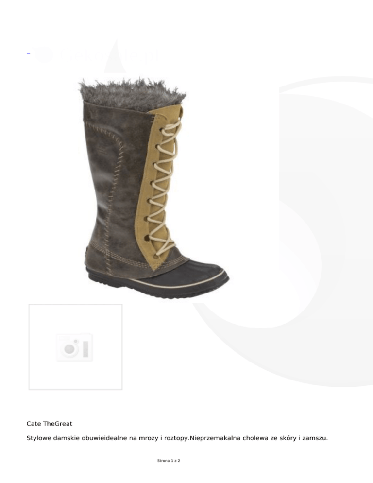 Cate TheGreat Stylowe damskie obuwieidealne na mrozy i roztopy.Nieprzemakalna cholewa ze skóry i zamszu. Strona 1 z 2 Dzieki skórze i podeszwie wykończonej naturalnym kauczukiem buty sąbardzo łatwe w czyszczeniu.Wymienna filcowa wkładka o grubości 2.5mm zapewnia komfort i poczucie ciepła w mroźne dni. Sznurowana cholewka wykończona sztucznym futrem podkreśla klasyczny wygląd buta. Kozaki w kolorze brązowym. Model dostępny również w kolorze szarym. Zalety: nieprzemakalność wymienna wewnętrzna wkładka z filcu mankiet ze sztucznego futra chroniący przed śniegiem ochronna warstwa kuczuku wokół podeszwy Materiały Cholewa: s kóra Podszewka: tkanina naturalna Podeszwa wewnętrzna: tkanina naturalnaPodeszwa zewnętrzna: kauczuk Kolekcja ZIMA 2011/2012 Strona 2 z 2