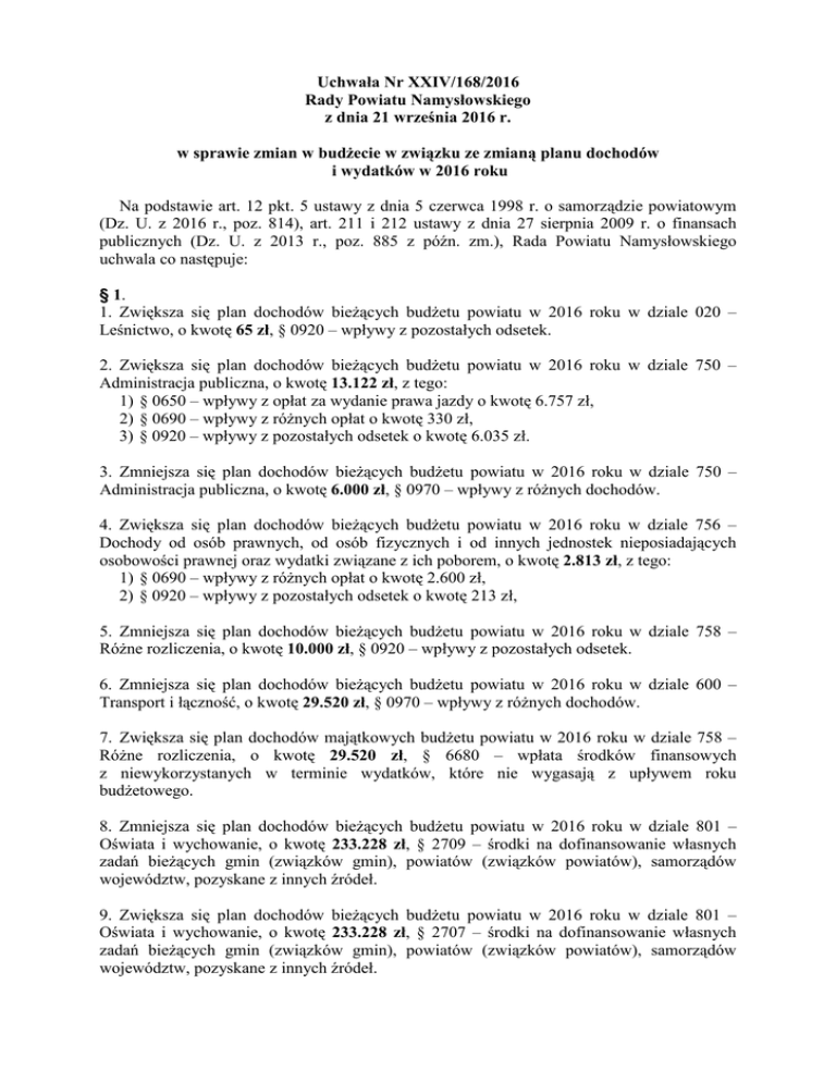 Uchwała Nr XXIV/168/2016 Rady Powiatu Namysłowskiego z dnia 21 września 2016 r. w sprawie zmian w budżecie w związku ze zmianą planu dochodów i wydatków w 2016 roku Na podstawie art. 12 pkt. 5 ustawy z dnia 5 czerwca 1998 r. o samorządzie powiatowym (Dz. U. z 2016 r., poz. 814), art. 211 i 212 ustawy z dnia 27 sierpnia 2009 r. o finansach publicznych (Dz. U. z 2013 r., poz. 885 z późn. zm.), Rada Powiatu Namysłowskiego uchwala co następuje: § 1. 1. Zwiększa się plan dochodów bieżących budżetu powiatu w 2016 roku w dziale 020 – Leśnictwo, o kwotę 65 zł, § 0920 – wpływy z pozostałych odsetek. 2. Zwiększa się plan dochodów bieżących budżetu powiatu w 2016 roku w dziale 750 – Administracja publiczna, o kwotę 13.122 zł, z tego: 1) § 0650 – wpływy z opłat za wydanie prawa jazdy o kwotę 6.757 zł, 2) § 0690 – wpływy z różnych opłat o kwotę 330 zł, 3) § 0920 – wpływy z pozostałych odsetek o kwotę 6.035 zł. 3. Zmniejsza się plan dochodów bieżących budżetu powiatu w 2016 roku w dziale 750 – Administracja publiczna, o kwotę 6.000 zł, § 0970 – wpływy z różnych dochodów. 4. Zwiększa się plan dochodów bieżących budżetu powiatu w 2016 roku w dziale 756 – Dochody od osób prawnych, od osób fizycznych i od innych jednostek nieposiadających osobowości prawnej oraz wydatki związane z ich poborem, o kwotę 2.813 zł, z tego: 1) § 0690 – wpływy z różnych opłat o kwotę 2.600 zł, 2) § 0920 – wpływy z pozostałych odsetek o kwotę 213 zł, 5. Zmniejsza się plan dochodów bieżących budżetu powiatu w 2016 roku w dziale 758 – Różne rozliczenia, o kwotę 10.000 zł, § 0920 – wpływy z pozostałych odsetek. 6. Zmniejsza się plan dochodów bieżących budżetu powiatu w 2016 roku w dziale 600 – Transport i łączność, o kwotę 29.520 zł, § 0970 – wpływy z różnych dochodów. 7. Zwiększa się plan dochodów majątkowych budżetu powiatu w 2016 roku w dziale 758 – Różne rozliczenia, o kwotę 29.520 zł, § 6680 – wpłata środków finansowych z niewykorzystanych w terminie wydatków, które nie wygasają z upływem roku budżetowego. 8. Zmniejsza się plan dochodów bieżących budżetu powiatu w 2016 roku w dziale 801 – Oświata i wychowanie, o kwotę 233.228 zł, § 2709 – środki na dofinansowanie własnych zadań bieżących gmin (związków gmin), powiatów (związków powiatów), samorządów województw, pozyskane z innych źródeł. 9. Zwiększa się plan dochodów bieżących budżetu powiatu w 2016 roku w dziale 801 – Oświata i wychowanie, o kwotę 233.228 zł, § 2707 – środki na dofinansowanie własnych zadań bieżących gmin (związków gmin), powiatów (związków powiatów), samorządów województw, pozyskane z innych źródeł. 10. Zmniejsza się plan wydatków bieżących budżetu powiatu w 2016 roku w dziale 801 – Oświata i wychowanie, rozdział 80130 – Szkoły zawodowe o kwotę 28.000 zł, w całości dotacje na zadania bieżące. 11. Zwiększa się plan wydatków bieżących budżetu powiatu w 2016 roku w dziale 801 – Oświata i wychowanie, rozdział 80111 – Gimnazja specjalne o kwotę 15.127 zł, w całości dotacje na zadania bieżące. 12. Zwiększa się plan wydatków bieżących budżetu powiatu w 2016 roku w dziale 801 – Oświata i wychowanie, rozdział 80120 – Licea ogólnokształcące o kwotę 12.873 zł, w całości dotacje na zadania bieżące. 13. Zmniejsza się plan wydatków majątkowych budżetu powiatu w 2016 roku w dziale 710 – Działalność usługowa, rozdział 71095 – Pozostała działalność o kwotę 40.000 zł, z tego: 1) wydatki na inwestycje i zakupy inwestycyjne przeznaczone na zakup sprzętu informatycznego na potrzeby Powiatowego Ośrodka Dokumentacji Geodezyjnej i Kartograficznej o kwotę 20.000 zł, 2) wydatki na inwestycje i zakupy inwestycyjne przeznaczone na wykonanie klimatyzacji w części pomieszczeń Starostwa Powiatowego o kwotę 20.000 zł, 14. Zmniejsza się plan wydatków majątkowych budżetu powiatu w 2016 roku w dziale 754 – Bezpieczeństwo publiczne i ochrona przeciwpożarowa, rozdział 75405 – Komendy powiatowe Policji o kwotę 750 zł, w całości wydatki na inwestycje i zakupy inwestycyjne przeznaczone na dotację dla Komendy Powiatowej Policji w Namysłowie na dofinansowanie zakupu samochodu. 15. Zmniejsza się plan wydatków majątkowych budżetu powiatu w 2016 roku w dziale 921 – Kultura i ochrona dziedzictwa narodowego, rozdział 92195 – Pozostała działalność o kwotę 98.646 zł, w całości wydatki na inwestycje i zakupy inwestycyjne przeznaczone na wykonanie studium wykonalności dla projektu partnerskiego realizowanego przy współudziale gmin i parafii z powiatu namysłowskiego. 16. Zmniejsza się plan wydatków bieżących budżetu powiatu w 2016 roku w dziale 750 – Administracja publiczna, rozdział 75020 – Starostwa powiatowe o kwotę 57.800 zł, w całości wydatki jednostek budżetowych przeznaczone na zadania statutowe 17. Zmniejsza się plan wydatków bieżących budżetu powiatu w 2016 roku w dziale 757 – Obsługa długu publicznego, rozdział 75702 – Obsługa papierów wartościowych, kredytów i pożyczek jednostek samorządu terytorialnego o kwotę 32.804 zł, w całości wydatki na obsługę długu. 18. Zwiększa się plan wydatków majątkowych budżetu powiatu w 2016 roku w dziale 750 – Administracja publiczna, rozdział 75020 – Starostwa powiatowe o kwotę 230.000 zł, w całości wydatki na inwestycje i zakupy inwestycyjne przeznaczone na komputeryzację Starostwa Powiatowego. § 2. W uchwale Nr XII/97/2015 Rady Powiatu Namysłowskiego z dnia 30 grudnia 2015 r. w sprawie uchwalenia budżetu powiatu na 2016 rok wprowadza się następujące zmiany: 1) Załącznik nr 10 „ Dotacje dla jednostek sektora finansów publicznych udzielane z budżetu powiatu w 2016 roku” otrzymuje brzmienie załącznika nr 1 do niniejszej uchwały. 2) Załącznik nr 11 