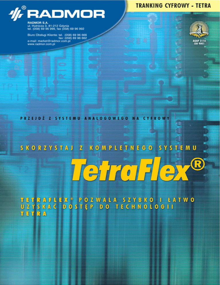 TRANKING CYFROWY - TETRA RADMOR S.A. ul. Hutnicza 3, 81-212 Gdynia tel. (058) 69 96 999, fax (058) 69 96 992 Biuro Obs∏ugi Klienta: tel. (058) 69 96 666 fax: (058) 69 96 662 e-mail: [email protected] www.radmor.com.pl TetraFlex ® Wydajne narz´dzie pracy, ∏àcznoÊci i integracji We wspó∏czesnym Êwiecie wymagania dotyczàce systemów ∏àcznoÊci radiowej sà coraz wy˝sze. Stawiajà je m.in. sztaby operacyjne ró˝nych s∏u˝b odpowiedzialnych za bezpieczeƒstwo i porzàdek publiczny, s∏u˝b udzielajàcych pierwszej pomocy, zapewniajàcych ochron´ a tak˝e inni u˝ytkownicy korzystajàcy z ∏àcznoÊci radiowej w swojej codziennej pracy. Systemy analogowe nie zawsze mogà sprostaç tym wymaganiom i nie zawsze zapewniajà dobrà ∏àcznoÊç w miejscu i czasie gdzie jest ona potrzebna. System TetraFlex® wychodzi naprzeciw tym oczekiwaniom. Jest on ∏atwy w instalacji, co pozwala wykorzystywaç go tam, gdzie trzeba szybko zainstalowaç system ∏àcznoÊci. TetraFlex® umo˝liwia sprawne przejÊcie z systemu analogowego na system cyfrowy. Jest to kompletny, zamkni´ty system 1- site (ang. single site), z jednà lub dwiema cz´stotliwoÊciami noÊnymi, oparty na protokole IP. Ka˝dej organizacji, która z niego korzysta, zapewnia szybkà, niezawodnà i bezpiecznà ∏àcznoÊç g∏osowà i transmisj´ danych. TetraFlex® jest prosty pod wzgl´dem pod∏àczenia i uruchomienia, poniewa˝ jest to system typu „plug and play ” (w∏àcz i pracuj). Unikalna architektura sieci lokalnej systemu TetraFlex® jest oparta na protokole IP. Jest on wykorzystywany do po∏àczenia stacji bazowych, stacji roboczych, urzàdzeƒ zarzàdzania siecià a nawet bramek do zewn´trznych systemów g∏osowych i transmisji danych. TetraFlex® to system o ma∏ych gabarytach, lekki i gotowy do pracy zaraz po zainstalowaniu. A teraz najwi´ksza niespodzianka: TetraFlex® oferuje klientom doskona∏à relacj´ cena/parametry. Jest to system op∏acalny ekonomicznie w porównaniu z innymi systemami o tych samych funkcjach. Poniewa˝ jest to opracowanie firmy DAMM Cellular Systems – lidera na rynku technologii TETRA – mo˝na byç pewnym jego wysokiej jakoÊci. Obszary zastosowaƒ: ■ transport làdowy ■ porty lotnicze ■ przemys∏ ■ obiekty sportowe ■ ochrona osób ■ ochrona mienia ■ instytucje rzàdowe ■ transport morski ■ zarzàdzanie flotami ■ firmy komunalne ■ firmy budowlane ■ wojsko ■ porty morskie ■ fabryki ■ bezpieczeƒstwo publiczne ■ centra handlowe Najwa˝niejsze cechy systemu TetraFlex : ® ■ System 1- site ■ Pe∏na redundancja z dwiema noÊnymi ■ Urzàdzenia do monta˝u na wie˝y lub na ziemi, na zewnàtrz budynków ■ System zarzàdzania siecià ■ Aplikacja dyspozytorska o wielu mo˝liwoÊciach ■ Po∏àczenia poprzez IP ■ VoIP ■ Pod∏àczenia do centrali PABX ■ WyjÊcie do pod∏àczenia sieci publicznej PSTN ■ Mo˝liwoÊç pod∏àczenia serwera SDS ■ Interfejs do programowania aplikacji Zalety systemu TetraFlex ® : ■ Jeden system zaspokajajàcy wiele potrzeb ■ Natychmiastowa ∏àcznoÊç ■ Mo˝liwoÊç wyboru systemu z jednà lub dwiema cz´stotliwoÊciami noÊnymi ■ Elastyczne zarzàdzanie i sterowanie ■ Doskona∏a relacja ceny do parametrów ■ Podwy˝szona poufnoÊç ∏àcznoÊci ■ ¸atwa instalacja ■ Proste uruchamianie typu „w∏àcz i pracuj” Dlaczego warto wybraç system TetraFlex ® ? W wielu organizacjach klienci generujà tak du˝o po∏àczeƒ g∏osowych i transmisji danych, ˝e dzisiejsze systemy analogowe z trudem obs∏ugujà ten ruch. Odbija si´ to niekorzystnie na dost´pie do po∏àczeƒ i ich jakoÊci. TETRA jest standardem cyfrowej ∏àcznoÊci radiowej, który zapewnia doskona∏à jakoÊç g∏osu, znacznie bardziej rozbudowane mo˝liwoÊci komunikacji, bezpieczeƒstwo oraz mo˝liwoÊci szyfrowania. System TetraFlex® wykorzystuje kana∏y cyfrowe dla zapewnienia ∏àcznoÊci pomi´dzy u˝ytkownikami wewnàtrz danej organizacji oraz technologi´ telefonii internetowej „Voice over IP” (VoIP) dla zapewnienia dost´pu do central PABX oraz publicznej sieci telefonicznej (PSTN). Po∏àczenia sà realizowane szybko, ∏atwo i bezpiecznie. TetraFlex® to kompletny system ∏àcznoÊci, zawierajàcy wszystkie niezb´dne urzàdzenia i oprogramowanie. System dostarczany jest z elementami i narz´dziami monta˝owymi, co sprawia, ˝e jest to idealne rozwiàzanie w przypadku instalacji systemu na wie˝ach i masztach telekomunikacyjnych. System TetraFlex ® to szybka, ∏atwa i bezpieczna ∏àcznoÊç. Zestaw TetraFlex ® zawiera wszystkie elementy systemu: stacj´ bazowà BS 421, sterownik stacji bazowej SB 421, oprogramowanie konfiguracyjne stacji bazowej, serwer dyspozytora i oprogramowanie klienta, serwer zarzàdzania siecià, oprogramowanie systemowe do wspó∏pracy z zewn´trznymi bramkami. Us∏ugi dost´pne dla u˝ytkowników: po∏àczenia g∏osowe, indywidualne grupowe, wywo∏ania alarmowe, transmisja danych w trybie komutacji obwodów, przesy∏anie krótkich komunikatów (SDS) w tym statusów oraz inne us∏ugi zdefiniowane w standardzie TETRA takie jak: do∏àczanie grup, zarzàdzanie nadawaniem w trybie „push to talk ”, natychmiastowe wejÊcie do grupy, tryb oszcz´dzania energii, dodatkowy kana∏ kontrolny i dynamiczne przypisywanie numerów grupowych (DGNA). Najnowsze aktualizacje funkcjonalnoÊci systemu mo˝na sprawdziç na stronie www.damm.dk System TetraFlex ® zapewnia ponadto: • Us∏ugi zarzàdzania umo˝liwiajàce monitorowanie sytemu i konfiguracj´ parametrów sieciowych • Oprogramowanie dyspozytorskie pozwalajàce dyspozytorowi sterowaç aktywnoÊcià stacji ruchomych • Us∏ugi obejmujàce szyfrowanie interfejsu radiowego w celu poprawy bezpieczeƒstwa oraz autoryzacj´ stacji ruchomych. TRANKING CYFROWY - TETRA Jak dzia∏a TetraFlex®. ■ Ma∏y, ∏atwy w monta˝u i uruchamianiu oraz dzia∏ajàcy w trudnych warunkach klimatycznych - to