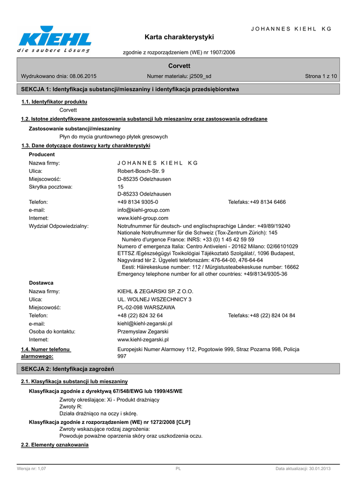 JOHANNES KIEHL KG Karta charakterystyki zgodnie z rozporządzeniem (WE) nr 1907/2006 Corvett Wydrukowano dnia: 08.06.2015 Strona 1 z 10 Numer materiału: j2509_sd SEKCJA 1: Identyfikacja substancji/mieszaniny i identyfikacja przedsiębiorstwa 1.1. Identyfikator produktu Corvett 1.2. Istotne zidentyfikowane zastosowania substancji lub mieszaniny oraz zastosowania odradzane Zastosowanie substancji/mieszaniny Płyn do mycia gruntownego płytek gresowych 1.3. Dane dotyczące dostawcy karty charakterystyki Producent Nazwa firmy: Ulica: Miejscowość: Skrytka pocztowa: Telefon: e-mail: Internet: Wydział Odpowiedzialny: JOHANNES KIEHL Robert-Bosch-Str. 9 D-85235 Odelzhausen 15 D-85233 Odelzhausen +49 8134 9305-0 [email protected] KG Telefaks: +49 8134 6466 www.kiehl-group.com Notrufnummer für deutsch- und englischsprachige Länder: +49/89/19240 Nationale Notrufnummer für die Schweiz (Tox-Zentrum Zürich): 145 Numéro d'urgence France: INRS: +33 (0) 1 45 42 59 59 Numero d' emergenza Italia: Centro Antiveleni - 20162 Milano: 02/66101029 ETTSZ /Egészségügyi Toxikológiai Tájékoztató Szolgálat/, 1096 Budapest, Nagyvárad tér 2. Ügyeleti telefonszám: 476-64-00, 476-64-64 Eesti: Häirekeskuse number: 112 / Mürgistusteabekeskuse number: 16662 Emergency telephone number for all other countries: +49/8134/9305-36 Dostawca Nazwa firmy: Ulica: KIEHL & ZEGARSKI SP. Z O.O. UL. WOLNEJ WSZECHNICY 3 Miejscowość: PL-02-098 WARSZAWA Telefon: +48 (22) 824 32 64 e-mail: Osoba do kontaktu: [email protected] Przemyslaw Zegarski Internet: www.kiehl-zegarski.pl 1.4. Numer telefonu alarmowego: Telefaks: +48 (22) 824 04 84 Europejski Numer Alarmowy 112, Pogotowie 999, Straz Pozarna 998, Policja 997 SEKCJA 2: Identyfikacja zagrożeń 2.1. Klasyfikacja substancji lub mieszaniny Klasyfikacja zgodnie z dyrektywą 67/548/EWG lub 1999/45/WE Zwroty określające: Xi - Produkt drażniący Zwroty R: Działa drażniąco na oczy i skórę. Klasyfikacja zgodnie z rozporządzeniem (WE) nr 1272/2008 [CLP] Zwroty wskazujące rodzaj zagrożenia: Powoduje poważne oparzenia skóry oraz uszkodzenia oczu. 2.2. Elementy oznakowania Wersja nr: 1,07 PL Data aktualizacji: 30.01.2013 JOHANNES KIEHL KG Karta charakterystyki zgodnie z rozporządzeniem (WE) nr 1907/2006 Corvett Wydrukowano dnia: 08.06.2015 Strona 2 z 10 Numer materiału: j2509_sd Niebezpieczne składniki, które muszą być wymienione na etykiecie ISOPROPANOLAMINE Hasło ostrzegawcze: Niebezpieczeństwo GHS05 Piktogram: Zwroty wskazujące rodzaj zagrożenia H314 Powoduje poważne oparzenia skóry oraz uszkodzenia oczu. Zwroty wskazujące środki ostrożności P280 Stosować rękawice ochronne/odzież ochronną/ochronę oczu/ochronę twarzy. P305+P351+P338 W PRZYPADKU DOSTANIA SIĘ DO OCZU: Ostrożnie płukać wodą przez kilka minut. Wyjąć soczewki kontaktowe, jeżeli są i można je łatwo usunąć. Nadal płukać. P308+P313 W przypadku narażenia lub styczności: Zasięgnąć porady/zgłosić się pod opiekę lekarza. 2.3. Inne zagrożenia Nieznane. SEKCJA 3: Skład/informacja o składnikach (zgodnie z 648/2004/EG) 3.2. Mieszaniny Charakterystyka chemiczna Środki anionowe powierzchniowo czynne 5-15%, Niejonowy środek powierzchniowo czynny < 5%, Barwniki, Aromaty Składniki niebezpieczne Nr WE Nr CAS Nr Index Nr REACH Nazwa chemiczna Ilość Klasyfikacja zgodnie z 67/548/EWG Klasyfikacja zgodnie z rozporządzeniem (WE) nr 1272/2008 [CLP] 201-162-7 1-aminopropan-2-ol; izopropanoloamina 78-96-6 C - Produkt żrący, Xn - Produkt szkodliwy R21-34 603-082-00-1 Acute Tox. 4, Skin Corr. 1B; H312 H314 204-812-8 Siarczan izoalkilu sodu 126-92-1 Xi - Produkt drażniący R38-41 5 - < 10 % 1-<5% Skin Irrit. 2, Eye Dam. 1; H315 H318 1-<5% 500-241-6 i-C13- eter alkilopoliglikolowy 5-12 EO 69011-36-5 Xn - Produkt szkodliwy, Xi - Produkt drażniący R22-41 Acute Tox. 4, Eye Dam. 1; H302 H318 270-116-6 Dodecylobenzylosulfonian- 68411-31-4 Xi - Produkt drażniący R38-41 1-<5% Skin Irrit. 2, Eye Dam. 1; H315 H318 Wydźwięk zwroty R, H i EUH: patrz sekcja 16. SEKCJA 4: Środki pierwszej pomocy Wersja nr: 1,07 PL Data aktualizacji: 30.01.2013 JOHANNES KIEHL KG Karta charakterystyki zgodnie z rozporządzeniem (WE) nr 1907/2006 Corvett Wydrukowano dnia: 08.06.2015 Strona 3 z 10 Numer materiału: j2509_sd 4.1. Opis środków pierwszej pomocy Wskazówki ogólne Unikać kontaktu ze skórą i oczami. W przypadku wdychania brak niebezpieczeństwa przy wdychaniu W przypadku kontaktu ze skórą Zmyć natychmiast dużą ilością wody z mydłem po zdjęciu zanieczyszczonej odzieży i obuwia. W przypadku kontaktu z oczami Płukać starannie dużą ilością wody, również pod powiekami. Jeśli podrażnienie oczu utrzymuje się, skonsultować się ze specjalistą. W przypadku połknięcia Wypić dużą ilość wody. NIE prowokować wymiotów. Jeśli objawy utrzymują się, wezwać lekarza. 4.2. Najważniejsze ostre i opóźnione objawy oraz skutki narażenia Informacje te nie są dostępne. 4.3. Wskazania dotyczące wszelkiej natychmiastowej pomocy lekarskiej i szczególnego postępowania z poszkodowanym Przedstawić lekarzowi dołączoną Kartę Charakterystyki Substancji Niebezpiecznej. SEKCJA 5: Postępowanie w przypadku pożaru 5.1. Środki gaśnicze Odpowiednie środki gaśnicze W przypadku pożaru dopuszcza się użycie wszelkich środków przeciwpożarowych. 5.2. Szczególne zagrożenia związane z substancją lub mieszaniną Informacje te nie są dostępne. 5.3. Informacje dla straży pożarnej Użycie środków gaśniczych odpowiednich dla lokalnych warunków i dla środowiska. Produkt niepalny. SEKCJA 6: Postępowanie w przypadku niezamierzonego uwolnienia do środowiska 6.1. Indywidualne środki ostrożności, wyposażenie ochronne i procedury w sytuacjach awaryjnych Unikać kontaktu ze skórą i oczami. 6.2. Środki ostrożności w zakresie ochrony środowiska Nie wylewać do wód powierzchniowych. 6.3. Metody i materiały zapobiegające rozprzestrzenianiu się skażenia i słu
