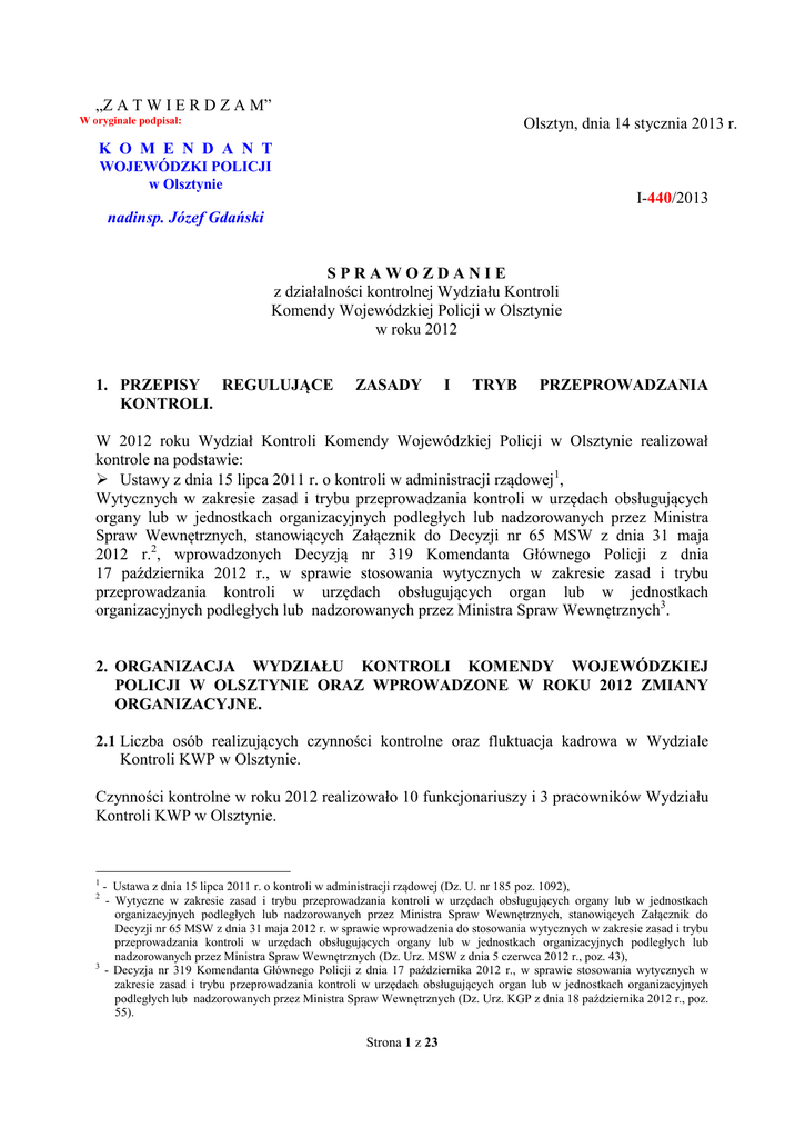 „Z A T W I E R D Z A M” W oryginale podpisał: Olsztyn, dnia 14 stycznia 2013 r. K O M E N D A N T WOJEWÓDZKI POLICJI w Olsztynie I-440/2013 nadinsp. Józef Gdański SPRAWOZDANIE z działalności kontrolnej Wydziału Kontroli Komendy Wojewódzkiej Policji w Olsztynie w roku 2012 1. PRZEPISY REGULUJĄCE KONTROLI. ZASADY I TRYB PRZEPROWADZANIA W 2012 roku Wydział Kontroli Komendy Wojewódzkiej Policji w Olsztynie realizował kontrole na podstawie: Ustawy z dnia 15 lipca 2011 r. o kontroli w administracji rządowej1, Wytycznych w zakresie zasad i trybu przeprowadzania kontroli w urzędach obsługujących organy lub w jednostkach organizacyjnych podległych lub nadzorowanych przez Ministra Spraw Wewnętrznych, stanowiących Załącznik do Decyzji nr 65 MSW z dnia 31 maja 2012 r.2, wprowadzonych Decyzją nr 319 Komendanta Głównego Policji z dnia 17 października 2012 r., w sprawie stosowania wytycznych w zakresie zasad i trybu przeprowadzania kontroli w urzędach obsługujących organ lub w jednostkach organizacyjnych podległych lub nadzorowanych przez Ministra Spraw Wewnętrznych3. 2. ORGANIZACJA WYDZIAŁU KONTROLI KOMENDY WOJEWÓDZKIEJ POLICJI W OLSZTYNIE ORAZ WPROWADZONE W ROKU 2012 ZMIANY ORGANIZACYJNE. 2.1 Liczba osób realizujących czynności kontrolne oraz fluktuacja kadrowa w Wydziale Kontroli KWP w Olsztynie. Czynności kontrolne w roku 2012 realizowało 10 funkcjonariuszy i 3 pracowników Wydziału Kontroli KWP w Olsztynie. 1 - Ustawa z dnia 15 lipca 2011 r. o kontroli w administracji rządowej (Dz. U. nr 185 poz. 1092), - Wytyczne w zakresie zasad i trybu przeprowadzania kontroli w urzędach obsługujących organy lub w jednostkach organizacyjnych podległych lub nadzorowanych przez Ministra Spraw Wewnętrznych, stanowiących Załącznik do Decyzji nr 65 MSW z dnia 31 maja 2012 r. w sprawie wprowadzenia do stosowania wytycznych w zakresie zasad i trybu przeprowadzania kontroli w urzędach obsługujących organy lub w jednostkach organizacyjnych podległych lub nadzorowanych przez Ministra Spraw Wewnętrznych (Dz. Urz. MSW z dnia 5 czerwca 2012 r., poz. 43), 3 - Decyzja nr 319 Komendanta Głównego Policji z dnia 17 października 2012 r., w sprawie stosowania wytycznych w zakresie zasad i trybu przeprowadzania kontroli w urzędach obsługujących organ lub w jednostkach organizacyjnych podległych lub nadzorowanych przez Ministra Spraw Wewnętrznych (Dz. Urz. KGP z dnia 18 października 2012 r., poz. 55). 2 Strona 1 z 23 Ponadto w 2 kontrolach do składu zespołu kontrolnego włączono 2 funkcjonariuszy z innych niż Wydział Kontroli, komórek organizacyjnych KWP w Olsztynie, tj. z Wydziału Ruchu Drogowego i Wydziału Kryminalnego KWP w Olsztynie. Struktura organizacyjna w Olsztynie. Wydziału Kontroli Komendy Wojewódzkiej Policji (z dniem 1 listopada 2012 r. z Wydziału Kontroli KWP w Olsztynie wyłączono stanowisko specjalisty ds. medycyny pracy – korpus służby cywilnej – przenosząc ten etat do Wydziału Kadr i Szkolenia KWP w Olsztynie oraz zmieniono wewnętrzną strukturę organizacyjną Wydziału Kontroli). - wg stanu na dzień 31 października 2012 r.: etatowo 21,5 stanowisk w tym: 15 policjantów, 5 pracowników korpusu służby cywilnej, 1,5 etatu pracownika w normatywie. Naczelnik – 1 policjant, Zastępca Naczelnika – 1 policjant, Zespół ds. Kontroli Ogólnopolicyjnej – 6 policjantów, Zespół ds. Audytu i Analiz – 3 policjantów, Zespół ds. Skarg i Wniosków – 4 policjantów, Zespół ds. Kontroli Finansowo-Gospodarczej – 2 pracowników będących członkami korpusu służby cywilnej, Zespół Ochrony Pracy – 3,5 etatu, z czego 3 etaty w korpusie służby cywilnej, 0,5 etatu w normatywie, Sekretariat – 1 pracownik - normatyw. faktycznie 19,5 etatu w tym: 13 policjantów, 5 pracowników korpusu służby cywilnej, 1,5 etatu pracownika w normatywie. Naczelnik – 1 policjant, Zastępca Naczelnika – 1 policjant, Zespół ds. Kontroli Ogólnopolicyjnej – 6 policjantów, (2 wakaty) Zespół ds. Audytu i Analiz – 3 policjantów, Zespół ds. Skarg i Wniosków – 4 policjantów, Zespół ds. Kontroli Finansowo-Gospodarczej – 2 pracowników będących członkami korpusu służby cywilnej, Zespół Ochrony Pracy – 3,5 etatu, z czego 3 etaty w korpusie służby cywilnej, 0,5 etatu w normatywie, Sekretariat – 1 pracownik - normatyw. Strona 2 z 23 - wg stanu na dzień 31 grudnia 2012 r.: etatowo 20,5 stanowisk, w tym: 15 policjantów, 4 pracowników korpusu służby cywilnej, 1,5 etatu pracownika w normatywie. Naczelnik Zastępca Naczelnika – 1 policjant, – 1 policjant, Zespół ds. Kontroli – 5 policjantów oraz 2 pracowników będących członkami korpusu służby cywilnej, Zespół ds. Analiz – 3 policjantów, Zespół ds. Skarg i Wniosków – 5 policjantów, Zespół Ochrony Pracy – 2,5 etatu, z czego 2 etaty w korpusie służby cywilnej, 0,5 etatu w normatywie, Sekretariat – 1 pracownik - normatyw. faktycznie 18,5 etatu, w tym: 13 policjantów, 4 pracowników korpusu służby cywilnej, 1,5 etatu pracownika w normatywie. Naczelnik – 1 policjant, Zastępca Naczelnika – 1 policjant, Zespół ds. Kontroli – 5 policjantów (1 wakat) oraz 2 pracowników będących członkami korpusu służby cywilnej, Zespół ds. Analiz – 3 policjantów, Zespół ds. Skarg i Wniosków – 5 policjantów (1 wakat), Zespół Ochrony Pracy – 2,5 etatu, z czego 2 etaty w korpusie służby cywilnej, 0,5 etatu w normatywie, Sekretariat – 1 pracownik - normatyw. Fluktuacja obsady osobowej Wydziału Kontroli KWP w Olsztynie, w roku 2012 przedstawiała się następująco: służbę/pracę w Wydziale Kontroli rozpoczęli: od 1 stycznia 2012 r. asp. Agnieszka Schilling – od 16 października 2011 r. do 31 grudnia 2011 r. pełniąca obowiązki asystenta w Wydziale Kontroli, a wcześniej pełniąca służbę w Wydziale Wywiadu Kryminalnego KWP w Olsztynie, od 1 sierpnia 2012 r. mł. asp. Mariusz Horyd – do 31 lipca 2012 r. pełniący