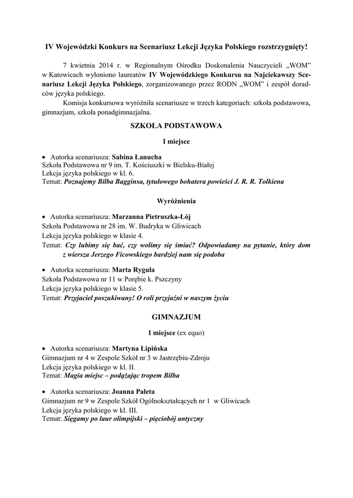 IV Wojewódzki Konkurs na Scenariusz Lekcji Języka Polskiego rozstrzygnięty! 7 kwietnia 2014 r. w Regionalnym Ośrodku Doskonalenia Nauczycieli „WOM” w Katowicach wyłoniono laureatów IV Wojewódzkiego Konkursu na Najciekawszy Scenariusz Lekcji Języka Polskiego, zorganizowanego przez RODN „WOM” i zespół doradców języka polskiego. Komisja konkursowa wyróżniła scenariusze w trzech kategoriach: szkoła podstawowa, gimnazjum, szkoła ponadgimnazjalna. SZKOŁA PODSTAWOWA I miejsce Autorka scenariusza: Sabina Łanucha Szkoła Podstawowa nr 9 im. T. Kościuszki w Bielsku-Białej Lekcja języka polskiego w kl. 6. Temat: Poznajemy Bilba Bagginsa, tytułowego bohatera powieści J. R. R. Tolkiena Wyróżnienia Autorka scenariusza: Marzanna Pietruszka-Łój Szkoła Podstawowa nr 28 im. W. Budryka w Gliwicach Lekcja języka polskiego w klasie 4. Temat: Czy lubimy się bać, czy wolimy się śmiać? Odpowiadamy na pytanie, który dom z wiersza Jerzego Ficowskiego bardziej nam się podoba Autorka scenariusza: Marta Ryguła Szkoła Podstawowa nr 11 w Porębie k. Pszczyny Lekcja języka polskiego w klasie 5. Temat: Przyjaciel poszukiwany! O roli przyjaźni w naszym życiu GIMNAZJUM I miejsce (ex equo) Autorka scenariusza: Martyna Lipińska Gimnazjum nr 4 w Zespole Szkół nr 3 w Jastrzębiu-Zdroju Lekcja języka polskiego w kl. II. Temat: Magia miejsc – podążając tropem Bilba Autorka scenariusza: Joanna Paleta Gimnazjum nr 9 w Zespole Szkół Ogólnokształcących nr 1 w Gliwicach Lekcja języka polskiego w kl. III. Temat: Sięgamy po laur olimpijski – pięciobój antyczny Wyróżnienie Autorka scenariusza: Aneta Bednarek Gimnazjum nr 3 im. Armii Krajowej w Częstochowie Lekcja języka polskiego w kl. I. Temat: Zapraszamy na Wigilię… Ebenezera Scrooge’a SZKOŁY PONADGIMNAZJALNE I miejsce Autorka scenariusza: Dorota Tobiasz Liceum Ogólnokształcące w Gilowicach Lekcja języka polskiego w kl. III liceum ogólnokształcącego. Temat: O czym jest ta lekcja? – Kończy się o 10.45 II miejsce Autorka scenariusza: Katarzyna Stawowska Zespół Szkół Budowlanych im. Powstańców Śląskich w Katowicach Lekcja języka polskiego w kl. I liceum ogólnokształcącego lub II klasie technikum. Temat: Gdyby spotkali się dzisiaj…, czyli Konstantego Ildefonsa Gałczyńskiego scenariusz randki Laury i Filona. Zabawa konwencją literacką dwudziestowiecznego poety Wyróżnienia Autorka scenariusza: Ewa Siwczyk Akademicki Zespół Szkół Ogólnokształcących nr 2 w Chorzowie Lekcja języka polskiego w kl. III liceum ogólnokształcącego lub IV klasie technikum. Temat: Czy literatura jest nieżyciowa? O twórczości Mirona Białoszewskiego Autorka scenariusza: Renata Tetla Zespół Szkół nr 3, III Liceum Ogólnokształcące im. Z. Herberta w Żorach Lekcja języka polskiego w kl. II i III liceum ogólnokształcącego. Temat: „Żeby tylko nie anioł” i inne wiersze, czyli „siódme niebo” Zbigniewa Herberta Wyróżnione prace zostaną opublikowane przez RODN „WOM” w Katowicach. Dodatkowo scenariusze, które zdobyły pierwsze miejsca, zostaną zamieszczone w kolejnych numerach kwartalnika „Forum Nauczycieli”. W imieniu komisji konkursowej: Iwona Kruszewska-Stoły − konsultant RODN „WOM” w Katowicach Alina Zarzycka − koordynator zespołu doradców języka polskiego