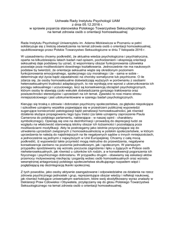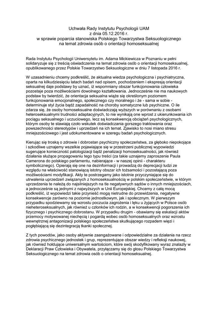 Uchwała Rady Instytutu Psychologii UAM z dnia 05.12.2016 r. w sprawie poparcia stanowiska Polskiego Towarzystwa Seksuologicznego na temat zdrowia osób o orientacji homoseksualnej Rada Instytutu Psychologii Uniwersytetu im. Adama Mickiewicza w Poznaniu w pełni solidaryzuje się z treścią oświadczenia na temat zdrowia osób o orientacji homoseksualnej, opublikowanego przez Polskie Towarzystwo Seksuologiczne w dniu 7 listopada 2016 r. W uzasadnieniu chcemy podkreślić, że aktualna wiedza psychologiczna i psychiatryczna, oparta na kilkudziesięciu latach badań nad opisem, pochodzeniem i ekspresją orientacji seksualnej daje podstawy by uznać, iż wspomniany obszar funkcjonowania człowieka pozostaje poza możliwościami dowolnego kształtowania. Jednocześnie nie ma naukowych podstaw by twierdzić, że orientacja seksualna wiąże się określonym poziomem funkcjonowania emocjonalnego, społecznego czy moralnego i że - sama w sobie determinuje styl życia bądź zapadalność na choroby somatyczne lub psychiczne. O ile zdarza się, że osoby homoseksualne doświadczają wyższych w porównaniu z osobami heteroseksualnymi trudności adaptacyjnych, to nie wynikają one wprost z ukierunkowania ich pociągu seksualnego i uczuciowego, lecz są konsekwencją obciążeń psychologicznych, którym osoby te stawiają czoło wskutek doświadczania gorszego traktowania oraz powszechności stereotypów i uprzedzeń na ich temat. Zjawisko to nosi miano stresu mniejszościowego i jest udokumentowane w szeregu badań psychologicznych. Kierując się troską o zdrowie i dobrostan psychiczny społeczeństwa, za głęboko niepokojące i szkodliwe uznajemy wszelkie pojawiające się w przestrzeni publicznej wypowiedzi sugerujące konieczność patologizacji bądź penalizacji homoseksualności, jak również działania służące propagowaniu tego typu treści (za takie uznajemy zaproszenie Paula Camerona do polskiego parlamentu, nabierające - w naszej opinii - charakteru symbolicznego). Opierają się one na dezinformacji i prowadzą do deprecjacji ludzi ze względu na właściwość stanowiącą istotny obszar ich tożsamości i pozostającą poza możliwościami modyfikacji. Akty te postrzegamy jako istotnie przyczyniające się do utrwalenia uprzedzeń związanych z homoseksualnością w polskim społeczeństwie, w którym uprzedzenia te należą do najsilniejszych na tle negatywnych sądów o innych mniejszościach, a jednocześnie są jednymi z najwyższych w Unii Europejskiej. Chcemy z całą mocą podkreślić, iż wypowiedzi takie przynieść mogą nietrudne do przewidzenia, negatywne konsekwencje zarówno na poziomie jednostkowym, jak i społecznym. W pierwszym przypadku spodziewamy się wzrostu poczucia zagrożenia i lęku u żyjących w Polsce osób nieheteroseksualnych, jak również u członków ich rodzin, a w konsekwencji pogorszenia ich fizycznego i psychicznego dobrostanu. W przypadku drugim - obawiamy się eskalacji aktów przemocy motywowanej niechęcią i pogardą wobec osób homoseksualnych oraz wzrostu wewnętrznej antagonizacji polskiego społeczeństwa skutkującego rozpadem więzi i pogłębiającą się dezintegracją tkanki społecznej. Z tych powodów, jako osoby aktywnie zaangażowane i odpowiedzialne za działania na rzecz zdrowia psychicznego jednostek i grup, reprezentujące obszar wiedzy i refleksji naukowej, jak również hołdujące uniwersalnym wartościom, które swój skodyfikowany wyraz znalazły w Deklaracji Praw Człowieka i Obywatela, przyłączamy się do głosu Polskiego Towarzystwa Seksuologicznego na temat zdrowia osób o orientacji homoseksualnej.