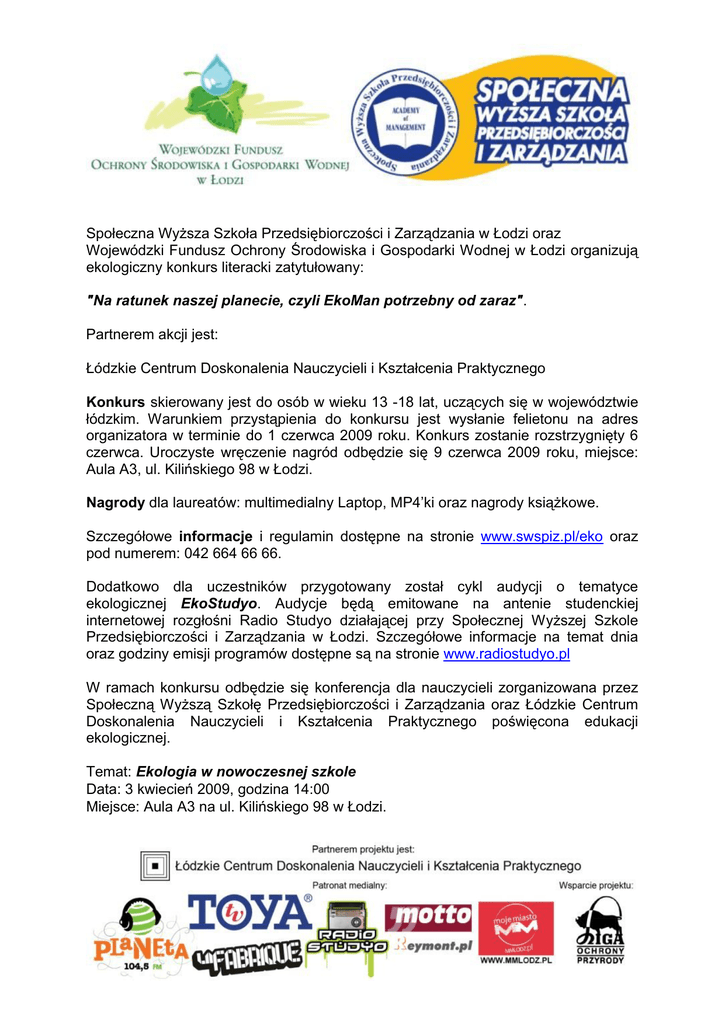 Społeczna Wyższa Szkoła Przedsiębiorczości i Zarządzania w Łodzi oraz Wojewódzki Fundusz Ochrony Środowiska i Gospodarki Wodnej w Łodzi organizują ekologiczny konkurs literacki zatytułowany: "Na ratunek naszej planecie, czyli EkoMan potrzebny od zaraz". Partnerem akcji jest: Łódzkie Centrum Doskonalenia Nauczycieli i Kształcenia Praktycznego Konkurs skierowany jest do osób w wieku 13 -18 lat, uczących się w województwie łódzkim. Warunkiem przystąpienia do konkursu jest wysłanie felietonu na adres organizatora w terminie do 1 czerwca 2009 roku. Konkurs zostanie rozstrzygnięty 6 czerwca. Uroczyste wręczenie nagród odbędzie się 9 czerwca 2009 roku, miejsce: Aula A3, ul. Kilińskiego 98 w Łodzi. Nagrody dla laureatów: multimedialny Laptop, MP4’ki oraz nagrody książkowe. Szczegółowe informacje i regulamin dostępne na stronie www.swspiz.pl/eko oraz pod numerem: 042 664 66 66. Dodatkowo dla uczestników przygotowany został cykl audycji o tematyce ekologicznej EkoStudyo. Audycje będą emitowane na antenie studenckiej internetowej rozgłośni Radio Studyo działającej przy Społecznej Wyższej Szkole Przedsiębiorczości i Zarządzania w Łodzi. Szczegółowe informacje na temat dnia oraz godziny emisji programów dostępne są na stronie www.radiostudyo.pl W ramach konkursu odbędzie się konferencja dla nauczycieli zorganizowana przez Społeczną Wyższą Szkołę Przedsiębiorczości i Zarządzania oraz Łódzkie Centrum Doskonalenia Nauczycieli i Kształcenia Praktycznego poświęcona edukacji ekologicznej. Temat: Ekologia w nowoczesnej szkole Data: 3 kwiecień 2009, godzina 14:00 Miejsce: Aula A3 na ul. Kilińskiego 98 w Łodzi.