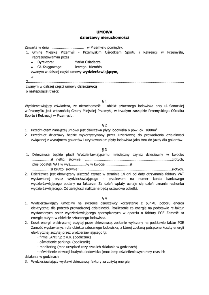 UMOWA dzierżawy nieruchomości Zawarta w dniu ................................ w Przemyślu pomiędzy: 1. Gminą Miejską Przemyśl - Przemyskim Ośrodkiem Sportu i Rekreacji w Przemyślu, reprezentowanym przez : Dyrektora: Marka Osiadacza Gł. Księgowego: Jerzego Uziembło zwanym w dalszej części umowy wydzierżawiającym, a 2................................................................................................................................................................. zwanym w dalszej części umowy dzierżawcą o następującej treści: §1 Wydzierżawiający oświadcza, że nieruchomość – obiekt sztucznego lodowiska przy ul. Sanockiej w Przemyślu jest własnością Gminy Miejskiej Przemyśl, w trwałym zarządzie Przemyskiego Ośrodka Sportu i Rekreacji w Przemyślu. §2 1. Przedmiotem niniejszej umowy jest dzierżawa płyty lodowiska o pow. ok. 1800m2 2. Przedmiot dzierżawy będzie wykorzystywany przez Dzierżawcę do prowadzenia działalności związanej z wynajmem gokartów i użytkowaniem płyty lodowiska jako toru do jazdy dla gokartów. §3 1. Dzierżawca będzie płacił Wydzierżawiającemu miesięczny czynsz dzierżawny w kwocie: ……………….zł netto, słownie: ……………………………………………………………………….………złotych, plus podatek VAT w wys………..…..% w kwocie …………………….zł ……………….zł brutto, słownie: …………………………………………………………………………………...złotych, 2. Dzierżawca jest obowiązany uiszczać czynsz w terminie 14 dni od daty otrzymania faktury VAT wystawionej przez wydzierżawiającego - przelewem na numer konta bankowego wydzierżawiającego podany na fakturze. Za dzień wpłaty uznaje się dzień uznania rachunku wydzierżawiającego. Od zaległości naliczane będą ustawowe odsetki. §4 1. Wydzierżawiający umożliwi na życzenie dzierżawcy korzystanie z punktu poboru energii elektrycznej dla potrzeb prowadzonej działalności. Rozliczenie za energię na podstawie re-faktur wystawionych przez wydzierżawiającego sporządzonych w oparciu o faktury PGE Zamość za energię zużytą w obiekcie sztucznego lodowiska. 2. Koszt energii elektrycznej zużytej przez dzierżawcę, zostanie wyliczony na podstawie faktur PGE Zamość wystawianych dla obiektu sztucznego lodowiska, z której zostaną potrącone koszty energii elektrycznej zużytej przez wydzierżawiającego tj: - firmę LANO Sp z o.o. (podlicznik) - oświetlenie parkingu (podlicznik) - monitoring (moc urządzeń razy czas ich działania w godzinach) - oświetlenie elewacji budynku lodowiska (moc lamp oświetleniowych razy czas ich działania w godzinach 3. Wydzierżawiający wystawi dzierżawcy faktury za zużytą energię. §5 Wydzierżawiający umożliwi korzystanie przez dzierżawcę z pomieszczenia tzw. „spikerki”, wejścia głównego wraz z holem i toalety męskiej, Wydzierżawiający przekaże dzierżawcy klucze do wymienionych pomieszczeń. Dzierżawca odpowiada za porządek w pomieszczeniach i bezpieczeństwo ich użytkowania. §6 Dzierżawca zobowiązuje się: 1. utrzymywać przedmiot dzierżawy z należytą starannością oraz wykorzystywać go na cele określone w niniejszej umowie, 2. zwrócić przedmiot dzierżawy wydzierżawiającemu po wygaśnięciu lub rozwiązaniu niniejszej umowy w stanie niepogorszonym, 3. dbać o czystość przedmiotu dzierżawy i terenu przyległego (wokół płyty lodowiska i przed budynkiem głównym) 4. przestrzegać regulaminu porządku publicznego i zasad BHP obowiązujących na terenie sztucznego lodowiska. 5. ponosić odpowiedzialność za bezpieczeństwo p.poż. i inne, w związku z prowadzoną działalnością. 6. usuwać na bieżąco i na własny koszt usterki powstałe w związku z prowadzona działalnością w przedmiocie dzierżawy i pomieszczeniach udostępnionych dzierżawcy do użytkowania 1. 2. 1. 2. 3. §7 Zwrot przedmiotu niniejszej umowy zostanie poprzedzony weryfikacją przez wspólną komisję (złożoną z przedstawicieli wydzierżawiającego i dzierżawcy), stanu technicznego przedmiotu dzierżawy. W przypadku stwierdzenia uszkodzeń przedmiotu dzierżawy wynikających z prowadzonej działalności przez dzierżawcę, wydzierżawiający obciąży dzierżawcę kwotą stanowiącą równowartość stwierdzonych usterek lub zniszczeń. §8 Wydzierżawiający nie odpowiada za sprzęt i inne akcesoria znajdujące się na dzierżawionej nieruchomości, będące własnością dzierżawcy lub mające związek z prowadzoną działalnością dzierżawcy . Dzierżawca zobowiązuje się do ubezpieczenia OC w związku z prowadzoną przez siebie działalnością. Dzierżawca w szczególności odpowiada za spowodowanie pożaru lub wybuchu, w związku z prowadzoną przez siebie działalnością i odpowiada za bezpieczeństwo osób korzystających z gokartów, jak równie z osób trzecich przebywających na dzierżawionym obiekcie, w związku z prowadzoną działalnością przez dzierżawcę. §9 1. Dzierżawca oświadcza, że zapoznał się ze stanem technicznym przedmiotu dzierżawy- płyty lodowiska i nie wnosi zastrzeżeń. 2. Przekazanie przedmiotu dzierżawy nastąpi za protokołem przekazania – odbioru, w którym strony określą szczególnie m.in. stan techniczny przedmiotu dzierżawy-płyty lodowiska i udostępnianych pomieszczeń. § 10 Wydzierżawiający zastrzega sobie prawo kontroli przedmiotu dzierżawy pod kątem przestrzegania zapisów niniejszej umowy, w każdym czasie po uprzednim telefonicznym powiadomieniu dzierżawcy o kontroli. 1. 2. 3. 4. 5. 6. § 11 Niniejsza umowa zostaje zawarta na okres od 01.05.2015 do 30.09.2015, siedem dni w tygodniu w godzinach od 10,00 do 21,00. W przypadku nie wywiązywania się dzierżawcy z obowiązków określonych w umowie – w tym za nieterminowe regulowanie czynszu i inne, wydzierżawiający może jednostronnie rozwiązać umowę za 14 dniowym termi