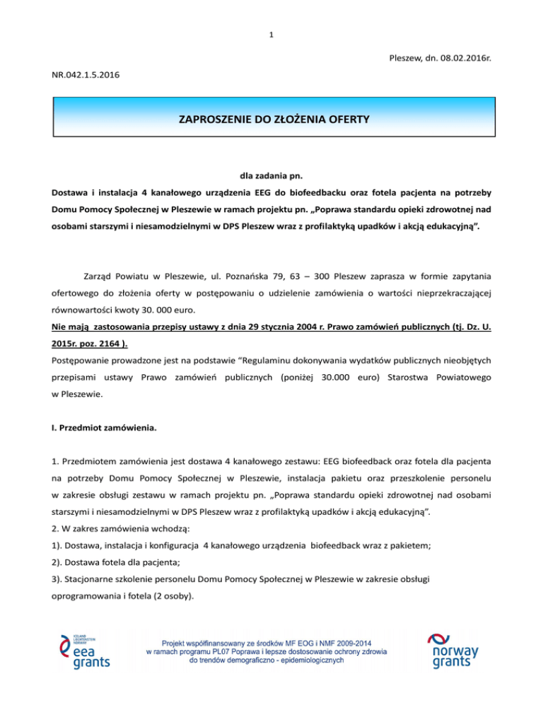 1 Pleszew, dn. 08.02.2016r. NR.042.1.5.2016 ZAPROSZENIE DO ZŁOŻENIA OFERTY dla zadania pn. Dostawa i instalacja 4 kanałowego urządzenia EEG do biofeedbacku oraz fotela pacjenta na potrzeby Domu Pomocy Społecznej w Pleszewie w ramach projektu pn. „Poprawa standardu opieki zdrowotnej nad osobami starszymi i niesamodzielnymi w DPS Pleszew wraz z profilaktyką upadków i akcją edukacyjną”. Zarząd Powiatu w Pleszewie, ul. Poznańska 79, 63 – 300 Pleszew zaprasza w formie zapytania ofertowego do złożenia oferty w postępowaniu o udzielenie zamówienia o wartości nieprzekraczającej równowartości kwoty 30. 000 euro. Nie mają zastosowania przepisy ustawy z dnia 29 stycznia 2004 r. Prawo zamówień publicznych (tj. Dz. U. 2015r. poz. 2164 ). Postępowanie prowadzone jest na podstawie “Regulaminu dokonywania wydatków publicznych nieobjętych przepisami ustawy Prawo zamówień publicznych (poniżej 30.000 euro) Starostwa Powiatowego w Pleszewie. I. Przedmiot zamówienia. 1. Przedmiotem zamówienia jest dostawa 4 kanałowego zestawu: EEG biofeedback oraz fotela dla pacjenta na potrzeby Domu Pomocy Społecznej w Pleszewie, instalacja pakietu oraz przeszkolenie personelu w zakresie obsługi zestawu w ramach projektu pn. „Poprawa standardu opieki zdrowotnej nad osobami starszymi i niesamodzielnymi w DPS Pleszew wraz z profilaktyką upadków i akcją edukacyjną”. 2. W zakres zamówienia wchodzą: 1). Dostawa, instalacja i konfiguracja 4 kanałowego urządzenia biofeedback wraz z pakietem; 2). Dostawa fotela dla pacjenta; 3). Stacjonarne szkolenie personelu Domu Pomocy Społecznej w Pleszewie w zakresie obsługi oprogramowania i fotela (2 osoby). 2 3. Zestaw biofeedback musi spełniać minimum następujące wymogi: 1). Urządzenie do pomiaru sygnałów fizjologicznych (głowica): a). 4 uniwersalne niskoszumne kanały do pomiarów sygnałów napięciowych, konduktancyjnych, rezystancyjnych i temperatury; b). Przeznaczenie każdego kanału pomiarowego określane przez użytkownika ( np. 4x EEG, EEG + sEMG +GSR+TEMP lub 2xEEG + 2 X EMG itd.); c). Niezależne wejścia referencyjne dla każdego kanału; d). Wbudowany test impedancji elektrodowych i ciągłości obwodu; e). Możliwość bezprzewodowej łączności z komputerem; f). Transmisja danych do komputera w czasie rzeczywistym; g). Współpraca z aplikacjami komputerowymi umożliwiającymi elastyczne przetwarzanie i prezentację sygnałów oraz ich zapis w komputerze; h). Zasilanie bateryjne; i). adapter Bluetooth do portu USB komputera, j). Sygnalizacja stanu baterii, łącza bezprzewodowego i wejść pomiarowych; k). Kompatybilność z rutynowo stosowanymi elektrodami (Ag/AgCl; Ag, Au, Sn itp.). 2). Specjalistyczne oprogramowanie do Biofeedback do zapisu i analizy sygnałów fizjologicznych (napięciowych, konduktancyjnych, rezystancyjnych i temperatury). Oprogramowanie musi minimum: a). Umożliwiać rejestrację sygnałów EEG, GSR, EKG, TEMP i jego analizę po wykonaniu treningu; b). Posiadać protokoły treningowe (skrypty) dla różnych modalności: EEG Biofeedback, GSR Biofeedback, HRV Biofeedback, TEMP Biofeedback. Protokoły 1, 2 i 4 kanałowe (minimum 100 skryptów); c). Posiadać funkcję definiowania własnych protokołów (skryptów) dla różnych modalności Biofeedback (EEG, GSR, HRV, TEMP); d). Posiadać wbudowane szablony raportów diagnostycznych (minimum 50); e). Posiadać funkcję definiowania własnych szablonów raportów; f). Posiadać możliwość eksportu wyników sesji do plików tekstowych; g). Umożliwiać prowadzenie kartotek danych pacjentów; h).Umożliwiać wyświetlanie średnich ruchomych amplitud, udziałów procentowych, dominujących częstotliwości dla wybranych pasm, koherencji, wskaźników dla wybranego kanału; i). Umożliwiać użytkownikowi definiowanie zakresu pasm trenowanych; j). Umożliwiać użytkownikowi definiowanie metody filtracji sygnału; k). Umożliwiać dodawanie wykresów i mierników; 3 l). Umożliwiać pomiar oporności elektrod; ł). Umożliwiać wykonanie analizy diagnostycznej QEEG (analiza ilościowa EEG) z minimum 12 punktów; m). Posiadać funkcję automatycznej rekomendacji protokołów treningowych EEG Biofeedback na podstawie raportu QEEG; n). Umożliwiać prowadzenie treningu Biofeedback z wykresami, grami i filmami oraz dodawanie filmów; o). Umożliwiać prowadzenia treningu przy oczach zamkniętych (feedback akustyczny) oraz możliwość dodawania plików muzycznych; p). Posiadać wskaźnik postępu czasu trwania rundy; r). Posiadać możliwość definiowania czasu trwania rundy. 3). W zestawie: a). minimum 200 dwu – trzy minutowe filmy; b). video – puzzle (min. 1000 plansz); c). minimum: 15 gier do prowadzenia treningu Biofeedback; d). elektrody EEG miseczkowe i uszne (w tym minimum 5 elektrod miseczkowych i minimum 2 elektrody uszne); e). minimum trzy elektrody GSR wielokrotnego użytku na palce; f). jednorazowe elektrody samoprzylepne do HRV (min. 50 szt); g). sensor temperatury skóry (TEMP); h). zestaw niezbędnych przewodów do elektrod zatrzaskowych; i). łącznik 4 wejść referencyjnych (4 wtyki - 2 gniazda); j). pasta przewodząca i ścierająca (min. po 1 szt.). k. Instrukcja obsługi w języku polskim. 4). Wykonawca musi udzielić minimum 36 miesięcy gwarancji na dostarczony zestaw Biofeedback. 4. Fotel dla pacjenta musi spełniać minimum następujące parametry: 1). Funkcja masażu + ogrzewanie; 2). minimum 8 punktów masażu ( w tym minimum 6 w fotelu i 2 w podnóżku); 3). do wyboru minimum 5 programów masażu; 4). minimum 2 stopnie natężenia masażu; 5). minimum 4 automatyczne programy do masażu (grzbiet, pośladki, łydki, uda); 6). możliwość manualnego wybierania sfer do masowania. 7). podnóżek; 8). pilot. 4 5. Wykonawca musi udzielić minimum 24 miesiące gwarancji na dostarczony fotel. II. Miejsce realizacji zamówienia: Dom Pomocy Społecznej w Pleszewie, ul. Plac Wolności im. Jana Pawła II 5, 63 – 300 Pleszew. II