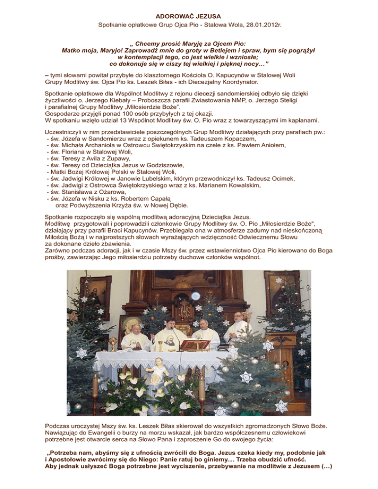 ADOROWAĆ JEZUSA Spotkanie opłatkowe Grup Ojca Pio - Stalowa Wola, 28.01.2012r. „ Chcemy prosić Maryję za Ojcem Pio: Matko moja, Maryjo! Zaprowadź mnie do groty w Betlejem i spraw, bym się pogrążył w kontemplacji tego, co jest wielkie i wzniosłe; co dokonuje się w ciszy tej wielkiej i pięknej nocy…” – tymi słowami powitał przybyłe do klasztornego Kościoła O. Kapucynów w Stalowej Woli Grupy Modlitwy św. Ojca Pio ks. Leszek Biłas - ich Diecezjalny Koordynator. Spotkanie opłatkowe dla Wspólnot Modlitwy z rejonu diecezji sandomierskiej odbyło się dzięki życzliwości o. Jerzego Kiebały – Proboszcza parafii Zwiastowania NMP, o. Jerzego Steligi i parafialnej Grupy Modlitwy „Miłosierdzie Boże”. Gospodarze przyjęli ponad 100 osób przybyłych z tej okazji. W spotkaniu wzięło udział 13 Wspólnot Modlitwy św. O. Pio wraz z towarzyszącymi im kapłanami. Uczestniczyli w nim przedstawiciele poszczególnych Grup Modlitwy działających przy parafiach pw.: - św. Józefa w Sandomierzu wraz z opiekunem ks. Tadeuszem Kopaczem, - św. Michała Archanioła w Ostrowcu Świętokrzyskim na czele z ks. Pawłem Aniołem, - św. Floriana w Stalowej Woli, - św. Teresy z Avila z Żupawy, - św. Teresy od Dzieciątka Jezus w Godziszowie, - Matki Bożej Królowej Polski w Stalowej Woli, - św. Jadwigi Królowej w Janowie Lubelskim, którym przewodniczył ks. Tadeusz Ocimek, - św. Jadwigi z Ostrowca Świętokrzyskiego wraz z ks. Marianem Kowalskim, - św. Stanisława z Ożarowa, - św. Józefa w Nisku z ks. Robertem Capałą oraz Podwyższenia Krzyża św. w Nowej Dębie. Spotkanie rozpoczęło się wspólną modlitwą adoracyjną Dzieciątka Jezus. Modlitwę przygotowali i poprowadzili członkowie Grupy Modlitwy św. O. Pio „Miłosierdzie Boże", działający przy parafii Braci Kapucynów. Przebiegała ona w atmosferze zadumy nad nieskończoną Miłością Bożą i w najprostszych słowach wyrażających wdzięczność Odwiecznemu Słowu za dokonane dzieło zbawienia. Zarówno podczas adoracji, jak i w czasie Mszy św. przez wstawiennictwo Ojca Pio kierowano do Boga prośby, zawierzając Jego miłosierdziu potrzeby duchowe członków wspólnot. Podczas uroczystej Mszy św. ks. Leszek Biłas skierował do wszystkich zgromadzonych Słowo Boże. Nawiązując do Ewangelii o burzy na morzu wskazał, jak bardzo współczesnemu człowiekowi potrzebne jest otwarcie serca na Słowo Pana i zaproszenie Go do swojego życia: „Potrzeba nam, abyśmy się z ufnością zwrócili do Boga. Jezus czeka kiedy my, podobnie jak i Apostołowie zwrócimy się do Niego: Panie ratuj bo giniemy.... Trzeba obudzić ufność. Aby jednak usłyszeć Boga potrzebne jest wyciszenie, przebywanie na modlitwie z Jezusem (…) Św. O. Pio uczył nas, abyśmy byli zadowoleni w życiu duchowym nawet z małych kroków, ale nigdy nie ustawali w drodze do świętości…” – dodał na zakończenie. Po Mszy świętej wszyscy przeszli do Sali Jana Pawła II, gdzie podzielono się opłatkiem, wspólnie kolędowano i wymieniano doświadczenia. Całość spotkania uświetnił chór z parafii św. Teresy od Dzieciątka Jezus z Godziszowa. Poinformowano także o kolejnych spotkaniach formacyjnych, rekolekcjach wielkopostnych i organizowanej w kwietniu pielgrzymce do miejsc świętych we Włoszech. Na zakończenie ks. Paweł Anioł wręczając uczestnikom pamiątkowe kalendarze zapoznał zebranych z działalnością Hospicjum „Dom Ulgi w Cierpieniu Jana Pawła II” utworzonym w Ostrowcu Świętokrzyskim. Wioletta Sibiga