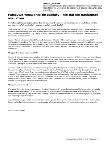 powiat_klodzki http://powiat.klodzko.pl/powiatowy-rzecznik-konsumenta/aktual nosci/falszywe-wezwania-do-zaplaty-nie-daj-sie-naciagnac-oszu stom.html Fałszywe wezwania do zapłaty - nie daj się naciągnąć oszustom Wy?udzanie pieni?dzy nie jest jedynie domen? klasycznych oszustów, ale i instytucji, które w za?o?eniu powinny charakteryzowa? si? uczciwo?ci? i transparentno?ci? swoich dzia?a?. Oszu?ci chwytaj? si? dzi? ka?dego sposobu, aby wy?udzi? nasze pieni?dze lub dane osobowe. Jedn? z metod stosowanych przez naci?gaczy jest rozsy?anie pism, w których oszu?ci domagaj? si? zap?aty podszywaj?c si? pod zaufan? instytucj? bank, administracj? podatkow? czy KRRiT. Niestety szemranych sztuczek coraz cz??ciej chwytaj? si? równie? ci, którzy powinni sta? na stra?y prawa. Krajowy Rejestr Informacji o Przedsi?biorcach, Kancelaria Odpisów z Monitora S?dowego i Gospodarczego, ORF Ogólnopolski Rejestr Firm. Co ??czy?o te wszystkie instytucje? Jedynym celem ich funkcjonowania by?o pobieranie op?at od nie?wiadomych przedsi?biorców za - rzekomo obowi?zkowy - wpis do rejestru. Szacuje si?, ?e tylko jedna z takich firm mog?a wy?udzi? ponad 1 mln z? od blisko 12 tys. osób. Takie zarzuty postawi?a niedawno jej w?a?cicielowi ostro??cka prokuratura. Fikcyjny obowi?zek - realne pieni?dze Schemat dzia?ania jest zazwyczaj podobny. W?a?ciciel firmy otrzymuje wiarygodnie wygl?daj?ce pismo - cz?sto z kilkoma „urz?dowymi” podpisami i piecz?tkami. Informowany jest w nim o obowi?zku wpisu do okre?lonego zbioru danych o przedsi?biorcach. W tym miejscu oszu?ci bardzo cz?sto powo?uj? si? na nieistniej?ce przepisy prawne. Ostrzegaj? równie? o rzekomych karach gro??cych za zignorowanie nades?anego pisma. Dla wielu przedsi?biorców takie „uwiarygodnienie” pisma jest wystarczaj?cym powodem, aby potraktowa? otrzymany dokument powa?nie. W obawie przed wysok? grzywn? lub dla „?wi?tego spokoju” przedsi?biorcy decyduj? si? na wpis do rejestru - co wi??e si? oczywi?cie z uiszczeniem odpowiedniej op?aty. Wci?? nie brakuje równie? oszustów, którzy proponuj? firmom pobranie op?aty za wpis do Centralnej Ewidencji i Informacji o Dzia?alno?ci Gospodarczej (CEIDG). S?k w tym, ?e wpis do prowadzonego przez Ministra Gospodarki rejestru jest bezp?atny. Oszustw zwi?zanych z CEIDG w ostatnich latach by?o tak wiele, ?e dzi?, po wej?ciu na stron? Ewidencji, wita nas ogromny banner z ostrze?eniem przed osobami wy?udzaj?cymi op?aty od przedsi?biorców. Abonamentowy szwindel W styczniu 2014 roku do skrzynek pocztowych wielu Polaków trafi?y pisma, których nadawc? by?a tajemnicza „Agencja Komornicza w Warszawie”. W ich tre?ci znajdywa?o si? wezwanie do uregulowania zaleg?o?ci w uiszczaniu „op?aty abonamentowej Krajowej Rady Radiofonii i Telewizji”. Dla uwiarygodnienia oszustwa na dokumencie pojawi?o si? równie? logo Krajowego Rejestru D?ugów. Oczywi?cie na wykrycie takich oszustw równie? istnieje sposób. Wystarczy zweryfikowa? spraw? u ?róde? - zadzwoni? do danego urz?du lub instytucji, która rzekomo jest nadawc? danego pisma i poprosi? o potwierdzenie jego wiarygodno?ci. ?ród?o: Gazeta Prawna Data publikacji 2017-03-07 13:59:45, Strona: 1/1