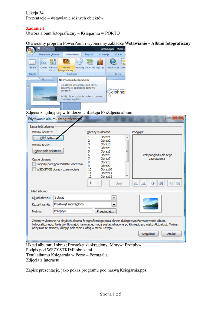 Lekcja 34 Prezentacje – wstawianie różnych obiektów Zadanie 1 Utwórz album fotograficzny – Księgarnia w PORTO Otwieramy program PowerPoint i wybieramy zakładkę Wstawianie – Album fotograficzny Zdjęcia znajdują się w folderze …\Lekcja P3\Zdjęcia album Układ albumu: 1obraz; Prostokąt zaokrąglony; Motyw: Przepływ. Podpis pod WSZYSTKIMI obrazami Tytuł albumu Księgarnia w Porto – Portugalia. Zdjęcia z Internetu. Zapisz prezentację, jako pokaz programu pod nazwą Księgarnia.pps. Strona 1 z 5 Zadanie 2 Utwórz nową prezentację, zapisz ją, jako prezentację program pod nazwą Wstawianie.ppt Ćwiczenie 1 Slajd tytułowy ĆWICZENIA – Motyw1 Wstaw slajd 2 - TYP Tytuł i zawartość slajdu Korzystając z menu podręcznego zduplikuj go 3 razy. Ćwiczenie 2 Na slajdzie 3 wstaw Grafikę SmartArt - Hierarchia Nadaj tytuł temu slajdowi „Zarząd” i przedstaw Układ Strona 2 z 5 Ćwiczenie 3 Na slajdzie 4 wstaw Wykres – kołowy z efektem 3-W Dane do wykresu Styczeń Luty Marzec Kwiecień Maj Czerwiec Sprzedaż 12 8 16 13 18 14 Ćwiczenie 4 Na slajdzie 5 wstaw Tabelkę 5 kolumn i 10 wierszy Strona 3 z 5 Ćwiczenie 5 Wstaw nowe slajdy – 6 i 7. Typu tytuł i zawartość. Na szóstym slajdzie wstaw zdjęcie z folderu …\Lekcja P3\siedziba.jpg Ćwiczenie 6 Na siódmym slajdzie wstaw ClipArt – Biznes Zadanie 3 Do prezentacji wstaw kolejny slajd. Typu tytuł i zawartość. Wykorzystaj punktory i zastosuj różne Wejścia – animacja tekstu. Każda cecha ma się pojawiać osobno po kliknięciu myszy. Strona 4 z 5 Zapisz tworzoną na lekcji prezentację Zadanie domowe Przygotuj krótką prezentację Przyjaciel. Płyta z książki … \Etap 6\Spotkanie_26\Cwiczenia\Przyjaciel Strona 5 z 5