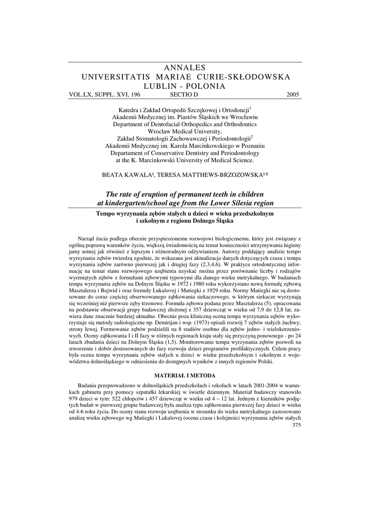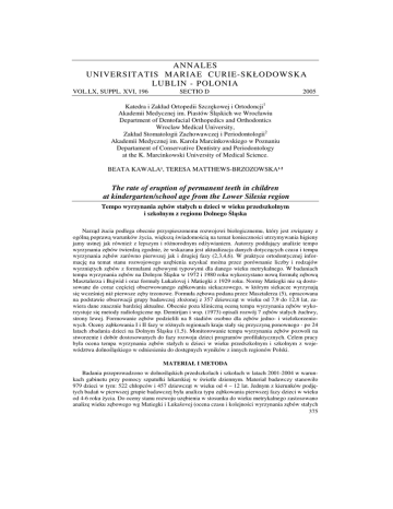 ANNALES UNIVERSITATIS MARIAE CURIE-SKŁODOWSKA LUBLIN - POLONIA VOL.LX, SUPPL. XVI, 196 SECTIO D 2005 Katedra i Zakład Ortopedii Szczękowej i Ortodoncji1 Akademii Medycznej im. Piastów Śląskich we Wrocławiu Department of Dentofacial Orthopedics and Orthodontics Wroclaw Medical University, Zakład Stomatologii Zachowawczej i Periodontologii2 Akademii Medycznej im. Karola Marcinkowskiego w Poznaniu Departament of Conservative Dentistry and Periodontology at the K. Marcinkowski University of Medical Science. BEATA KAWALA¹, TERESA MATTHEWS-BRZOZOWSKA¹,² The rate of eruption of permanent teeth in children at kindergarten/school age from the Lower Silesia region Tempo wyrzynania zębów stałych u dzieci w wieku przedszkolnym i szkolnym z regionu Dolnego Śląska Narząd żucia podlega obecnie przyspieszonemu rozwojowi biologicznemu, który jest związany z ogólną poprawą warunków życia, większą świadomością na temat konieczności utrzymywania higieny jamy ustnej jak również z lepszym i różnorodnym odżywianiem. Autorzy poddający analizie tempo wyrzynania zębów twierdzą zgodnie, że wskazana jest aktualizacja danych dotyczących czasu i tempa wyrzynania zębów zarówno pierwszej jak i drugiej fazy (2,3,4,6). W praktyce ortodontycznej informację na temat stanu rozwojowego uzębienia uzyskać można przez porównanie liczby i rodzajów wyrzniętych zębów z formułami zębowymi typowymi dla danego wieku metrykalnego. W badaniach tempa wyrzynania zębów na Dolnym Śląsku w 1972 i 1980 roku wykorzystano nową formułę zębową Masztalerza i Bujwid i oraz formuły Lukašovej i Matiegki z 1929 roku. Normy Matiegki nie są dostosowane do coraz częściej obserwowanego ząbkowania siekaczowego, w którym siekacze wyrzynają się wcześniej niż pierwsze zęby trzonowe. Formuła zębowa podana przez Masztalerza (5), opracowana na podstawie obserwacji grupy badawczej złożonej z 357 dziewcząt w wieku od 7,9 do 12,8 lat, zawiera dane znacznie bardziej aktualne. Obecnie poza kliniczną oceną tempa wyrzynania zębów wykorzystuje się metody radiologiczne np. Demirijan i wsp. (1973) opisali rozwój 7 zębów stałych żuchwy, strony lewej. Formowanie zębów podzielili na 8 stadiów osobno dla zębów jedno- i wielokorzeniowych. Oceny ząbkowania I i II fazy w różnych regionach kraju stały się przyczyną ponownego - po 24 latach zbadania dzieci na Dolnym Śląsku (1,5). Monitorowanie tempa wyrzynania zębów pozwoli na stworzenie i dobór dostosowanych do fazy rozwoju dzieci programów profilaktycznych. Celem pracy była ocena tempa wyrzynania zębów stałych u dzieci w wieku przedszkolnym i szkolnym z województwa dolnośląskiego w odniesieniu do dostępnych wyników z innych regionów Polski. MATERIAŁ I METODA Badania przeprowadzono w dolnośląskich przedszkolach i szkołach w latach 2001-2004 w warunkach gabinetu przy pomocy szpatułki lekarskiej w świetle dziennym. Materiał badawczy stanowiło 979 dzieci w tym: 522 chłopców i 457 dziewcząt w wieku od 4 – 12 lat. Jednym z kierunków podjętych badań w pierwszej grupie badawczej była analiza typu ząbkowania pierwszej fazy dzieci w wieku od 4-6 roku życia. Do oceny stanu rozwoju uzębienia w stosunku do wieku metrykalnego zastosowano analizę wieku zębowego wg Matiegki i Lukašovej (ocena czasu i kolejności wyrzynania zębów stałych 375 osobno dla dziewcząt i chłopców) oraz formuły zębowe dla dzieci polskich wg Masztalerza i Bujwid (ocena czasu, kolejności i liczby wyrzniętych zębów stałych). Materiał badawczy podzielono na 3 grupy ze względu na wiek metrykalny. I grupę stanowiły dzieci w wieku od 4 do 6 roku życia, II grupę - dzieci w wieku od 6 do 9 roku życia, III grupę - dzieci w wieku od 9 do 12 roku życia. WYNIKI Najczęściej występującym typem wyrzynania zębów był typ mieszany rozpoznany u 52% dziewcząt i 58% chłopców. Typ wyrzynania siekaczowego dominował nad typem trzonowcowym i stanowił: u dziewcząt 36% a u chłopców 27% badanej grupy. Tempo wyrzynania w I grupie badawczej; wśród dziewcząt w 79% mieściło się w granicach normy wg Lukasowej i wg Masztalerza i Bujwidowej. U 21% stwierdzono przyspieszony typ ząbkowania. U chłopców prawidłowe tempo wyrzynania rozpoznano u 77% badanych a u 23% obserwowano przyspieszone tempo wyrzynania. W II grupie badawczej ustalono, że przyspieszone tempo wyrzynania wystąpiło u dziewcząt i chłopców w 65% analizując wg Lukasowej i Matiegki. W III grupie badawczej u 43% dziewcząt i u 50% chłopców występował wiek kalendarzowy zgodny z normą wieku zębowego. Ponadto ustalono spowolnienie tempa wyrzynania zębów u 35%dziewcząt i 40% chłopców. W grupach I i II obserwuje się wyraźną akcelerację wyrzynania zębów stałych. U dziewcząt wyrzynanie zębów stałych następuje wcześniej niż u chłopców. W grupie III wzrasta odsetek dzieci z opóźnionym wyrzynaniem, jednak przeważają dzieci z uzębieniem zgodnym z wiekiem kalendarzowym. W grupie I zaobserwowano przewagę mieszanego typu wyrzynania, co wskazuje na zmianę kolejności wyrzynania poszczególnych zębów. Dominuje typ siekaczowy wyrzynania zębów nad typem trzonowcowym. OMÓWIENIE WYNIKÓW I DYSKUSJA W praktyce ortodontycznej ważna jest ocena wieku zębowego, ponieważ pozwala to na ustalenie odpowiedniego planu leczenia dobranego do wieku rozwojowego pacjenta, nie zawsze zgodnego z wiekiem kalendarzowym. Obserwowane w ostatnich dziesięcioleciach przyspieszenie rozwoju somatycznego dotyczy dzieci w całej Polsce. Badania prowadzone przez Szpringer – Nodzak i wsp. potwierdzają szybsze tempo wyrzynania zębów u dziewcząt w drugiej fazie wymiany uzębienia. Badania tych samych autorów dotyczące dzieci w pierwszej fazie wyrzynania zębów są zgodne z naszymi spostrzeżeniami i potwierdzają szybsze tempo wyrzynania u dziewcząt o 18% w stosunku do chłopców. Nieco odmienne obserwacje były dokonane przez Szpringer – Nodzak i wsp