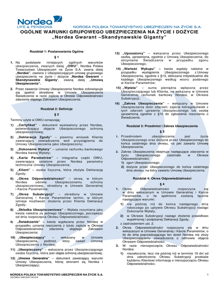 OGÓLNE WARUNKI GRUPOWEGO UBEZPIECZENIA NA ŻYCIE I DOŻYCIE „Nordea Gwarant –Skandynawskie Giganty” Rozdział 1: Postanowienia Ogólne §1 1. Na podstawie niniejszych ogólnych warunków ubezpieczenia, zwanych dalej „OWU”, Nordea Polska Towarzystwo Ubezpieczeń na Życie S.A. zwana dalej „Nordea”, zawiera z Ubezpieczającym umowę grupowego ubezpieczenia na życie i dożycie „Nordea Gwarant – Skandynawskie Giganty”, zwaną dalej „Umową Ubezpieczenia”. 2. Przez zawarcie Umowy Ubezpieczenia Nordea zobowiązuje się spełnić określone w Umowie Ubezpieczenia Świadczenie w razie zajścia w Okresie Odpowiedzialności zdarzenia objętego Zakresem Ubezpieczenia. §2 Terminy użyte w OWU oznaczają: „Deklaracja Zgody” – pisemny wniosek Klienta zawierający oświadczenie woli przystąpienia do Umowy Ubezpieczenia jako Ubezpieczony; 3) „Dokonanie Wpłaty” – uznanie rachunku bankowego Nordea kwotą Wpłaty; 4) „Karta Parametrów” – integralna część OWU, zawierająca ustalone przez Nordea parametry techniczne Umowy Ubezpieczenia; 5) „Klient” – osoba fizyczna, która złożyła Deklarację Zgody; 6) „Okres Odpowiedzialności” – okres, w którym Nordea udziela Ubezpieczonemu ochrony ubezpieczeniowej, określony w Umowie Generalnej i Karcie Parametrów; 8) 9) 15) „Wpłata” – suma pieniężna wpłacona przez Ubezpieczającego lub Klienta, na wskazany w Umowie Generalnej rachunek bankowy Nordea, w Okresie Subskrypcji; „Certyfikat” - dokument wystawiony przez Nordea, potwierdzający objęcie Ubezpieczonego ochroną ubezpieczeniową; 2) 7) 14) „Wartość Wykupu” – kwota wypłaty należna w przypadku wystąpienia Ubezpieczonego z Umowy Ubezpieczenia, zgodnie z §13, obliczana indywidualnie dla każdego Ubezpieczonego według wzoru podanego w Karcie Parametrów; 16) „Zakres Ubezpieczenia” – wskazany w Umowie Ubezpieczenia zbiór zdarzeń; zajście któregokolwiek z tych zdarzeń uprawnia Ubezpieczonego lub osobę uprawnioną zgodnie z §10 do zgłoszenia roszczenia o Świadczenie. Rozdział 2: Definicje 1) 13) „Uposażony” – wskazana przez Ubezpieczonego osoba, uprawniona, zgodnie z Umową Ubezpieczenia, do otrzymania Świadczenia w przypadku zgonu Ubezpieczonego; Rozdział 3: Przedmiot i Zakres Ubezpieczenia §3 1. Przedmiotem ubezpieczenia jest życie Ubezpieczonego oraz dożycie przez Ubezpieczonego do końca ostatniego dnia okresu, na jaki zawarto Umowę Ubezpieczenia. 2. Zakres Ubezpieczenia obejmuje następujące zdarzenia w życiu Ubezpieczonego zaistniałe w Okresie Odpowiedzialności: 1) zgon Ubezpieczonego; 2) dożycie przez Ubezpieczonego do końca ostatniego dnia okresu, na który zawarto Umowę Ubezpieczenia. Rozdział 4: Okres Odpowiedzialności §4 1. Okres Odpowiedzialności rozpoczyna się w dniu wskazanym w Umowie Generalnej i Karcie Parametrów, o ile spełnione zostaną łącznie następujące warunki: „Okres Subskrypcji” – określony w Umowie Generalnej i Karcie Parametrów termin, w którym istnieje możliwość złożenia przez Klienta Deklaracji Zgody; 1) „Składka Ubezpieczeniowa” – Wpłata rozumiana jako kwota należna za jednego Ubezpieczonego, począwszy od dnia rozpoczęcia Okresu Odpowiedzialności; 2) „Świadczenie” – kwota wypłacana przez Nordea w przypadku uznania roszczenia z tytułu zajścia w Okresie Odpowiedzialności zdarzenia objętego Zakresem Ubezpieczenia; 10) „Ubezpieczający” – Ubezpieczenia, podmiot, Ubezpieczenia z Nordea; wskazany w który zawarł Umowie Umowę 11) „Ubezpieczony” – wskazana przez Ubezpieczającego osoba fizyczna, która jest objęta ochroną ubezpieczeniową; 12) „Umowa Generalna” – dokument zawierający warunki Umowy Ubezpieczenia, której stronami są Nordea i Ubezpieczający; NORDEA POLSKA TOWARZYSTWO UBEZPIECZEŃ NA ŻYCIE S.A. UG/OWU/149019/07-2010/A nie później niż do końca następnego dnia roboczego po upływie Okresu Subskrypcji nastąpi Dokonanie Wpłaty, w Okresie Subskrypcji nastąpi złożenie prawidłowo wypełnionej i podpisanej Deklaracji Zgody, z zastrzeżeniem ust. 2. 2. Okres Odpowiedzialności rozpoczyna się w dniu wskazanym w Umowie Generalnej i Karcie Parametrów, o ile do dnia poprzedzającego ten dzień Nordea nie złoży Ubezpieczającemu oświadczenia o odmowie objęcia Okresem Odpowiedzialności. 3. W razie nierozpoczęcia Okresu Odpowiedzialności Nordea: 1) niezwłocznie, lecz nie później niż w terminie 19 dni od dnia zakończenia Okresu Subskrypcji przekaże każdemu Klientowi informację o nierozpoczęciu Okresu Odpowiedzialności, 1 Rozdział 9: Świadczenia 2) niezwłocznie, lecz nie później niż do dnia określonego w Umowie Generalnej i Karcie Parametrów jako dzień rozpoczęcia Okresu Odpowiedzialności, umieści na stronie internetowej www.nordeapolska.pl informację o nierozpoczęciu Okresu Odpowiedzialności. 4. Okres Odpowiedzialności w stosunku do danego Ubezpieczonego kończy się z chwilą: 1) zgonu Ubezpieczonego, 2) wystąpienia Ubezpieczonego z Umowy Ubezpieczenia, zgodnie z § 13, 3) upływu ostatniego dnia okresu, na który zawarto Umowę Ubezpieczenia. 5. W przypadku złożenia przez Nordea oświadczenia, o którym mowa w ust. 2, Nordea dokona zwrotu Wpłat, wraz z odsetkami ustawowymi, liczonymi od dnia Dokonania Wpłaty, na rachunek bankowy podmiotu, który dokonał Wpłaty, w terminie 14 dni roboczych. Rozdział 5: Zawarcie Umowy Ubezpieczenia §5 1. Umowę Ubezpieczenia zawiera się na czas określony, wskazany w Umowie Generalnej i Karcie Parametrów, z zastrzeżeniem ust. 3. 2. Umowę Ubezpieczenia uważa się za zawartą z dniem określonym w Umowie Generalnej. 3. W razie złożenia przez Nordea oświadczenia, o którym mowa w § 4 ust. 2 Umowa Ubezpieczenia ulega rozwiązaniu z tym dniem. 4. Umowa Generalna stanowi integralną część Umowy Ubezpieczenia. §6 1. Ubezpieczający ma prawo pisemnego odstąpienia od Umowy Ubezpieczenia w terminie 7 dni od za