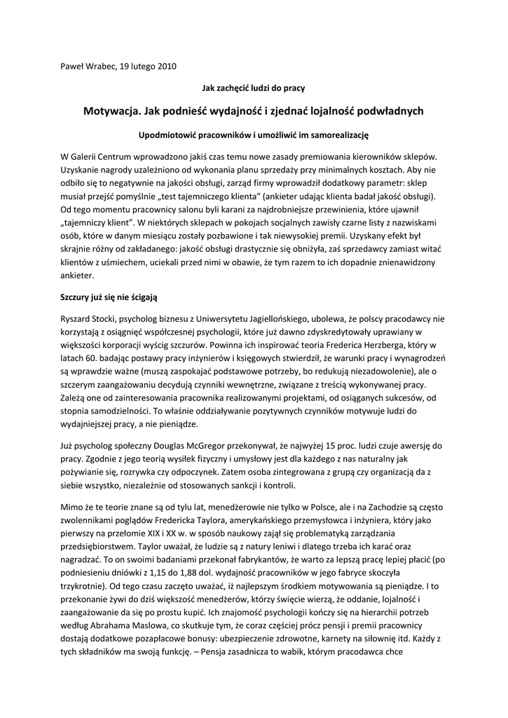 Paweł Wrabec, 19 lutego 2010 Jak zachęcić ludzi do pracy Motywacja. Jak podnieść wydajność i zjednać lojalność podwładnych Upodmiotowić pracowników i umożliwić im samorealizację W Galerii Centrum wprowadzono jakiś czas temu nowe zasady premiowania kierowników sklepów. Uzyskanie nagrody uzależniono od wykonania planu sprzedaży przy minimalnych kosztach. Aby nie odbiło się to negatywnie na jakości obsługi, zarząd firmy wprowadził dodatkowy parametr: sklep musiał przejść pomyślnie „test tajemniczego klienta” (ankieter udając klienta badał jakość obsługi). Od tego momentu pracownicy salonu byli karani za najdrobniejsze przewinienia, które ujawnił „tajemniczy klient”. W niektórych sklepach w pokojach socjalnych zawisły czarne listy z nazwiskami osób, które w danym miesiącu zostały pozbawione i tak niewysokiej premii. Uzyskany efekt był skrajnie różny od zakładanego: jakość obsługi drastycznie się obniżyła, zaś sprzedawcy zamiast witać klientów z uśmiechem, uciekali przed nimi w obawie, że tym razem to ich dopadnie znienawidzony ankieter. Szczury już się nie ścigają Ryszard Stocki, psycholog biznesu z Uniwersytetu Jagiellońskiego, ubolewa, że polscy pracodawcy nie korzystają z osiągnięć współczesnej psychologii, które już dawno zdyskredytowały uprawiany w większości korporacji wyścig szczurów. Powinna ich inspirować teoria Frederica Herzberga, który w latach 60. badając postawy pracy inżynierów i księgowych stwierdził, że warunki pracy i wynagrodzeń są wprawdzie ważne (muszą zaspokajać podstawowe potrzeby, bo redukują niezadowolenie), ale o szczerym zaangażowaniu decydują czynniki wewnętrzne, związane z treścią wykonywanej pracy. Zależą one od zainteresowania pracownika realizowanymi projektami, od osiąganych sukcesów, od stopnia samodzielności. To właśnie oddziaływanie pozytywnych czynników motywuje ludzi do wydajniejszej pracy, a nie pieniądze. Już psycholog społeczny Douglas McGregor przekonywał, że najwyżej 15 proc. ludzi czuje awersję do pracy. Zgodnie z jego teorią wysiłek fizyczny i umysłowy jest dla każdego z nas naturalny jak pożywianie się, rozrywka czy odpoczynek. Zatem osoba zintegrowana z grupą czy organizacją da z siebie wszystko, niezależnie od stosowanych sankcji i kontroli. Mimo że te teorie znane są od tylu lat, menedżerowie nie tylko w Polsce, ale i na Zachodzie są często zwolennikami poglądów Fredericka Taylora, amerykańskiego przemysłowca i inżyniera, który jako pierwszy na przełomie XIX i XX w. w sposób naukowy zajął się problematyką zarządzania przedsiębiorstwem. Taylor uważał, że ludzie są z natury leniwi i dlatego trzeba ich karać oraz nagradzać. To on swoimi badaniami przekonał fabrykantów, że warto za lepszą pracę lepiej płacić (po podniesieniu dniówki z 1,15 do 1,88 dol. wydajność pracowników w jego fabryce skoczyła trzykrotnie). Od tego czasu zaczęto uważać, iż najlepszym środkiem motywowania są pieniądze. I to przekonanie żywi do dziś większość menedżerów, którzy święcie wierzą, że oddanie, lojalność i zaangażowanie da się po prostu kupić. Ich znajomość psychologii kończy się na hierarchii potrzeb według Abrahama Maslowa, co skutkuje tym, że coraz częściej prócz pensji i premii pracownicy dostają dodatkowe pozapłacowe bonusy: ubezpieczenie zdrowotne, karnety na siłownię itd. Każdy z tych składników ma swoją funkcję. – Pensja zasadnicza to wabik, którym pracodawca chce przyciągnąć najbardziej wartościowych ludzi. Premia ma motywować do bardziej wydajnej pracy, a te wszystkie pozapłacowe dodatki mają wzmocnić przywiązanie i lojalność – tłumaczy Marcin Fidecki z firmy doradztwa personalnego Hewitt Associates. Pułapki motywowania Dla pracodawcy kluczowe znaczenie ma premia – to ona ma sprawić, że przeciętny pracownik da z siebie wszystko. Problem w tym, że trudno stworzyć taki system, który byłby wewnętrznie spójny i motywując jednych nie demotywował drugich. Niedawno w pewnej firmie przyznawano bardzo wysokie premie handlowcom za pozyskanie nowych klientów. Wywołało to wściekłość i niezadowolenie pracowników innego działu, którzy tychże klientów musieli później obsługiwać. Zostali przywaleni dodatkową robotą za te same pieniądze co dotychczas. Zarząd opamiętał się, gdy połowa z nich złożyła wypowiedzenia. Inni pracodawcy urządzają konkursy – przyznając na przykład tytuł pracownika miesiąca. To duży błąd, bo taka nagroda zamiast scalać, atomizuje zespół. Z powodu bardzo wysoko zawieszonej poprzeczki wygrywają gwiazdy, podczas gdy pracownicy przeciętni i słabsi – a przecież tych trzeba głównie motywować – czują się sfrustrowani. Widząc, że marchewka jest dla nich niedostępna, tracą wiarę we własne siły. Z systemami wynagrodzenia trzeba uważać, gdyż menedżer dysponujący dużym zakresem władzy w pogoni za wymarzoną premią przestaje się liczyć z podwładnymi. Pracodawca powinien też wiedzieć, że skoro zatrudnia inteligentnych ludzi, ci znajdą jakiś sposób, by premię otrzymać; niekoniecznie musi to być sposób uczciwy. W ubiegłym roku jeden z warszawskich sklepów przecenił na kilka godzin cały sprzęt narciarski o 90 proc. Klienci dziwili się, dlaczego firma sprzedała im narty za 300 zł, skoro jeszcze chwilę temu chciała za nie 3000 zł. Nie była to posezonowa wyprzedaż. Ponieważ do wykonania planu brakowało kilkunastu tysięcy, a właśnie zbliżał się koniec miesiąca, szef sklepu postanowił ratować premię, urządzając cichą wyprzedaż. Pracodawca widząc, jak dobrze idzie sprzedaż, co miesiąc lub dwa podwyższa poprzeczkę. Skutek tego jest na ogół taki, że sprytny handlowiec widząc, że pod koniec miesiąca wypracował swoją normę, odpuszcza. Nawet gdy klient sam się do niego zgłosi, stara się przełożyć spotkanie o tydzi