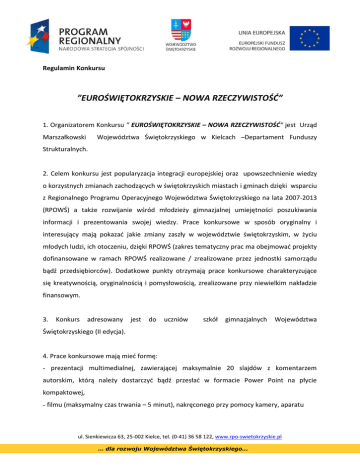 Regulamin Konkursu ”EUROŚWIĘTOKRZYSKIE – NOWA RZECZYWISTOŚĆ” 1. Organizatorem Konkursu ” EUROŚWIĘTOKRZYSKIE – NOWA RZECZYWISTOŚĆ” jest Urząd Marszałkowski Województwa Świętokrzyskiego w Kielcach –Departament Funduszy Strukturalnych. 2. Celem konkursu jest popularyzacja integracji europejskiej oraz upowszechnienie wiedzy o korzystnych zmianach zachodzących w świętokrzyskich miastach i gminach dzięki wsparciu z Regionalnego Programu Operacyjnego Województwa Świętokrzyskiego na lata 2007-2013 (RPOWŚ) a także rozwijanie wśród młodzieży gimnazjalnej umiejętności poszukiwania informacji i prezentowania swojej wiedzy. Prace konkursowe w sposób oryginalny i interesujący mają pokazać jakie zmiany zaszły w województwie świętokrzyskim, w życiu młodych ludzi, ich otoczeniu, dzięki RPOWŚ (zakres tematyczny prac ma obejmować projekty dofinansowane w ramach RPOWŚ realizowane / zrealizowane przez jednostki samorządu bądź przedsiębiorców). Dodatkowe punkty otrzymają prace konkursowe charakteryzujące się kreatywnością, oryginalnością i pomysłowością, zrealizowane przy niewielkim nakładzie finansowym. 3. Konkurs adresowany jest do uczniów szkół gimnazjalnych Województwa Świętokrzyskiego (II edycja). 4. Prace konkursowe mają mieć formę: - prezentacji multimedialnej, zawierającej maksymalnie 20 slajdów z komentarzem autorskim, którą należy dostarczyć bądź przesłać w formacie Power Point na płycie kompaktowej, - filmu (maksymalny czas trwania – 5 minut), nakręconego przy pomocy kamery, aparatu ul. Sienkiewicza 63, 25-002 Kielce, tel. (0-41) 36 58 122, www.rpo-swietokrzyskie.pl … dla rozwoju Województwa Świętokrzyskiego... fotograficznego lub telefonu komórkowego. Konkursowy film należy dostarczyć bądź przesłać w formacie DVD na płycie kompaktowej. - prace konkursowe muszą być pracami zbiorowymi uczniów danej szkoły. 5. Prace konkursowe zapisane na nośniku w formie płyty CD lub DVD (płyta musi zostać opisana, opis ma zawierać dane szkoły biorącej udział w konkursie) należy przekazać do organizatora konkursu osobiście lub za pośrednictwem poczty na koszt wysyłającego. Należy dołączyć formularz zgłoszeniowy zawierający m.in. imię i nazwisko autora lub autorów pracy, nazwisko opiekuna lub wychowawcy oraz szkołę, którą reprezentują oraz adres do korespondencji wraz z telefonem. 7. Prace należy nadsyłać na adres: Urząd Marszałkowski Województwa Świętokrzyskiego w Kielcach Departament Funduszy Strukturalnych ul. Sienkiewicza 63, 25-002 Kielce z dopiskiem: Konkurs ”EUROŚWIĘTOKRZYSKIE – NOWA RZECZYWISTOŚĆ” lub dostarczyć osobiście do Departamentu Funduszy Strukturalnych, ul. Sienkiewicza 63, Kielce, 2 piętro, Sekretariat - pokój 212. 8. W konkursie mogą brać udział jedynie te prace, które nie były nigdzie publikowane, ani nie brały udziału w żadnym innym konkursie. 9. Nadesłane na nośnikach elektronicznych prace nie będą zwracane uczestnikom konkursu. Organizator zastrzega sobie prawo do ich ekspozycji i publikacji. Z każdego gimnazjum może być przesłana 1 praca zbiorowa. 10. Termin nadsyłania prac mija 15 czerwca 2012 r. 11. Prace nadesłane na konkurs oceni jury powołane przez organizatora. Jury zastrzega sobie prawo do wyłaniania zwycięzców, jak i przyznawania miejsc ex equo. 12. Organizator przewiduje przyznanie atrakcyjnych 20 równorzędnych nagród rzeczowych ul. Sienkiewicza 63, 25-002 Kielce, tel. (0-41) 36 58 122, www.rpo-swietokrzyskie.pl … dla rozwoju Województwa Świętokrzyskiego... w postaci edukacyjnych zestawów multimedialnych składających się z tablicy multimedialnej, rzutnika oraz głośników dla 20 zwycięskich szkół. 13. Uroczyste wręczenie nagród laureatom konkursu przewidziane jest na wrzesień 2012 r. Przedsięwzięcie to ma na celu promocję RPOWŚ na lata 2007-2013. Zwycięzcy zobowiążą się do osobistego odbioru nagród z siedziby organizatora (zapewnienie odpowiedniego transportu w celu przewiezienia sprzętu do szkół). 14. Dostarczenie prac na konkurs jest jednoznaczne z oświadczeniem o posiadaniu praw autorskich do zgłoszonych prac i uznaniem niniejszego regulaminu. 15. Źródła informacji dla uczestników konkursu: - ogół informacji a w szczególności mapa projektów RPOWŚ na lata 2007-2013 znajdująca się na stronie www.rpo-swietokrzyskie.pl, - Regionalny Program Operacyjny Województwa Świętokrzyskiego na lata 2007-2013, - Szczegółowy Opis Osi Priorytetowych RPOWŚ - Uszczegółowienie RPOWŚ, - Strategia Rozwoju Województwa Świętokrzyskiego do roku 2020, - strona internetowa www.funduszestrukturalne.gov.pl 16. Wszelkie informacje na temat konkursu znaleźć można na stronie internetowej www.rpo-swietokrzyskie.pl Informacji telefonicznych udzielają: Agnieszka Matachowska, Anna Wołowiec tel. 0-41 36 58 122 ul. Sienkiewicza 63, 25-002 Kielce, tel. (0-41) 36 58 122, www.rpo-swietokrzyskie.pl … dla rozwoju Województwa Świętokrzyskiego...