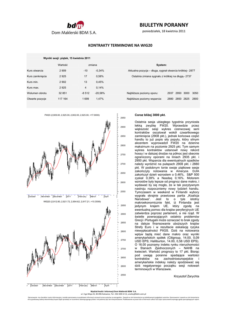 BIULETYN PORANNY poniedziałek, 18 kwietnia 2011 KONTRAKTY TERMINOWE NA WIG20 Wyniki sesji: piątek, 15 kwietnia 2011 Wartość zmiana System: Kurs otwarcia 2 909 -10 -0,34% Aktualna pozycja – długa, sygnał otwarcia krótkiej– 2877 Kurs zamknięcia 2 925 17 0,58% Ostatnia zmiana sygnału z krótkiej na długą– 2737 Kurs min. 2 902 13 0,45% Kurs max. 2 925 4 0,14% Wolumen obrotu 32 851 -8 512 -20,58% Otwarte pozycje 117 164 1 699 1,47% Najbliższe poziomy oporu: 2937 2950 3000 3050 Najbliższe poziomy wsparcia: 2880 2850 2825 2800 FW20 (2,909.00, 2,925.00, 2,902.00, 2,925.00, +17.0000) 2950 2900 2850 2800 2750 2700 2650 2600 2550 October November December 2011 February March April WIG20 (2,912.80, 2,921.72, 2,904.62, 2,917.21, +10.3599) 2950 2900 2850 2800 2750 2700 2650 2600 Coraz bliżej 3000 pkt. Ostatnia sesja ubiegłego tygodnia przyniosła lekką zwyżkę FW20. Wprawdzie przez większość sesji wykres czerwcowej serii kontraktów oscylował wokół czwartkowego zamknięcia (2908 pkt.), jednak końcowa część handlu to już popis siły popytu, który silnym akcentem wyprowadził FW20 na dzienne maksimum na poziomie 2925 pkt. Tym samym wykres kontraktów ustanowił nowy rekord hossy i w dalszej drodze na północ jest obecnie ograniczony oporami na liniach 2935 pkt. i 2950 pkt. Wsparcia dla ewentualnych spadków należy wyróżnić na pułapach 2908 pkt. i 2880 pkt. W podobnym tonie swoje piątkowe sesje zakończyły notowania w Ameryce. DJIA zakończył dzień wzrostem o 0,46%, S&P 500 zyskał 0,39% a Nasdaq 0,16%. Motorem wzrostów były lepsze od prognoz dane makro, i wydawać by się mogło, że w tak pozytywnym nastroju rozpoczniemy nowy tydzień handlu. Tymczasem w weekend w Finlandii wybory wygrała skrajnie prawicowa partia „Koalicja Narodowa”. Jest to o tyle istotny makroekonomicznie fakt, iż Finlandia jest jedynym krajem UE, który zgodę na ewentualną pomoc dla krajów peryferyjnych UE zatwierdza poprzez parlament, a nie rząd. W świetle powracających ostatnio problemów Grecji i Portugalii może oznaczać to brak zgody na dalsze finansowanie uboższych krajów Strefy Euro i w rezultacie eskalację ryzyka niewypłacalności PIIGS. Dziś na notowania wpływ będą mieć dane makro oraz wyniki amerykańskich spółek (Citigroup, 14.00, 0,09 USD EPS; Halliburton, 14.00, 0,58 USD EPS). O 16.00 poznamy indeks rynku nieruchomości w Stanach Zjednoczonych – NAHB na kwiecień. Wartość prognozy to 17 pkt. Biorąc pod uwagę poranne spadające wartości kontraktów na zachodnioeuropejskie i amerykańskie indeksy należy spodziewać się dziś negatywnego początku sesji notowań terminowych w Warszawie. 2550 r October November December 2011 February March Krzysztof Zarychta April Wydział Analiz i Informacji Dom Maklerski BDM S.A. ul. 3‐go Maja 23, 40‐096 Katowice, Tel.: 032 208 14 12, [email protected] Opracowanie ma charakter czysto informacyjny i zostało opracowany na podstawie informacji uznanych przez autorów za wiarygodne . Zawarte w nim komentarze są subiektywnymi poglądami autorów. Opracowanie i zawarte w nim komentarze nie są podstawą żadnej rekomendacji kupna bądź sprzedaży w rozumieniu obowiązującego prawa i nie powinny być tak interpretowane. Publikowanie w prasie lub w Internecie całości lub części opracowania wymaga zgody sporządzających raport. BIULETYN PORANNY poniedziałek, 18 kwietnia 2011 RYNEK AKCJI Wyniki sesji: piątek, 15 kwietnia 2011. Kurs max. Zakres wahań Wartość obrotów [mln PLN] 508,7 52 tygodnie Indeks Kurs otwarcia Kurs max. Kurs zamknięcia Zmiana [%] Kurs min. Kurs min. WIG20 2 942,4 2 240,2 2 912,80 2 917,21 0,36% 2 904,62 2 921,72 17,1 sWIG80 12 936,5 10 926,5 12 686,63 12 738,13 0,28% 12 654,34 12 738,13 83,8 70,5 mWIG40 2 993,2 2 333,8 2 943,74 2 954,02 0,30% 2 931,94 2 956,32 24,4 296,0 WIG PL 49 765,2 38 136,6 49 201,83 49 402,20 0,34% 49 201,83 49 402,20 200,4 875,9 WIG 50 501,8 38 900,2 49 912,39 50 016,31 0,34% 49 793,30 50 016,31 223,0 903,6 Spółka Cena [PLN] zmiana % Mkt Cap [mln PLN] zmiana % względem WIG20 dzienna 1M 3M 6M dzienna 1M 3M 6M -3,2% -8,6% -6,4% 9,3% ASSECOPOL 53,15 4 411 0,4% 1,7% -4,2% 3,1% 0,0% BANK HANDLOWY 104,00 13 589 0,0% 10,9% 11,8% 18,9% -0,4% 5,9% 7,4% BOGDANKA 126,00 4 286 0,2% -1,1% 12,0% 19,3% -0,2% -6,0% 7,6% 9,8% BRE 347,00 14 604 0,6% 5,3% 14,5% 27,1% 0,2% 0,4% 10,1% 17,6% CEZ 145,50 78 278 1,4% 7,8% 4,7% 20,5% 1,0% 2,8% 0,3% 11,0% GETIN 14,99 10 700 1,6% 12,6% 21,8% 41,8% 1,3% 7,7% 17,4% 32,3% GTC 21,29 4 670 -0,1% 1,5% -12,6% -5,4% -0,5% -3,5% -17,0% -14,9% KERNEL 72,50 5 341 0,0% -9,9% -8,2% 12,9% -0,4% -14,9% -12,6% 3,4% KGHM 193,70 38 740 1,8% 10,7% 3,3% 46,9% 1,5% 5,7% -1,1% 37,3% LOTOS 47,99 6 233 0,2% 11,6% 22,2% 56,6% -0,2% 6,7% 17,8% 47,1% PBG 174,10 2 489 -0,1% -11,9% -17,1% -23,5% -0,4% -16,8% -21,4% -33,0% PEKAO 176,00 46 176 -0,5% 5,3% 1,4% -3,9% -0,8% 0,3% -2,9% -13,5% PGE 23,20 43 379 -0,1% 1,0% -0,6% 5,9% -0,4% -3,9% -5,0% -3,6% PGNIG 3,79 22 361 0,5% 2,2% 7,4% 8,0% 0,2% -2,8% 3,0% -1,6% PKNORLEN 57,20 24 465 0,4% 10,0% 16,7% 44,4% 0,0% 5,1% 12,3% 34,9% PKOBP 46,25 57 813 0,2% 7,6% 7,8% -0,8% -0,1% 2,6% 3,4% -10,3% PZU 364,10 31 441 0,2% 0,5% 2,6% -5,7% -0,2% -4,5% -1,8% -15,2% TAURON 6,27 10 988 -0,6% -2,9% -5,3% 2,8% -1,0% -7,9% -9,7% -6,7% TPSA 17,65 23 574 -0,4% 5,7% 8,7% -2,5% -0,8% 0,7% 4,3% -12,0% TVN 17,32 5 937 0,2% 4,3% 0,8% -7,5% -0,2% -0,6% -3,6% -17,0% Komentarz po sesji Komentarz przed sesją: Przystanek przy maksimach Końcówka tygodnia na naszym rynku nie przyniosła większego przełomu. Od ubiegłego piątku dotychczasowy wzrost uległ zatrzymaniu, ale jeśli spojrzeć na rynek przez pryzmat głębokości cofnięcia, to byki z każdym kolejnym dniem utrzymywania rynku relatywnie blisko maksimów wypracowują sobie argumenty, które z czasem mają spore szanse posłużyć jako baza do kontynuacji ruchu. Biorąc pod uwagę długość obecnego zatrzymania można przypuszczać, że rozstrzygnięcia pojawią się już lada mo