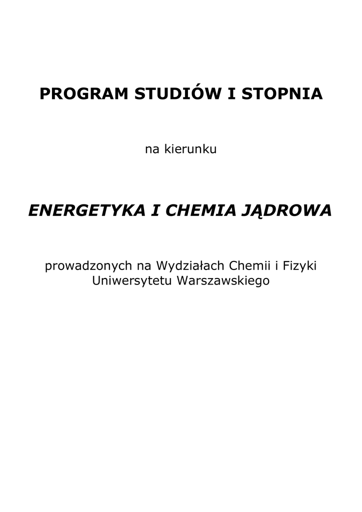 PROGRAM STUDIÓW I STOPNIA na kierunku ENERGETYKA I CHEMIA JĄDROWA prowadzonych na Wydziałach Chemii i Fizyki Uniwersytetu Warszawskiego Wakacyjne zajęcia przygotowawcze (wrzesień) Przedmiot Matematyka Fizyka Chemia Suma godzin 30 25 30 85 Wykłady Ćwicz. Lab. ECTS Forma zaliczenia Suma godzin 180 60 Wykłady Ćwicz. Lab. ECTS 12 5 Forma zaliczenia Egzamin Egzamin 30 30 2,5 Egzamin Semestr 1 (Rok 1, Semestr 1) Przedmiot Rachunek różniczkowy i całkowy Algebra z geometrią 90 30 90 30 Chemia nieorganiczna z elementami syntezy nieorganicznej WYKŁAD Chemia nieorganiczna z elementami syntezy nieorganicznej LABORATORIUM Zajęcia ogólnouniwersyteckie BHP Zajęcia ogólnouniwersyteckie Ochrona własności intelektualnej Język obcy (60) 2 WF lub zajęcia ogólnouniwersyteckie Przedmioty do wyboru Podstawy fizyki współczesnej (30) 30 30 0,5 2 2 60 60 5 Zaliczenie na ocenę 0,5 0,5 30 Wstęp do fizyki I 30 30 2 Podstawy obliczeń chemicznych 30 30 2 360 (450) 30 Zaliczenie na ocenę Zaliczenie na ocenę Zaliczenie na ocenę Zaliczenie na ocenę Semestr 2 (Rok 1, Semestr 2) Przedmiot Analiza Programowanie Mechanika i szczególna teoria względności Wstęp do analizy danych Suma godzin 135 30 Wykłady 60 75 30 9,5 2 120 60 60 8 15 15 Pracownia fizyczna i elektroniczna 45 Chemia organiczna z elementami biochemii WYKŁAD Proseminarium chemii organicznej 30 Język obcy WF lub zajęcia ogólnouniwersyteckie Ćwicz. Lab. ECTS 1 45 30 4 2 15 1 (60) 2 (30) 390 (480) 0,5 30 Forma zaliczenia Egzamin Zaliczenie na ocenę Egzamin Zaliczenie na ocenę Zaliczenie na ocenę Egzamin Zaliczenie na ocenę Zaliczenie na ocenę Semestr 3 (Rok 2, Semestr 1) Przedmiot Suma godzin 60 Wykłady 15 45 Elektrodynamika Chemia organiczna z elementami biochemii LABORATORIUM Chemia fizyczna WYKŁAD Chemia fizyczna ĆWICZENIA 120 90 60 60 30 30 30 Chemia fizyczna LABORATORIUM 60 Metody numeryczne Zajęcia ogólnouniwersyteckie lub WF WF lub zajęcia ogólnouniwersyteckie Ćwicz. Lab. ECTS 4 90 8 7 2 2 30 60 4,5 (30) 2 (30) 390 (450) 0,5 30 Forma zaliczenia Zaliczenie na ocenę Egzamin Zaliczenie na ocenę Egzamin Zaliczenie na ocenę Zaliczenie na ocenę Zaliczenie na ocenę Semestr 4 (Rok 2, Semestr 2) Przedmiot Mechanika i chemia kwantowa z elementami spektroskopii molekularnej Krystalografia z elementami teorii grup Spektroskopia molekularna Analiza instrumentalna Podstawy fizyki subatomowej Ochrona radiologiczna Zajęcia ogólnouniwersyteckie lub WF Egzamin certyfikujący z języka obcego WF lub zajęcia ogólnouniwersyteckie Suma godzin 120 Wykłady Ćwicz. 60 60 9,5 45 15 30 3 Egzamin 15 1 30 3 4 30 5 2 Zaliczenie na ocenę Egzamin Zaliczenie na ocenę Egzamin Zaliczenie na ocenę Egzamin 15 45 60 15 30 30 75 (30) 30 15 Lab. ECTS 2 (30) 360 (420) Forma zaliczenia Egzamin 0,5 30 Semestr 5 (Rok 3, Semestr 1) Przedmiot Elementy termodynamiki i fizyki statystycznej Elementy astronomii i astrofizyki jądrowej Zastosowania fizyki jądrowej Zaawansowana fizyka jądrowa WYKŁAD i ĆWICZENIA Zaawansowana fizyka jądrowa LABORATORIUM Chemia jądrowa i radiacyjna WYKŁAD Chemia jądrowa i radiacyjna LABORATORIUM Suma godzin 60 Wykłady 30 30 60 60 30 30 30 60 30 60 375 (375) Ćwicz. Lab. 30 ECTS 5 2 30 30 4 4 60 30 6 2 60 5 30 Forma zaliczenia Egzamin Zaliczenie na ocenę Egzamin Egzamin Zaliczenie na ocenę Egzamin Zaliczenie na ocenę Semestr 6 (Rok 3, Semestr 2) Przedmiot Pracownia licencjacka i wykonanie pracy Seminarium licencjackie Praktyki studenckie (po 2 roku studiów) Zajęcia do wyboru – zajęcia humanistyczne Zajęcia do wyboru (90 h) Chemia materiałów Suma godzin 120 Wykłady Ćwicz. Lab. ECTS 120 10 30 3 3 (60) 5 90 30 30 9 3 Efekty izotopowe w chemii 30 30 3 Eksperyment fizyczny w warunkach ekstremalnych Energetyka jądrowa w percepcji społeczeństwa Energia i broń jądrowa 30 30 3 15 15 1,5 30 30 3 Fizyka neutrin 30 30 3 Fizyka pogody i klimatu 30 30 3 Fizyka wnętrza ziemi 30 30 3 Metody jądrowe w fizyce ciała stałego Paliwo jądrowe i odpady powstające w energetyce jądrowej Synteza radionuklidów i ich zastosowanie w medycynie jądrowej Techniki jądrowe w diagnostyce i terapii medycznej Technologia chemiczna 30 30 3 15 15 1,5 30 30 3 30 30 3 60 30 Wstęp do fizyki środowiska 30 30 240 (300) 30 6 3 30 Forma zaliczenia Zaliczenie na ocenę Zaliczenie na ocenę Zaliczenie na ocenę Zaliczenie na ocenę Zaliczenie na ocenę Zaliczenie na ocenę Zaliczenie na ocenę Zaliczenie na ocenę Zaliczenie na ocenę Zaliczenie na ocenę Zaliczenie na ocenę Zaliczenie na ocenę Zaliczenie na ocenę Zaliczenie na ocenę