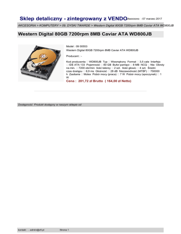 Sklep detaliczny - zintegrowany z VENDOUtworzono : 07 marzec 2017 AKCESORIA > KOMPUTERY > 09. DYSKI TWARDE > Western Digital 80GB 7200rpm 8MB Caviar ATA WD800JB Western Digital 80GB 7200rpm 8MB Caviar ATA WD800JB Model : 09 00553 Western Digital 80GB 7200rpm 8MB Caviar ATA WD800JB Producent : Kod producenta WD800JB Typ Wewnętrzny Format 3,5 cale Interfejs IDE ATA 133 Pojemność 80 GB Bufor pamięci 8 MB NCQ Nie Obroty na min. 7200 obr/min Ilość talerzy 2 szt. Ilość głowic 4 szt. Średni czas dostępu 8,9 ms Głośność 28 dB Niezawodność (MTBF) 750000 h Zasilanie Molex Pobór mocy (praca) 7 W Pobór mocy (spoczynek) 1 W Cena : 201,72 zł Brutto ( 164,00 zł Netto) Dostępność: Produkt dostępny w naszym sklepie od kontakt : - [email protected] Strona 1