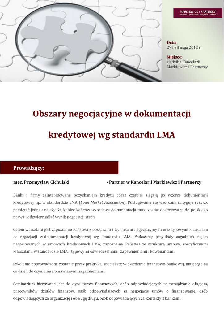 Data: 27 i 28 maja 2013 r. Miejsce: siedziba Kancelarii Markiewicz i Partnerzy Obszary negocjacyjne w dokumentacji kredytowej wg standardu LMA Prowadzący: mec. Przemysław Cichulski - Partner w Kancelarii Markiewicz i Partnerzy Banki i firmy zainteresowane pozyskaniem kredytu coraz częściej sięgają po wzorce dokumentacji kredytowej, np. w standardzie LMA (Loan Market Association). Posługiwanie się wzorcami mityguje ryzyko, pamiętać jednak należy, że koniec końców wzorcowa dokumentacja musi zostać dostosowana do polskiego prawa i odzwierciedlać wynik negocjacji stron. Celem warsztatu jest zapoznanie Państwa z obszarami i technikami negocjacyjnymi oraz typowymi klauzulami do negocjacji w dokumentacji kredytowej wg standardu LMA. Wskażemy przykłady zagadnień często negocjowanych w umowach kredytowych LMA, zapoznamy Państwa ze strukturą umowy, specyficznymi klauzulami w standardzie LMA, , typowymi oświadczeniami, zapewnieniami i kowenantami. Szkolenie poprowadzone zostanie przez praktyka, specjalistę w dziedzinie finansowo-bankowej, mającego na co dzień do czynienia z omawianymi zagadnieniami. Seminarium kierowane jest do dyrektorów finansowych, osób odpowiadających za zarządzanie długiem, pracowników działów finansów, osób odpowiadających za negocjacje umów o finansowanie, osób odpowiadających za organizację i obsługę długu, osób odpowiadających za kontakty z bankami. Al. Ujazdowskie 51 Dom Dochodowy, VI p. 00-536 Warszawa Tel. +48-22 584 7400 Faks +48-22 584 7401 E-mail [email protected] Przemysław Cichulski Radca prawny, specjalizującym Partner się W latach Markiewicz i Partnerzy kierujący w praktyce zespołem finansowo-bankowej. 2002-2008 Kancelaria została założona w 2004 roku przez pięciu partnerów pragnących realizować własną wizję współpracował doradztwa, w której najważniejszy byłby bezpośredni największych kontakt z klientem oraz jego indywidualne potrzeby. międzynarodowych kancelarii, gdzie był szefem zespołu Kancelaria działała pod firmą Rymar i Partnerzy do 2011 finansowo-bankowego. Poprzednio in-house w Raiffeisen roku, kiedy to mec. Stanisław Rymar został wybrany na Bank Polska S.A. specjalizujący się w obszarze SME i retail stanowisko sędziego Trybunału Konstytucyjnego. W banking. następstwie powyższego kancelaria zmieniła nazwę na z PricewaterhouseCoopers i jedną z Markiewicz i Partnerzy Adwokaci i Radcowie Prawni Jest uznanym specjalistą z ponad 10-letnią praktyką spółka partnerska. w zakresie prawa finansowego i korporacyjnego. Posiada rozległe doświadczenie w międzynarodowych Obecnie tworzymy grupę dwudziestu transakcjach finansowych, włączając w to transakcje typu doświadczonych project transakcje zespołów transakcje i adwokatów. Wykonujemy swoją pracę z poświęceniem i transakcje i pasją, oferując naszym klientom wysoki standard obsługi. w zakresie praktyki rynków kapitałowych. Doświadczony W naszym zespole znajdują się specjaliści o ugruntowanej w zakresie otwieraniu pozycji na rynku prawniczym, którzy posiadają długoletnie działalności w Polsce przez zagraniczne banki, jak również doświadczenie w wiodących polskich i międzynarodowych reprezentowania firmach prawniczych, instytucjach finansowych oraz finance, leveraged z wykorzystaniem finance, derywatów, restrukturyzacyjne, nabycia doradztwa banków prawnego instytucji przy finansowych krajowych i zagranicznych w postępowaniach przed regulatorem. prawników, ponad kierowanych spółkach przez giełdowych. przygotowaniu możemy działających w ramach radców Dzięki ich prawnych fachowemu świadczyć wysokiej jakości Posiada rozległe doświadczenie w doradztwie prawnym pomoc prawną, zarówno na rzecz Klientów polskich, jak odnośnie i zagranicznych, prowadząc również obsługę w języku struktur poolingowych, finansowania, cash leasingu, struktur management, w tym cash pozabilansowych metod zabezpieczeniowych i handlu wierzytelnościami przeterminowanymi. angielskim, francuskim oraz niemieckim. Łączymy doświadczenie globalnej współpracy ze znajomością polskiego rynku. Sukces naszej kancelarii zawdzięczamy przede wszystkim dobremu zrozumieniu specyfiki działalności naszych Klientów, ich celów i potrzeb biznesowych. Pozwala nam to na aktywne uczestniczenie w budowaniu strategii działań i koncepcji biznesowych Klienta już na początkowym etapie. MARKIEWICZ I PARTNERZY ADWOKACI I RADCOWIE PRAWNI SPÓŁKA PARTNERSKA NIP: 7010182710, REGON: 141757745, KRS 0000324766, Sąd Rejonowy dla m. st. Warszawy, www.mplaw.pl Al. Ujazdowskie 51 Dom Dochodowy, VI p. 00-536 Warszawa Tel. +48-22 584 7400 Faks +48-22 584 7401 E-mail [email protected] Zakres szkolenia I. Zagadnienia negocjacyjne i procesy nawiązywania kompromisu na linii kredytobiorca-kredytodawca 1. Rola dokumentacji kredytowej z perspektywy kredytodawcy. 2. Czynniki wyznaczające strategię negocjacyjną. II. Analiza obszarów i klauzul do negocjacji w ramach konstrukcji umowy kredytu według standardu LMA 1. Definicje - funkcja i przykłady standardowych definicji 2. Mechanika kredytu (wypłaty, spłaty, dobrowolne spłaty, wcześniejsze obowiązkowe spłaty, odsetki, anulowanie) 3. Oświadczenia – funkcja, konsekwencje prawne dla kredytobiorcy i osób składających oświadczenia przy składaniu nieprawdziwych oświadczeń 4. Zobowiązania ogólne (do działania i zaniechania (negative pledge)) 5. Zobowiązania finansowe 6. Zobowiązania informacyjne 7. Przypadki naruszenia – funkcja, konsekwencje prawne w przypadku oświadczenia nieprawdy, konsekwencje prawne w przypadku naruszenia warunków umowy 8. Koszty kredytu (prowizje, koszty zerwanego finansowania, zwiększone koszty, pozostałe koszty) MARKIEWICZ I PARTNERZY ADWOKACI I RADCOWIE PRAWNI SPÓŁKA PARTNERSKA NIP: 7010182710, REGON: 141757745, KRS 0000324766, Sąd Rejonowy dla m. st. Warszawy, www.mplaw.pl FORMULARZ ZGŁOSZENIOWY Obszary negocjacyjne w dokumentacji 