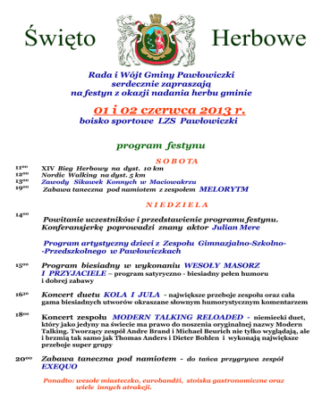 Herbowe Święto Rada i Wójt Gminy Pawłowiczki serdecznie zapraszają na festyn z okazji nadania herbu gminie 01 i 02 czerwca 2013 r. boisko sportowe LZS Pawłowiczki program festynu 1100 1200 1300 1900 S O B O TA XIV Bieg Herbowy na dyst. 10 km Nordic Walking na dyst. 5 km Zawody Sikawek Konnych w Maciowakrzu Zabawa taneczna pod namiotem z zespołem MELORYTM NIEDZIELA 1400 Powitanie uczestników i przedstawienie programu festynu. Konferansjerkę poprowadzi znany aktor Julian Mere Program artystyczny dzieci z Zespołu Gimnazjalno-Szkolno-Przedszkolnego w Pawłowiczkach 1500 Program biesiadny w wykonaniu WESOŁY MASORZ I PRZYJACIELE – program satyryczno - biesiadny pełen humoru i dobrej zabawy 1630 Koncert duetu KOLA I JULA - największe przeboje zespołu oraz cała gama biesiadnych utworów okraszane słownym humorystycznym komentarzem 1800 Koncert zespołu MODERN TALKING RELOADED - niemiecki duet, który jako jedyny na świecie ma prawo do noszenia oryginalnej nazwy Modern Talking. Tworzący zespół Andre Brand i Michael Beurich nie tylko wyglądają, ale i brzmią tak samo jak Thomas Anders i Dieter Bohlen i wykonają największe przeboje super grupy 2000 Zabawa taneczna pod namiotem - do tańca przygrywa zespół EXEQUO Ponadto: wesołe miasteczko, eurobandżi, stoiska gastronomiczne oraz wiele innych atrakcji.